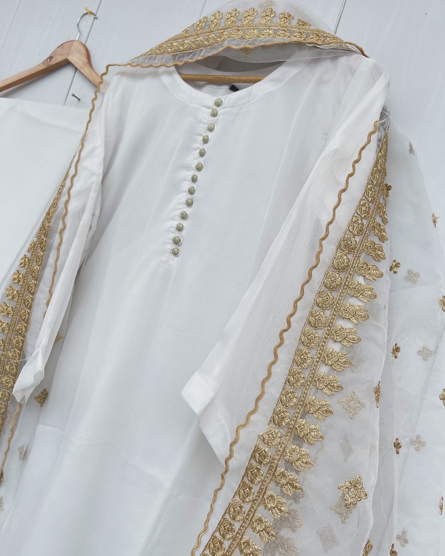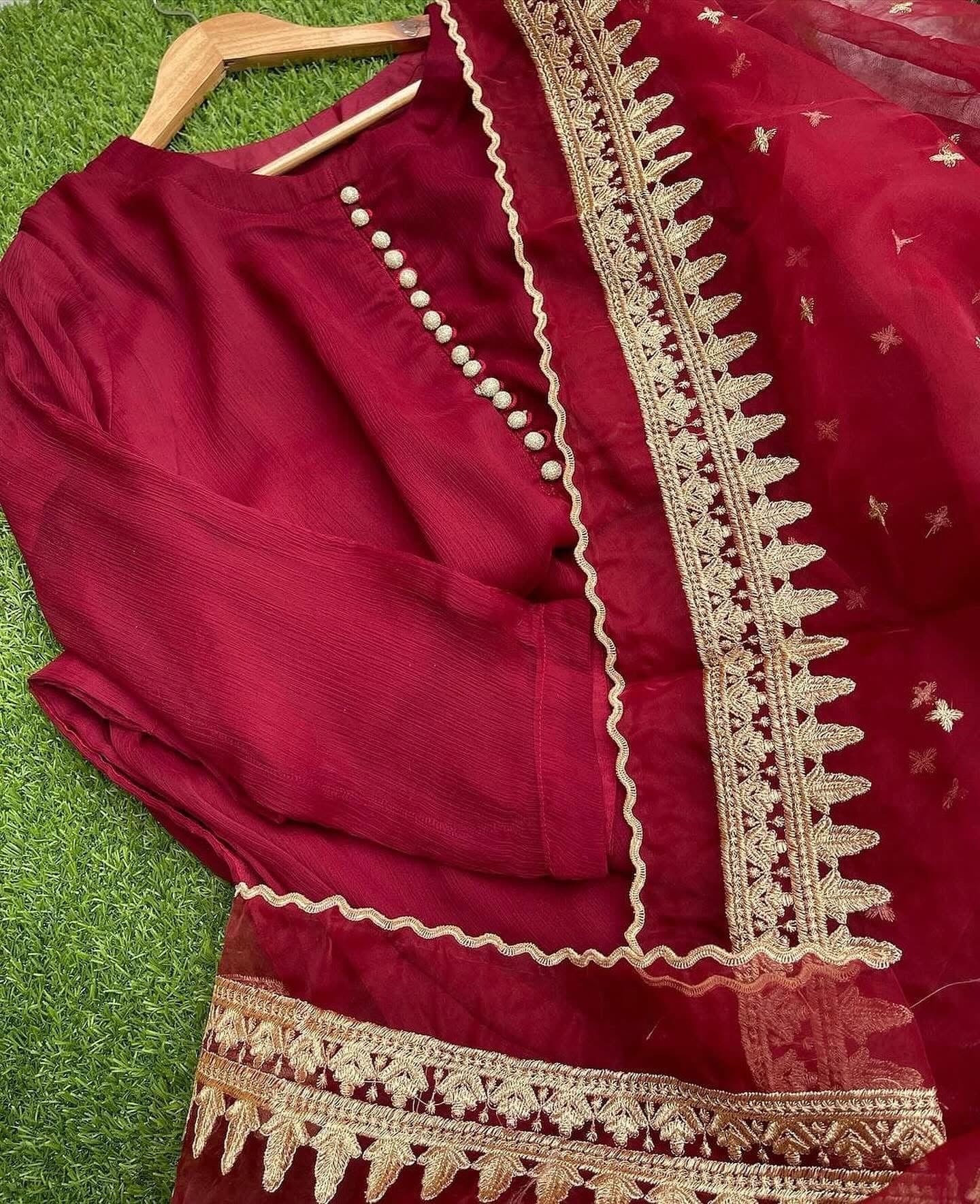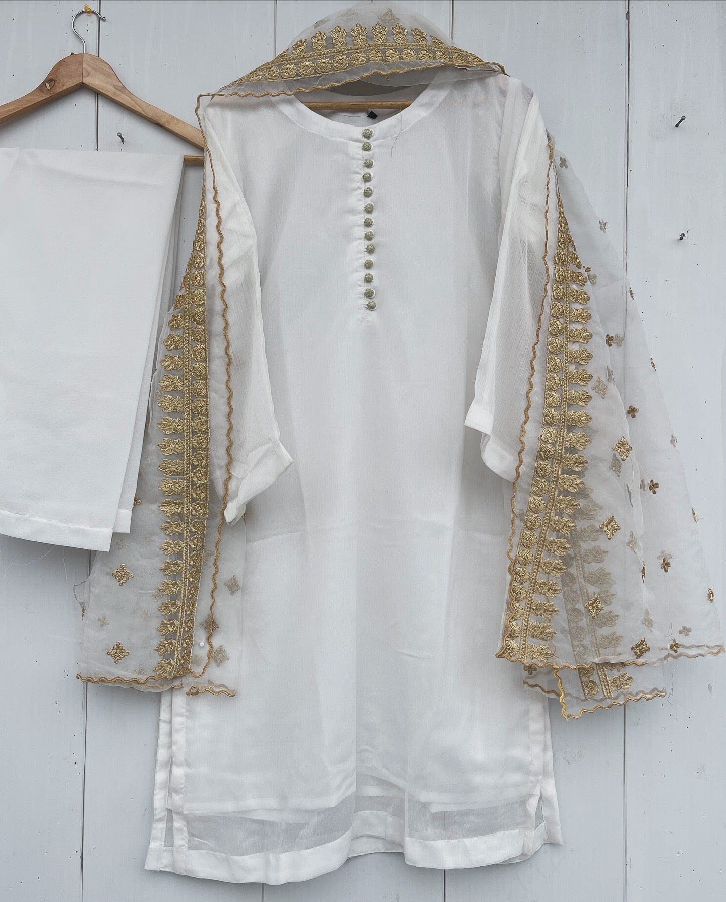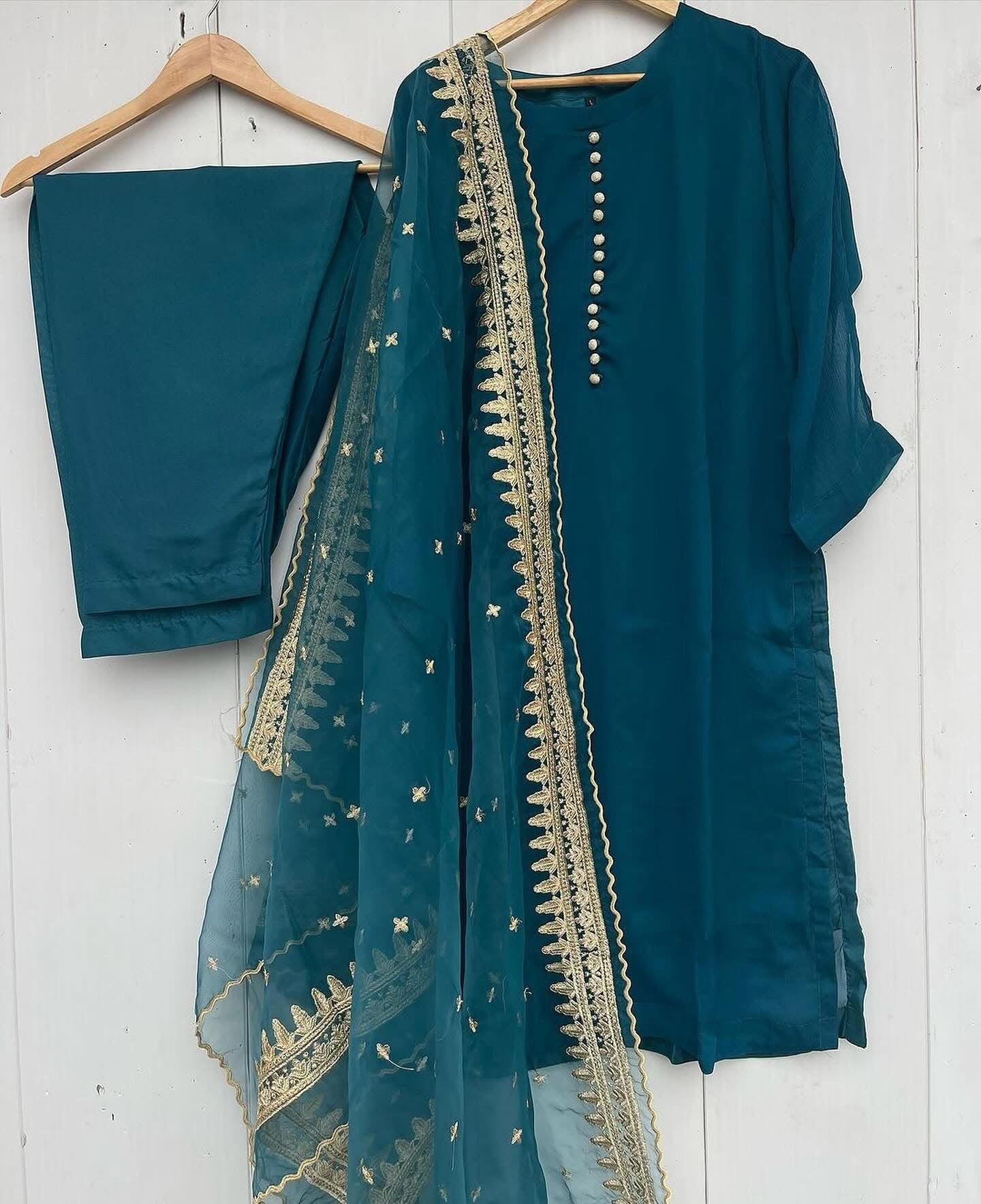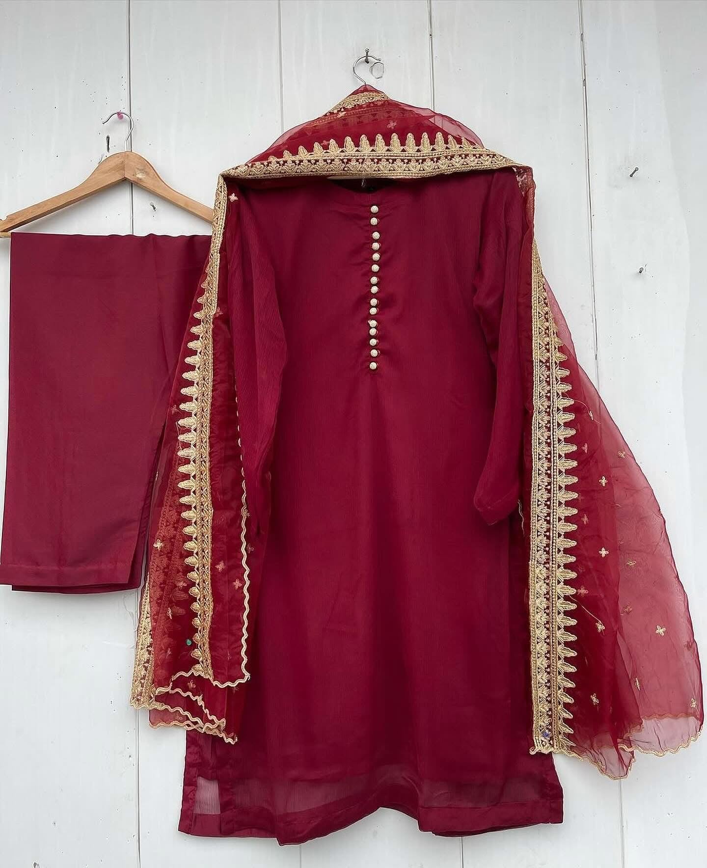 As a formal wear dress, our Chiffon 3pc dress offers a polished and elegant look for any special occasion. The long chiffon shirt inner adds a touch of sophistication, while the embroidery organza dupta adds a delicate and intricate detail. Complete the ensemble with the silk trousers for a luxurious and comfortable fit. Perfect for making a statement at your next event.