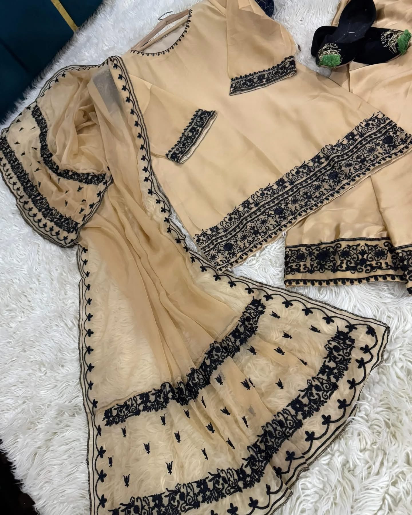 Expertly crafted with luxurious chiffon fabric, the FALAK CHIFFON LUXURY COLLECTION offers a 3-piece set including a silk embroidered bottom, a chiffon shirt, and a chiffon dupatta. With a shirt length of 37 inches and bellbottoms measuring 40 inches, this formal wear boasts classic embroidery for an elegant touch.