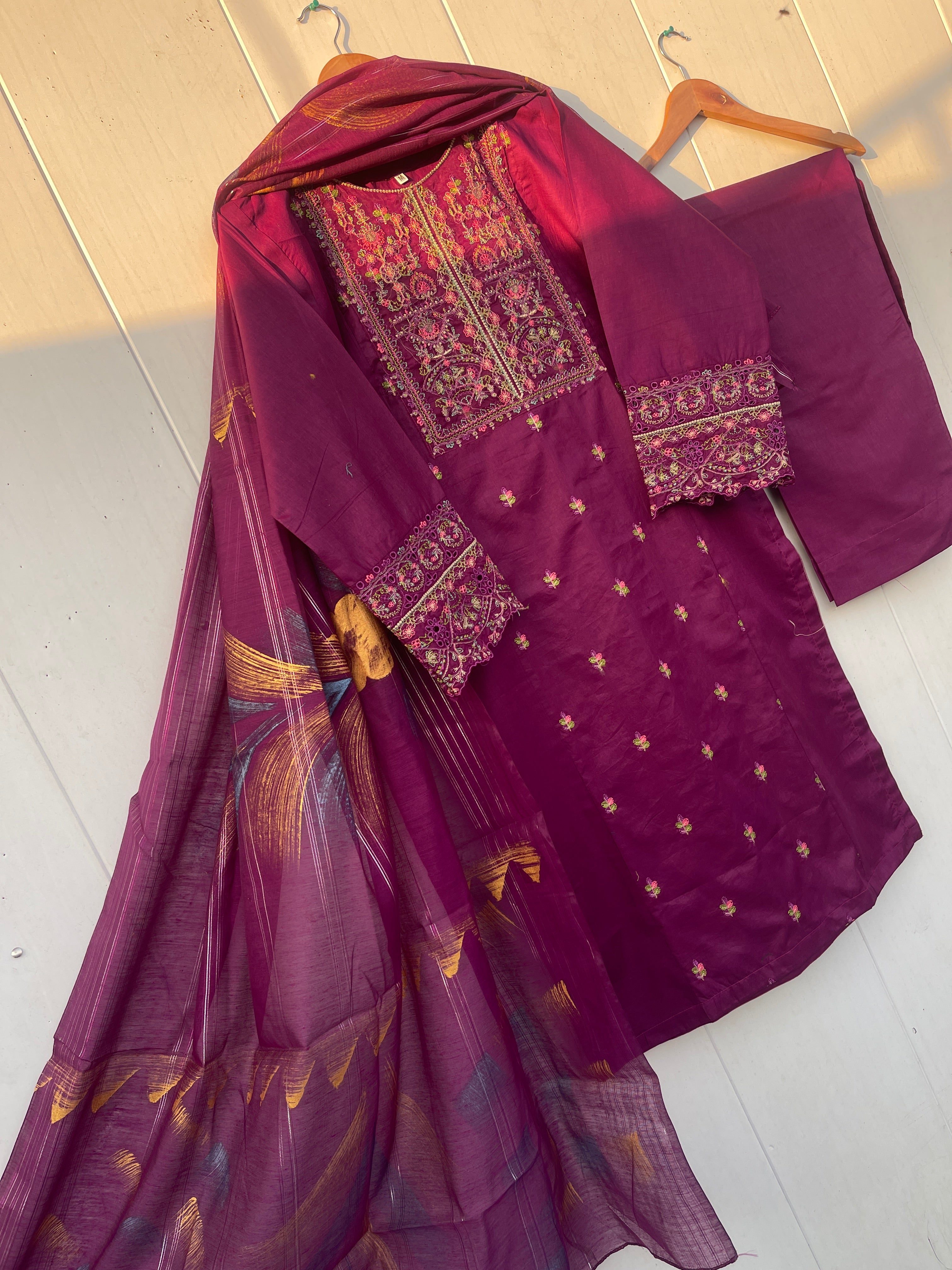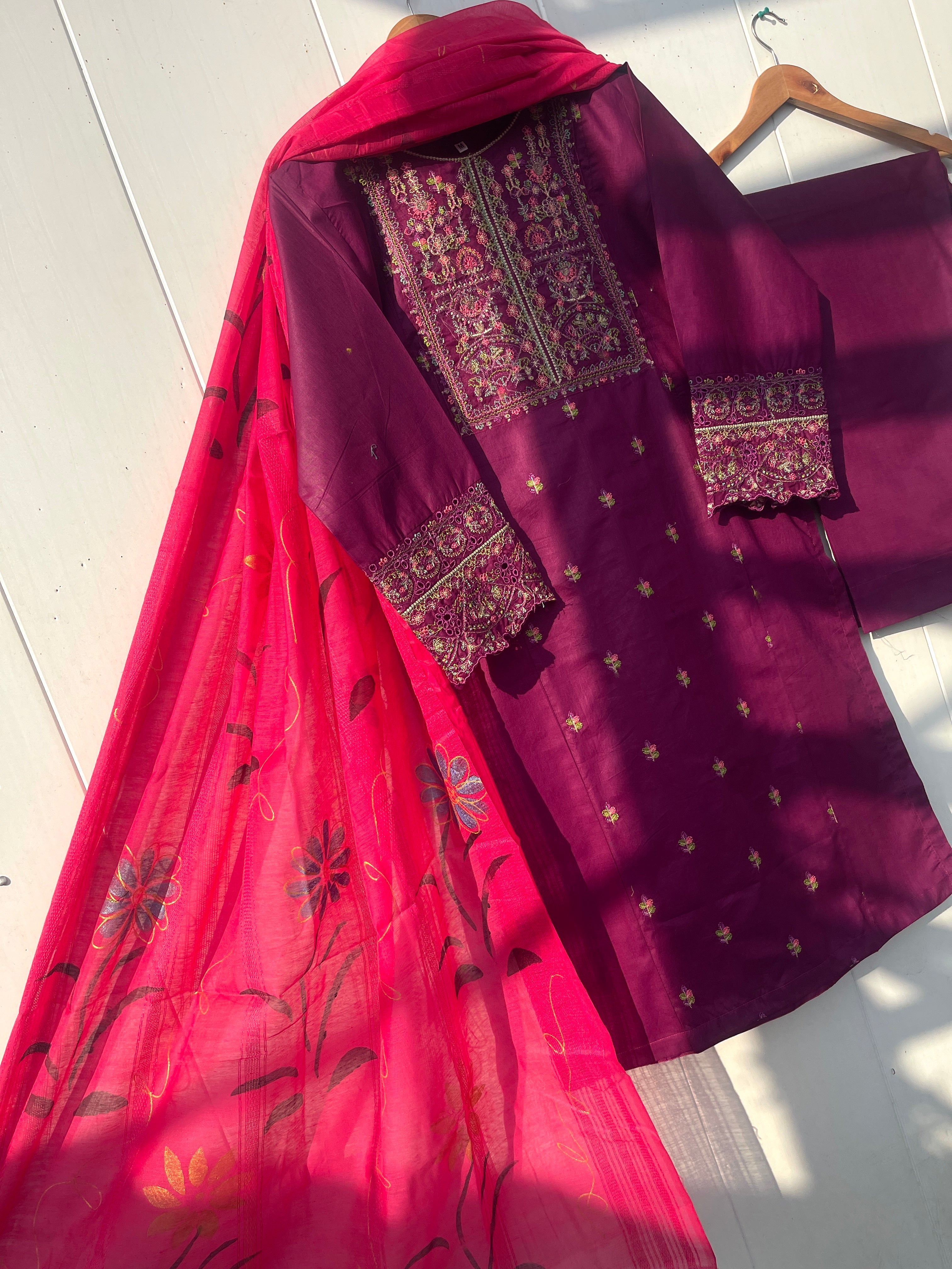 Expertly crafted, the FARASHA LAWN COLLECTION is a true masterpiece. The thread multi colour embroidery on the neckline and sleeves adds a touch of elegance, while the Chikan embroidered plain trouser provides a comfortable fit. And with the hand painted monar lawn dupata, you'll truly stand out in style.