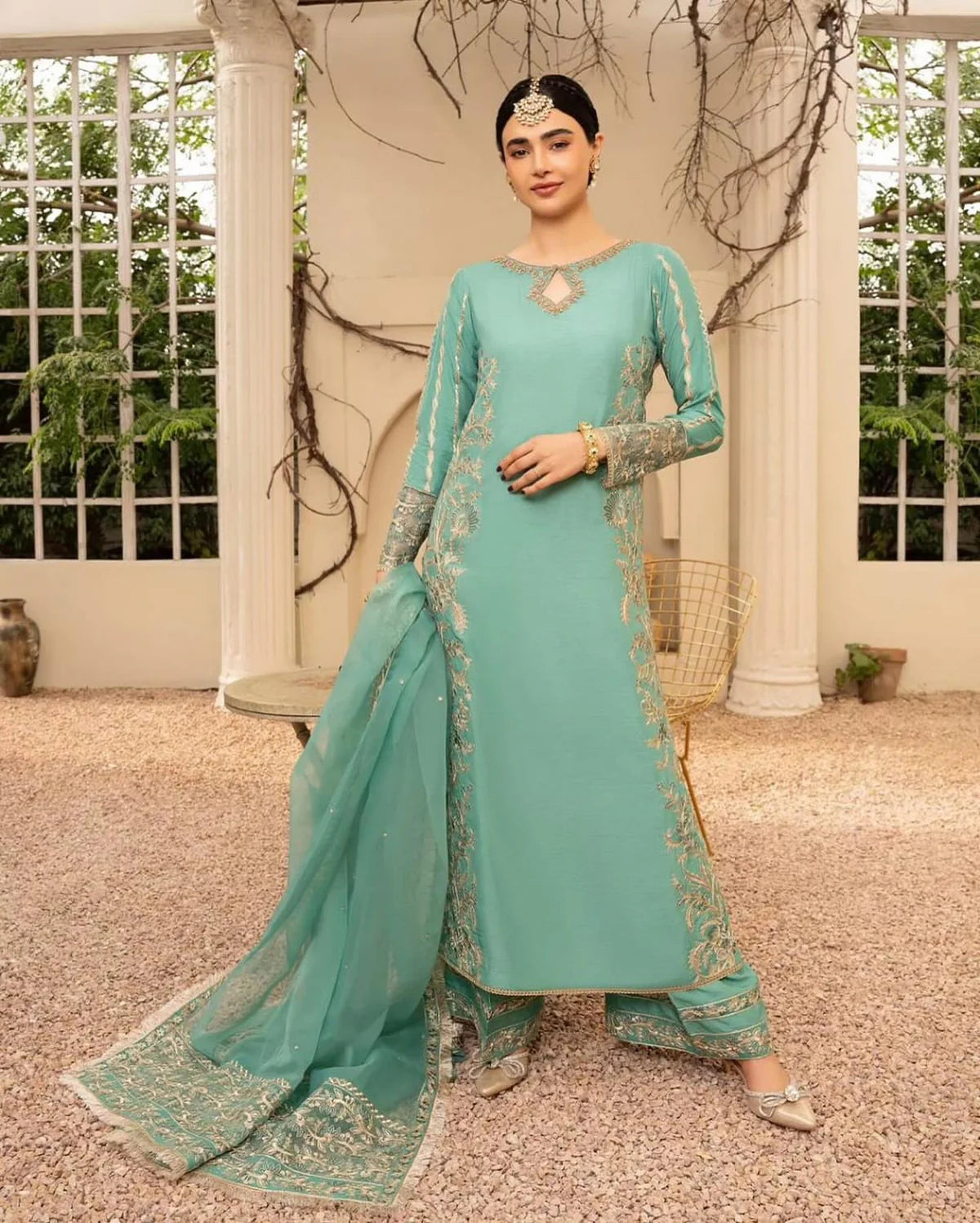 The Festive 3pc Collection features a premium quality Silk 3pc dress, complete with a delicate Organza dupatta. The elegant embroidery on the dupatta, trouser, and shirt adds a touch of sophistication. With a long length and beautiful Kiran laces on all four sides of the border, this collection is perfect for any special occasion.