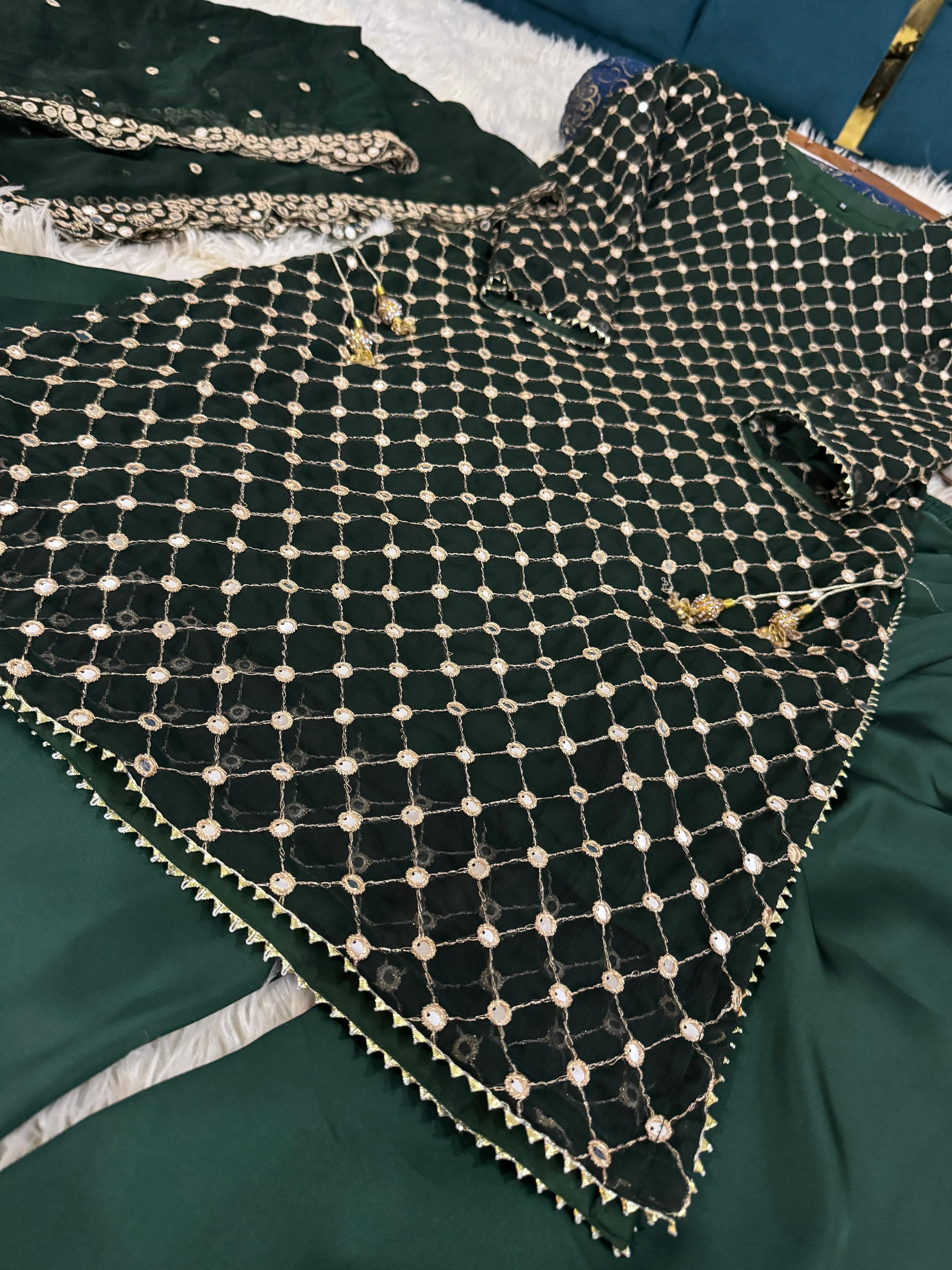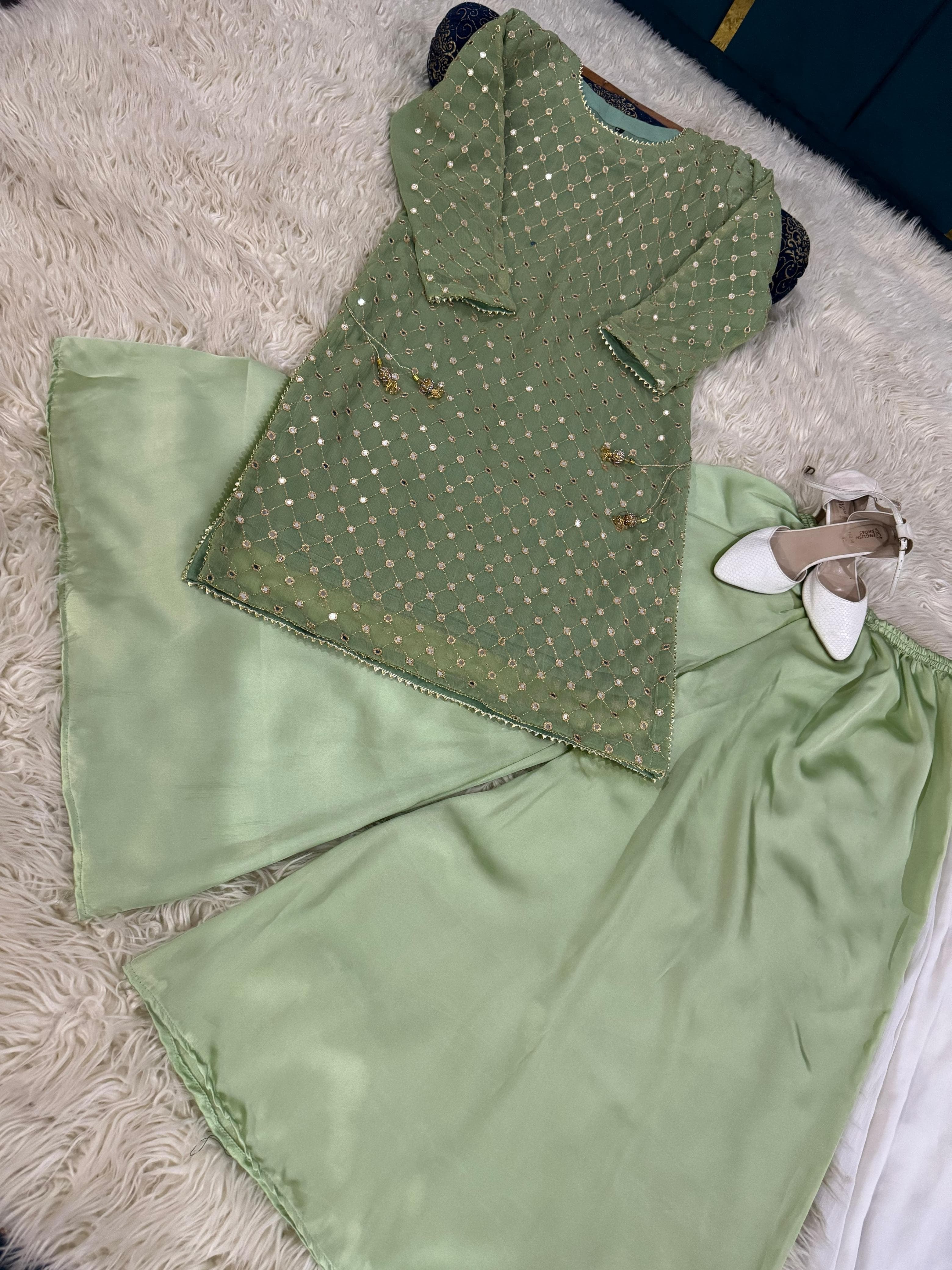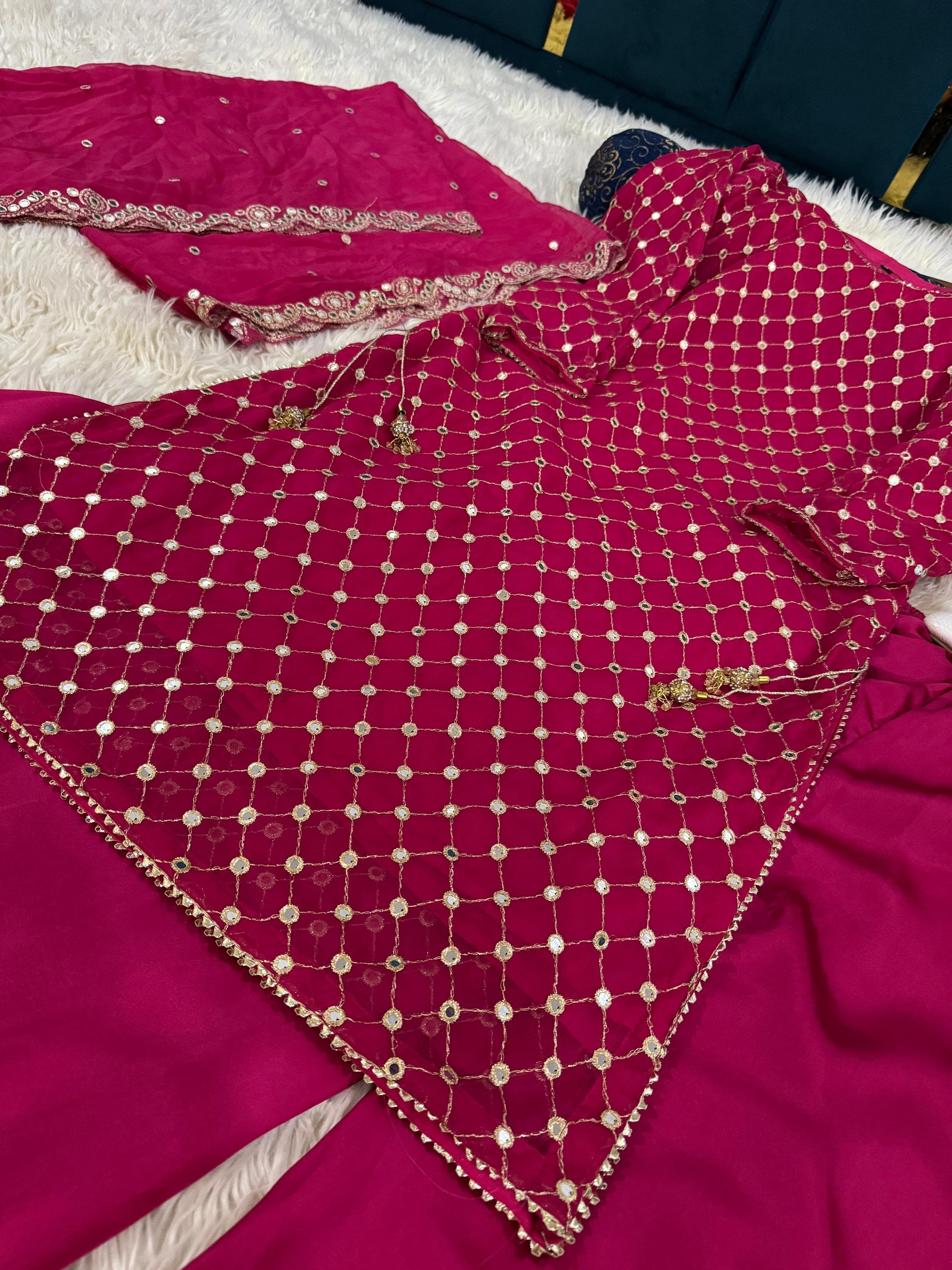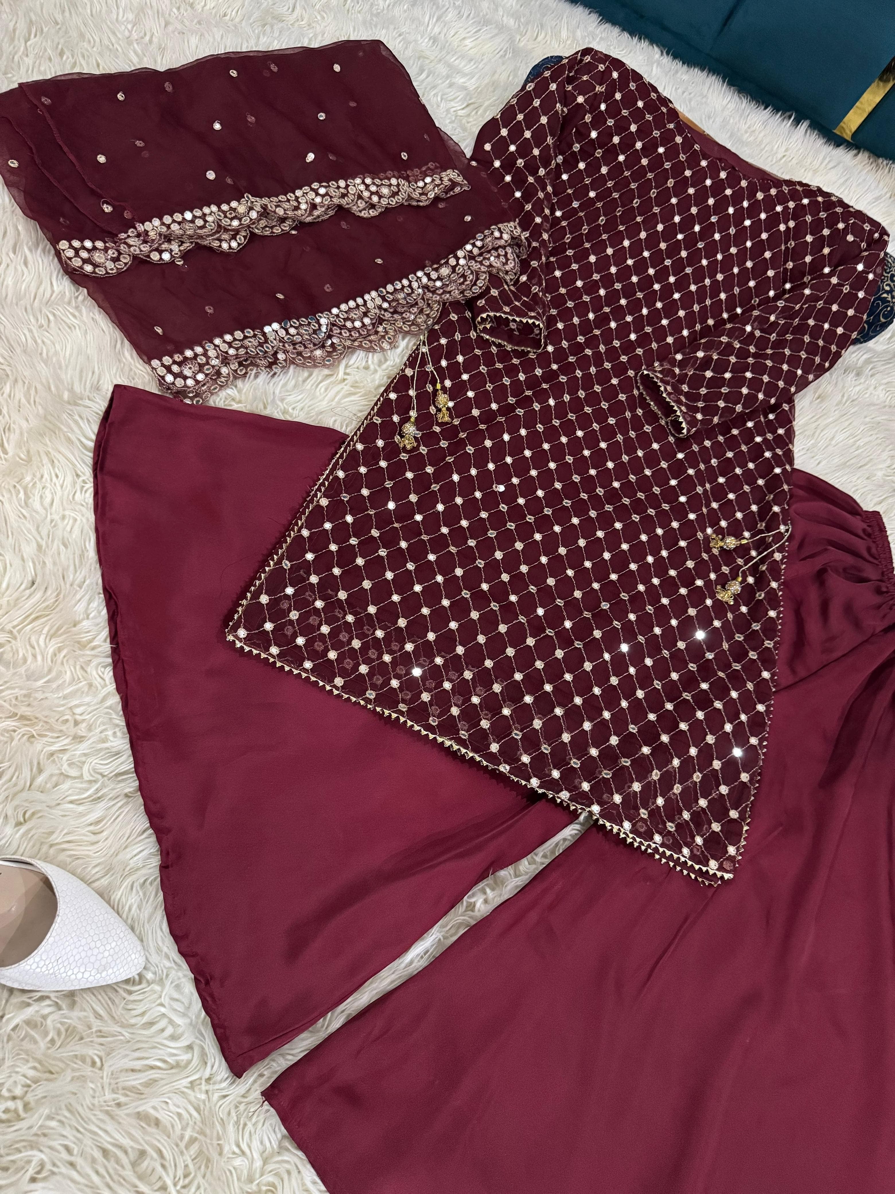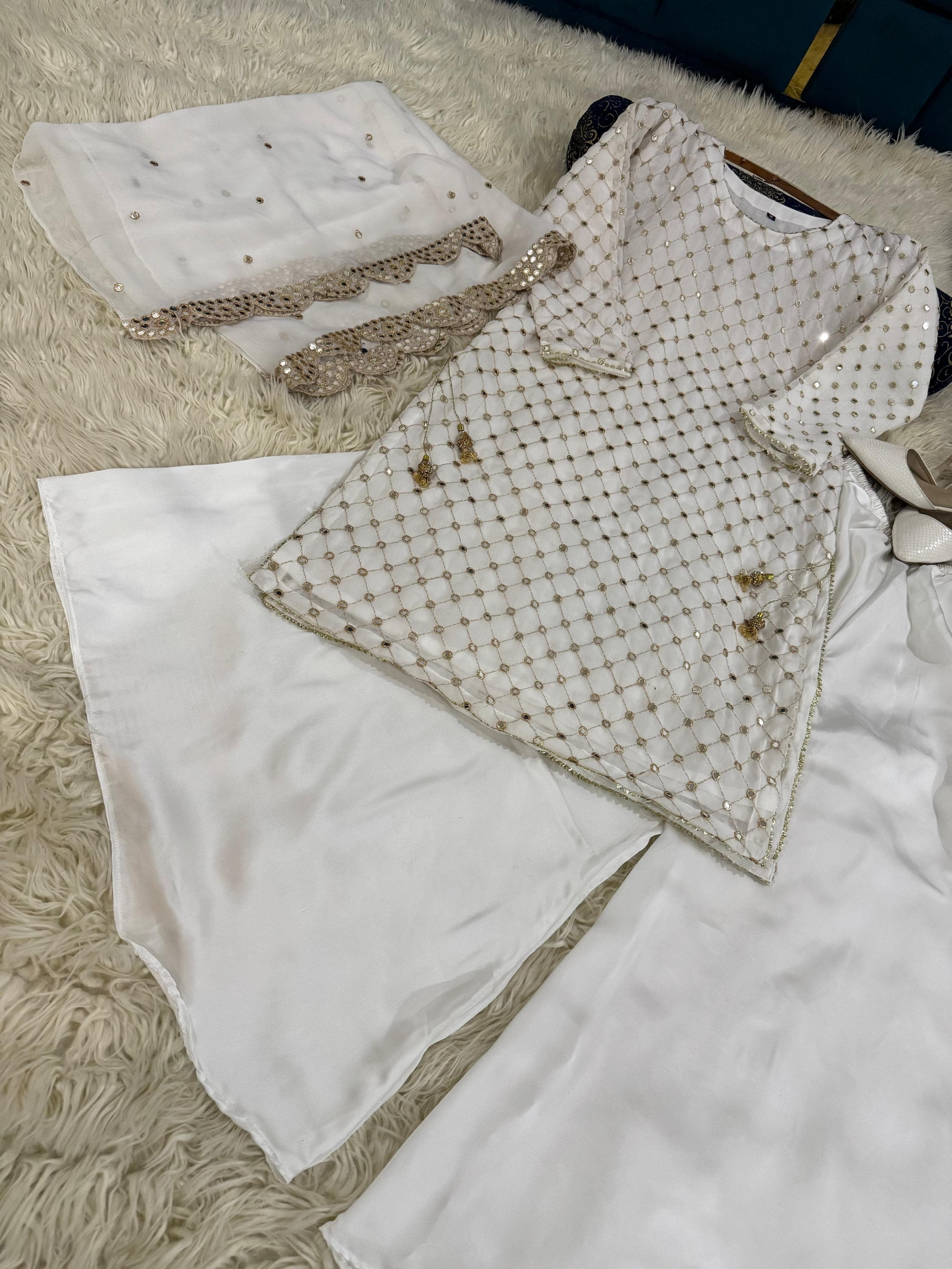 Introducing the Festive Collection - the perfect choice for any celebration. Adorned with exquisite foil me thread embroidery all over, paired with a stylish bell bottom silk and a heavy embroidered dupatta, this collection will elevate your festive look. Made with high-quality chiffon fabric, the shirt also includes a smartwatch for added convenience. Make a statement with this elegant and festive ensemble.
