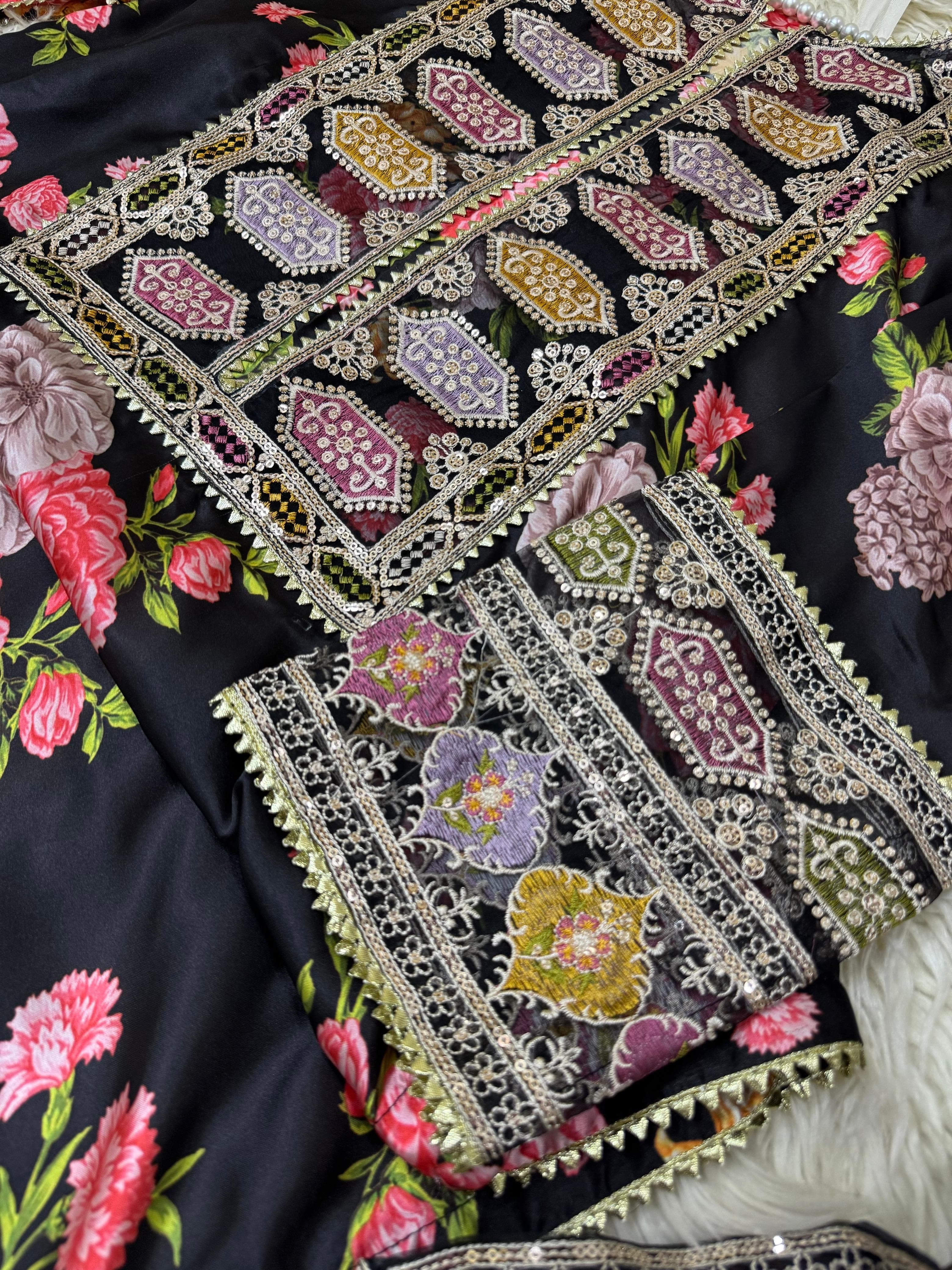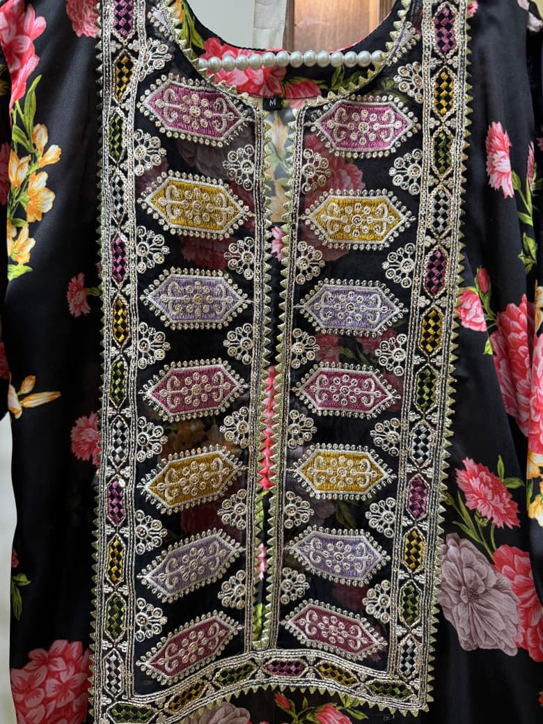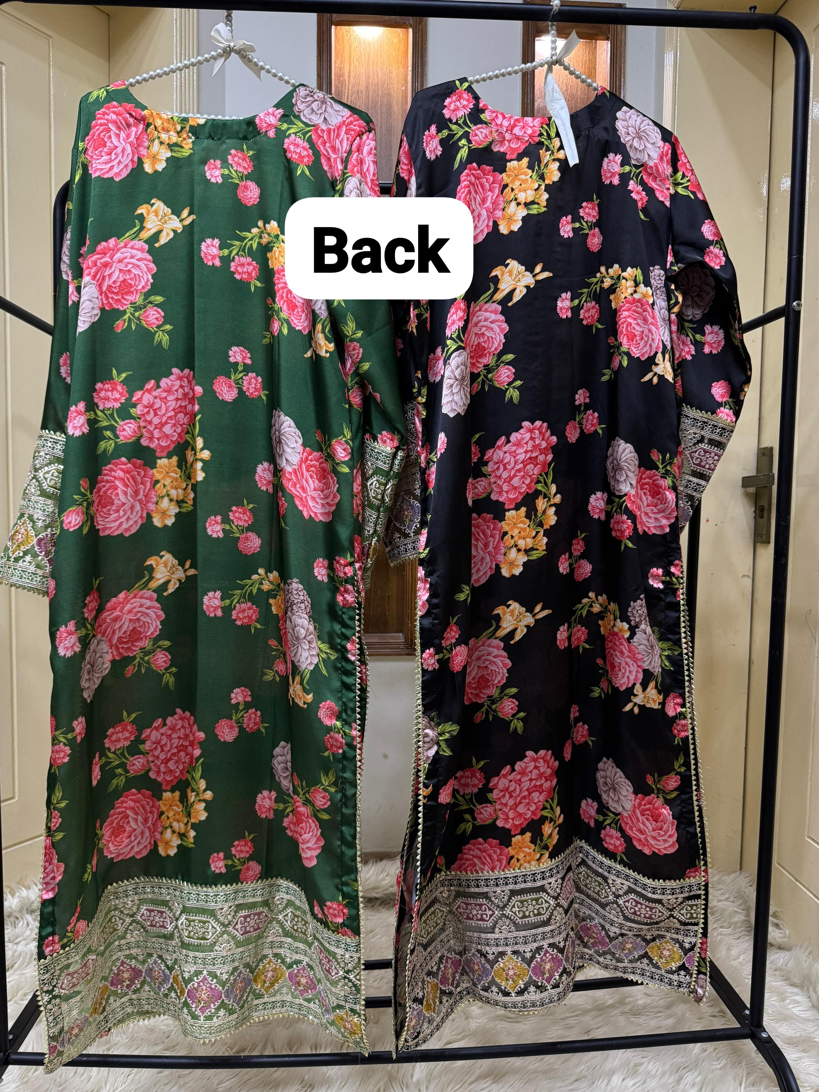 Step into sophistication and elegance with our Formal Silk Shahjehan Collection. This collection features a stunning silk digital printed long shirt, adorned with intricate sequin and thread embroidery on the full neck. The luxurious fabric and delicate Dhanak embroidery on the sleeves will make you stand out. The plain trouser and embroidered dupatta add the finishing touches to this formal collection. With a shirt length of 45-47 inches and a trouser length of 40 inches, this collection exudes style and grace.