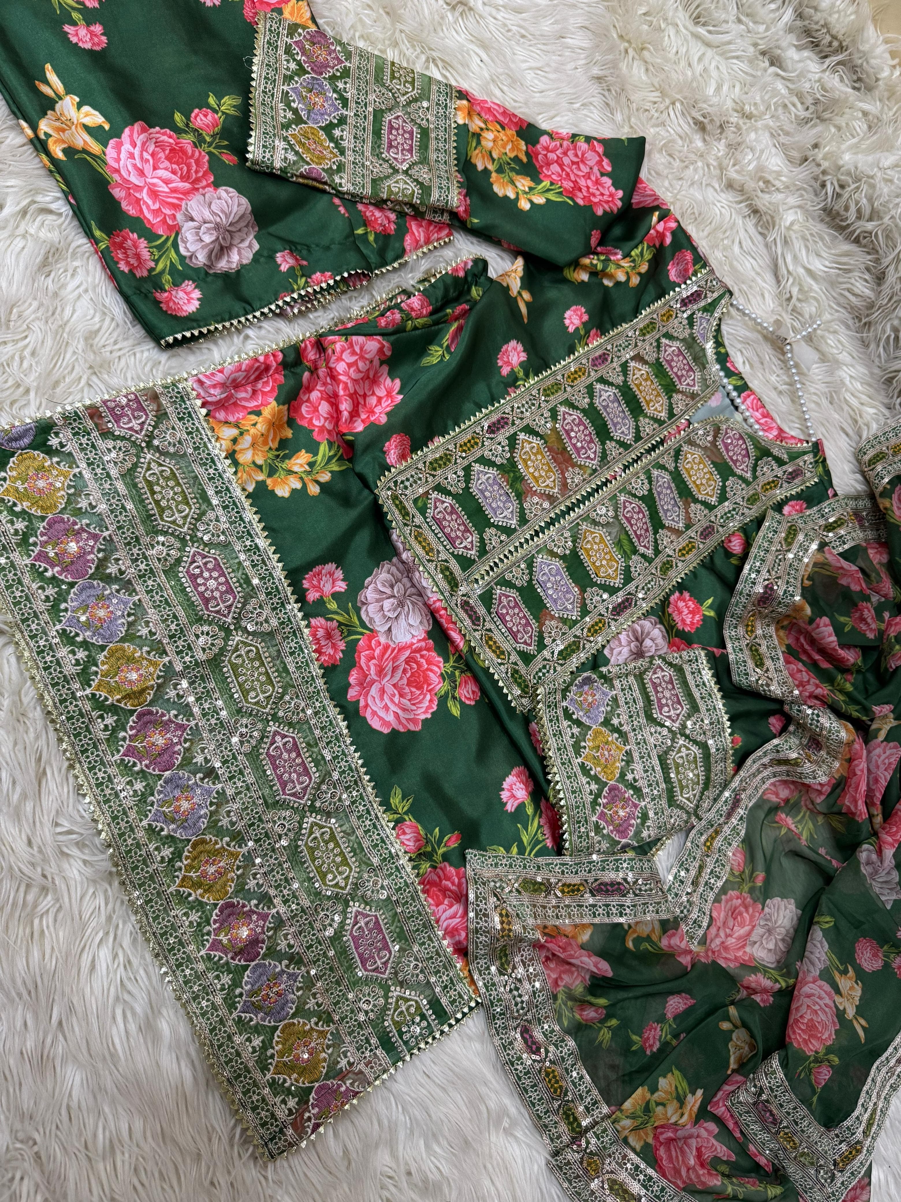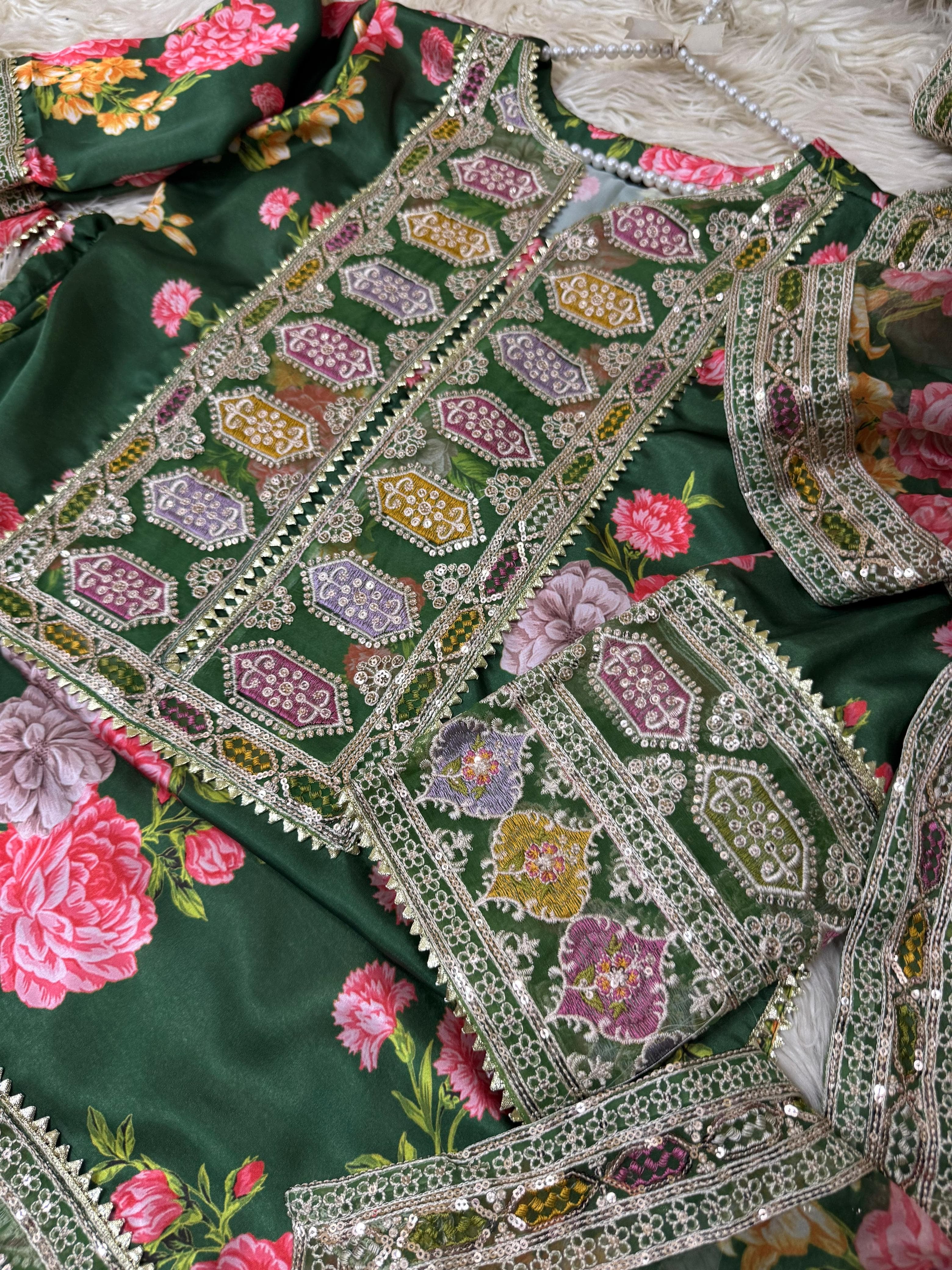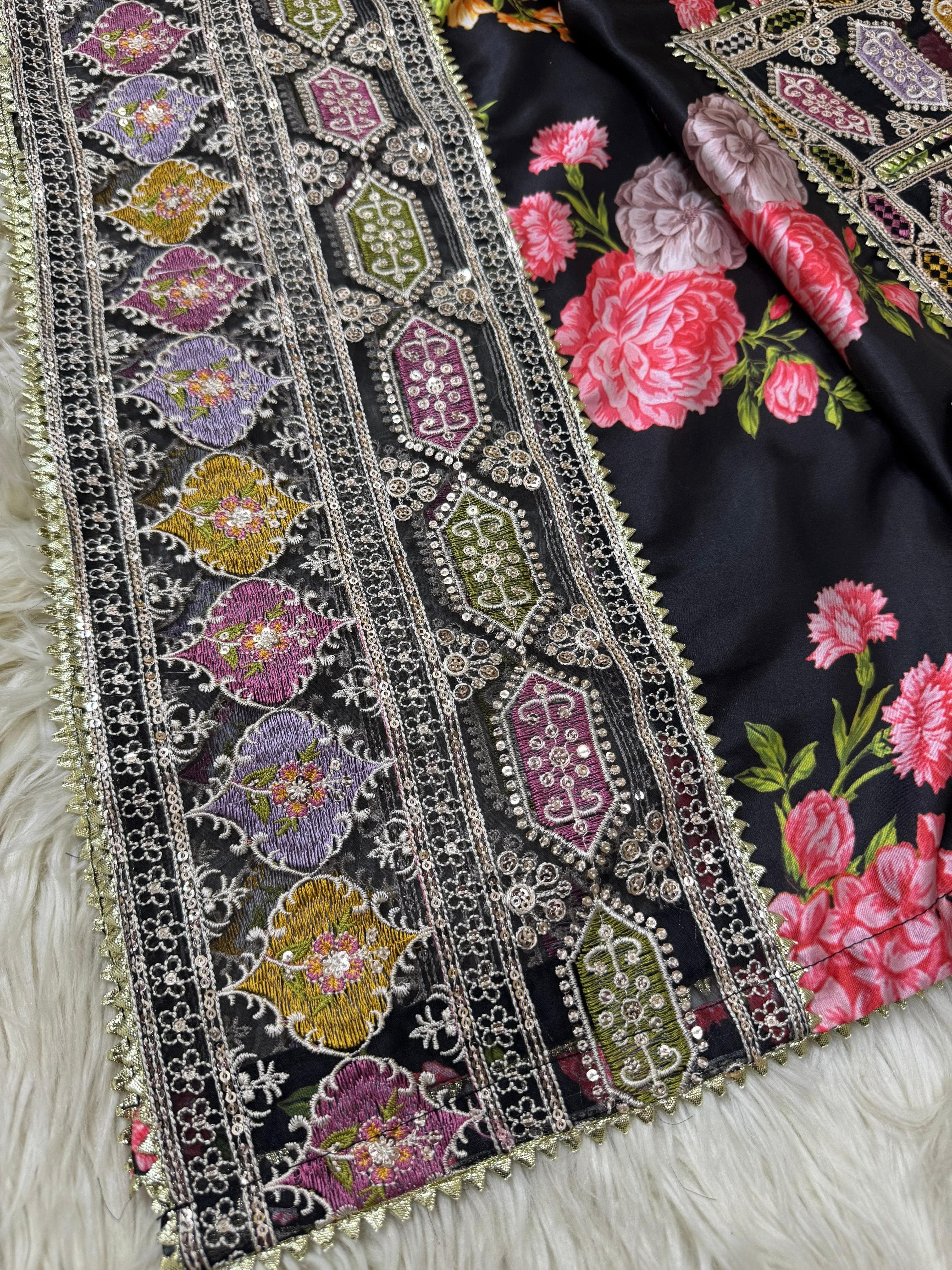 Step into sophistication and elegance with our Formal Silk Shahjehan Collection. This collection features a stunning silk digital printed long shirt, adorned with intricate sequin and thread embroidery on the full neck. The luxurious fabric and delicate Dhanak embroidery on the sleeves will make you stand out. The plain trouser and embroidered dupatta add the finishing touches to this formal collection. With a shirt length of 45-47 inches and a trouser length of 40 inches, this collection exudes style and grace.