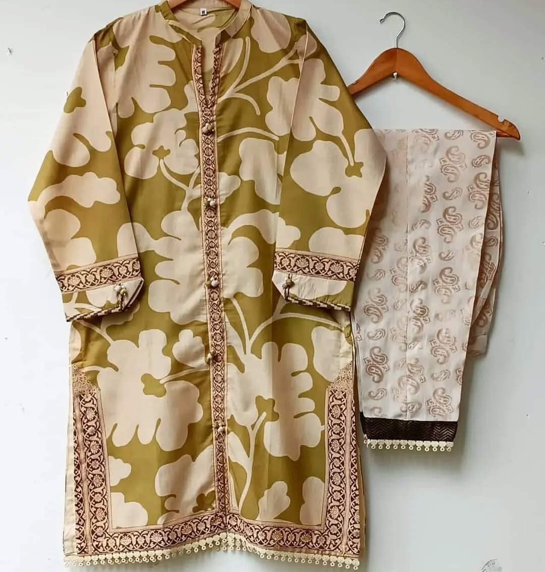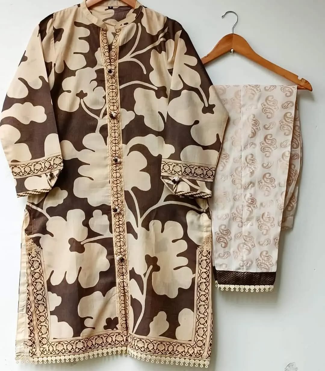 Expertly crafted with jacquard fabric, this lawn dress is a timeless addition to your wardrobe. The front open design and handmade buttons on the sleeves and neckline add a touch of elegance, while the jacquard trouser and tailor stitch offer a perfect fit. Elevate your style with this exquisite piece.
