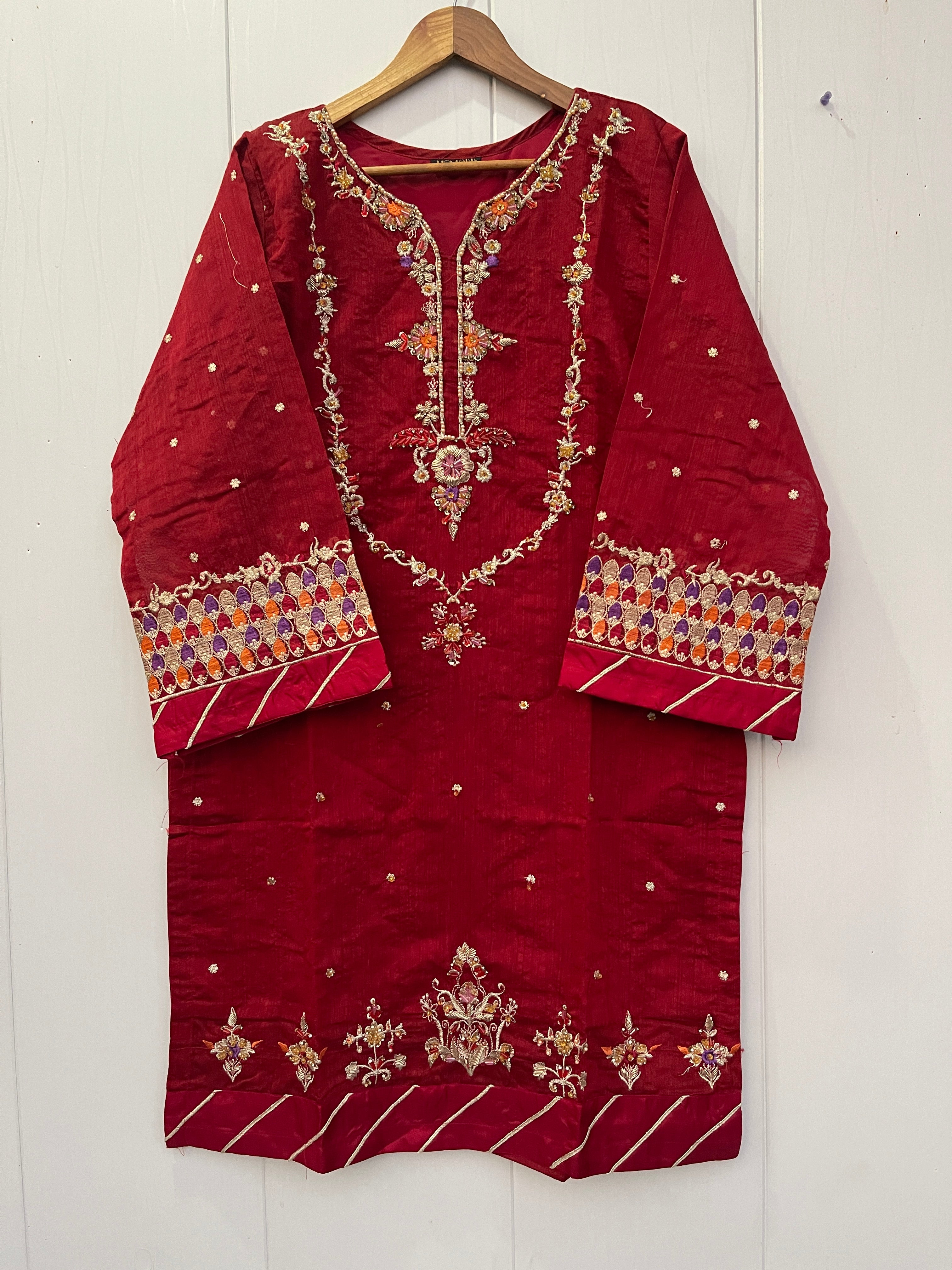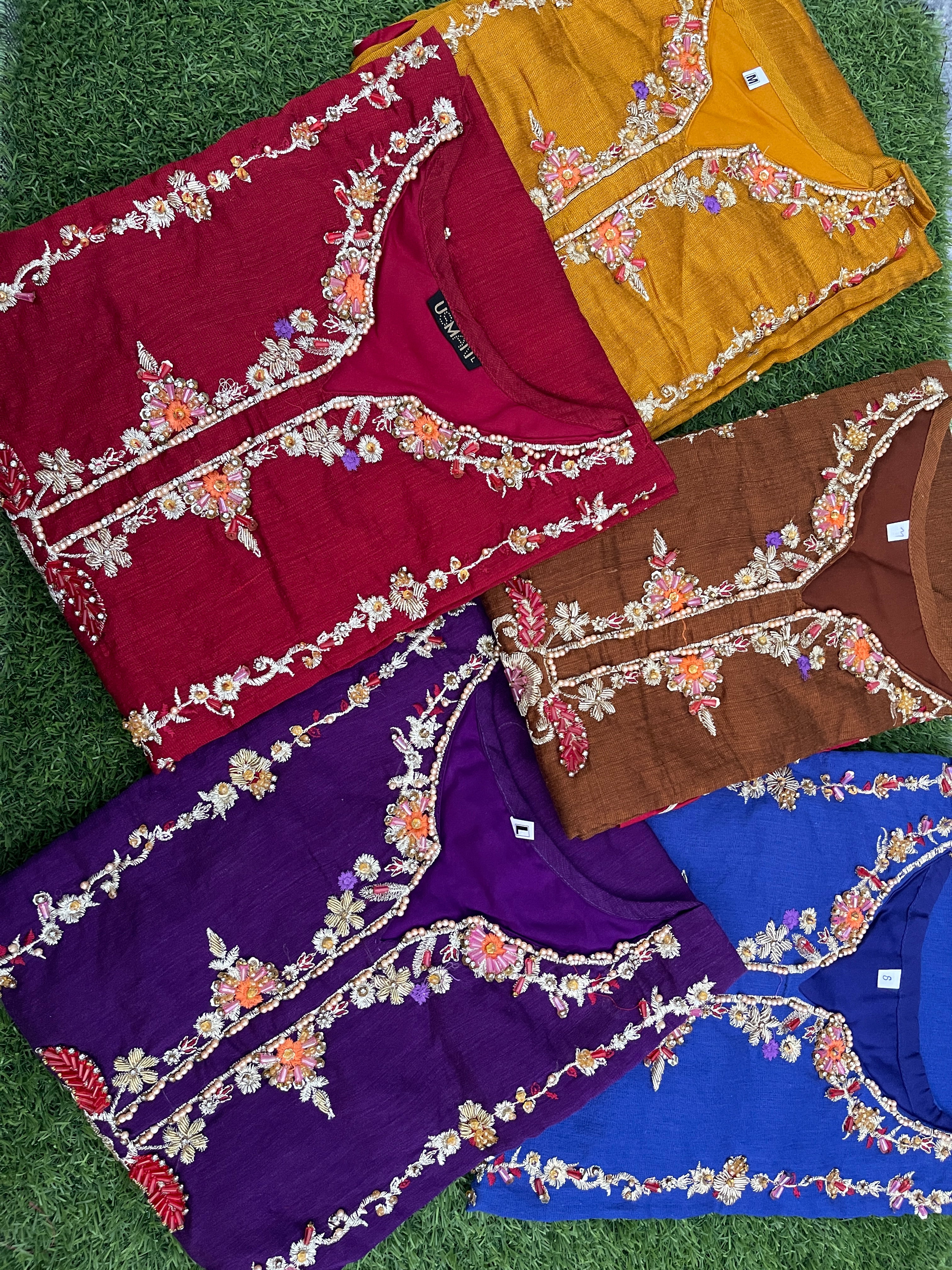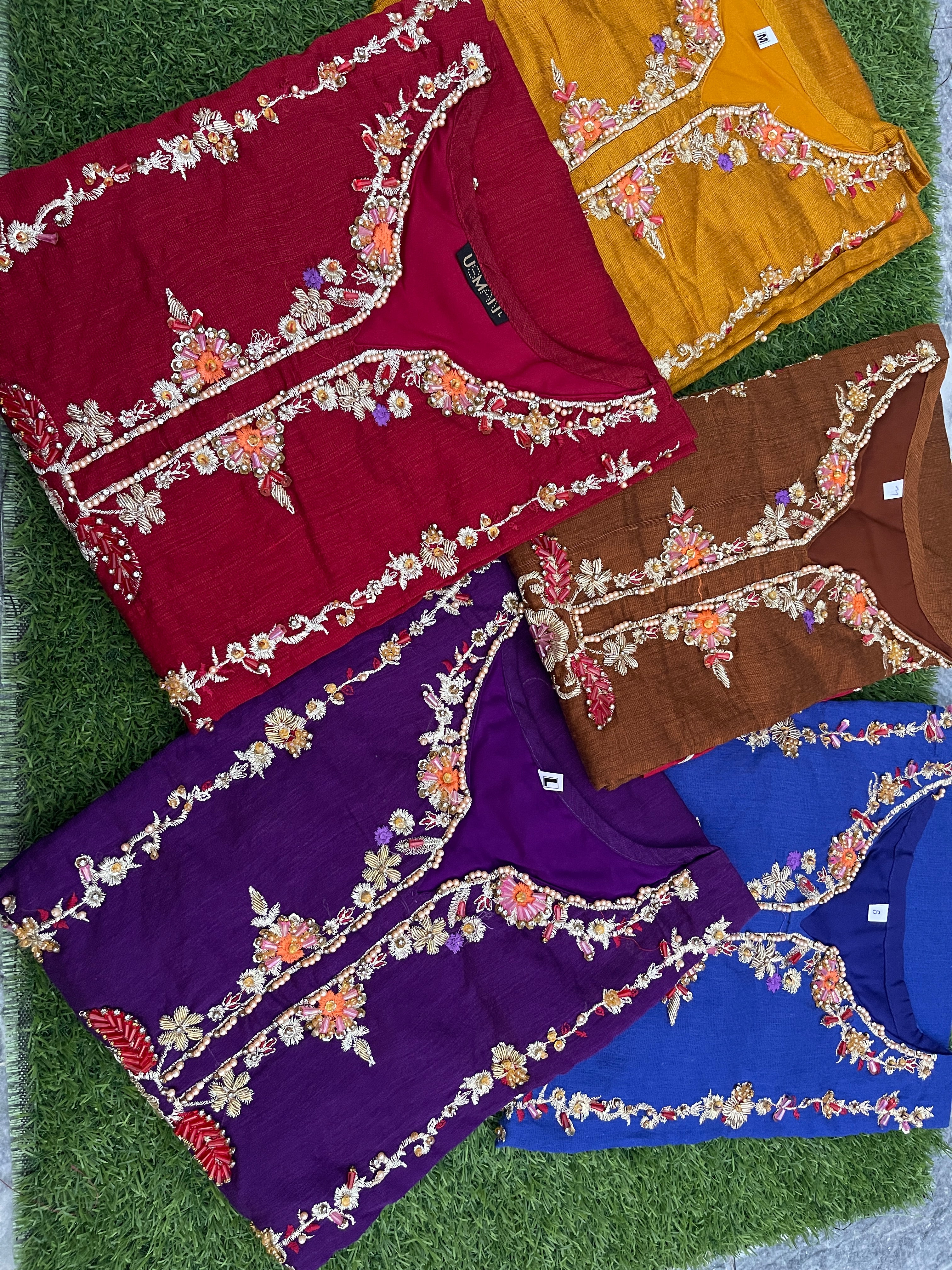 Expertly crafted with kora and dabka hand embroidery on the sleeves and a chatapti embroidered daman to elevate its appearance.