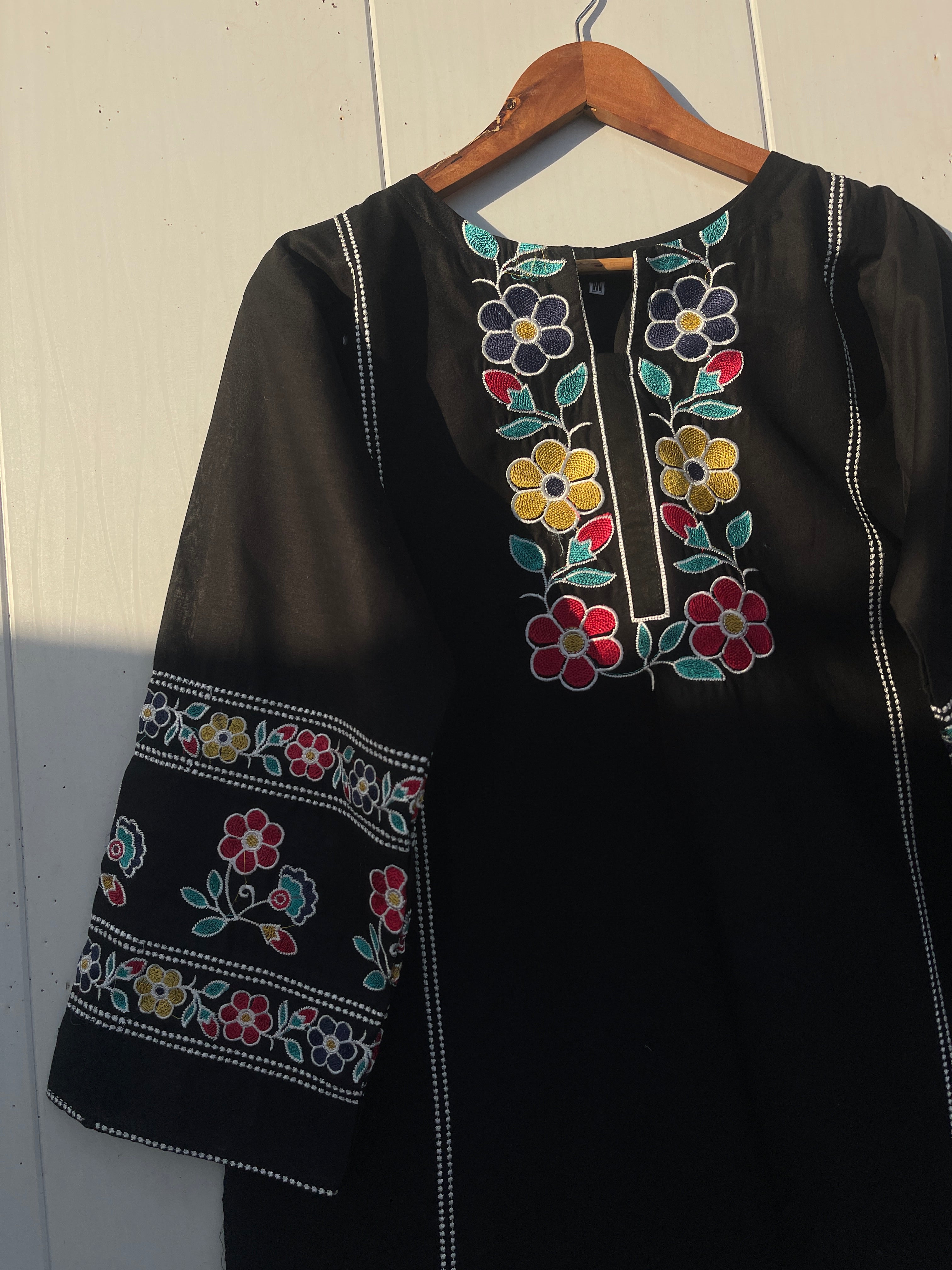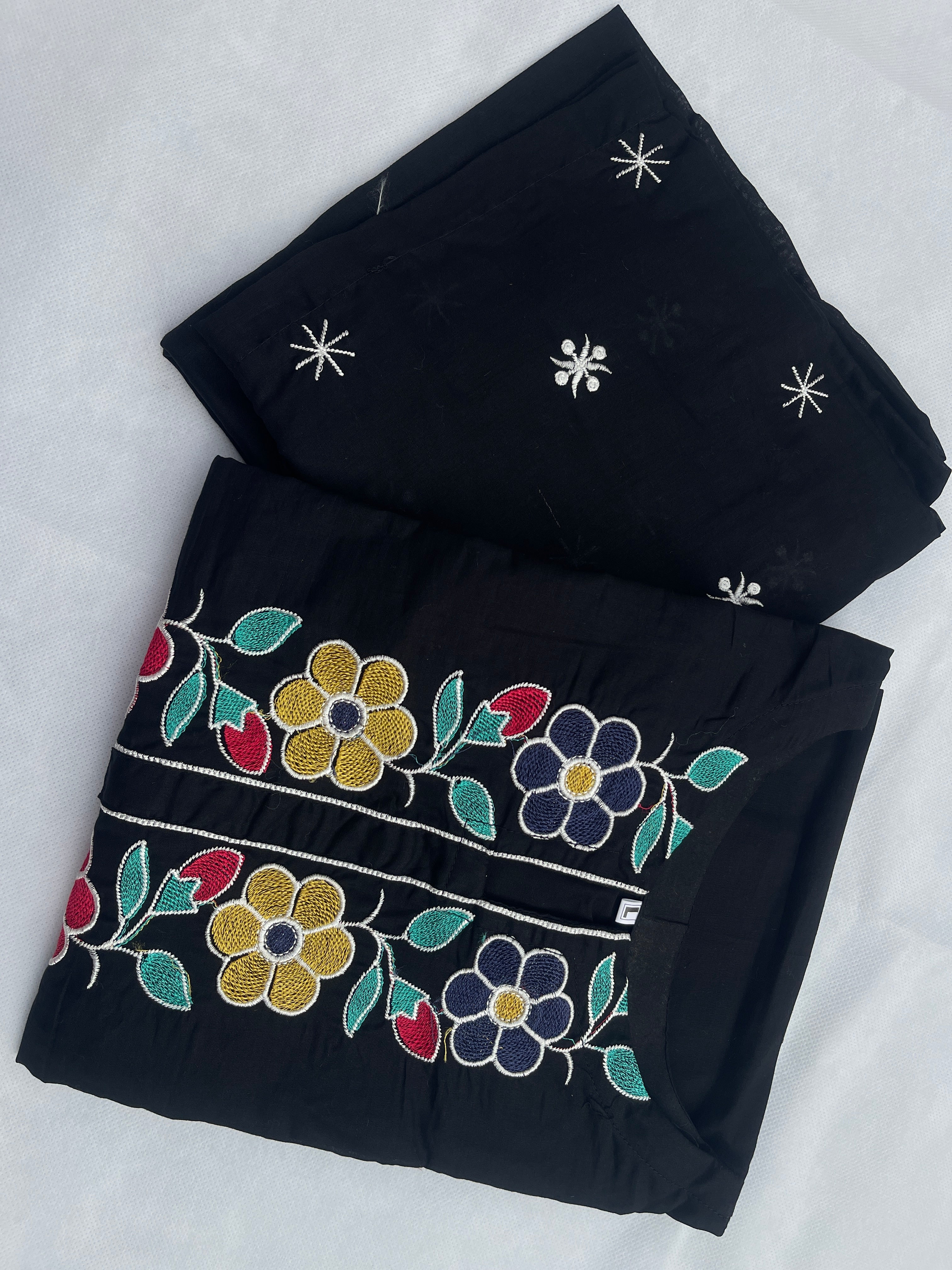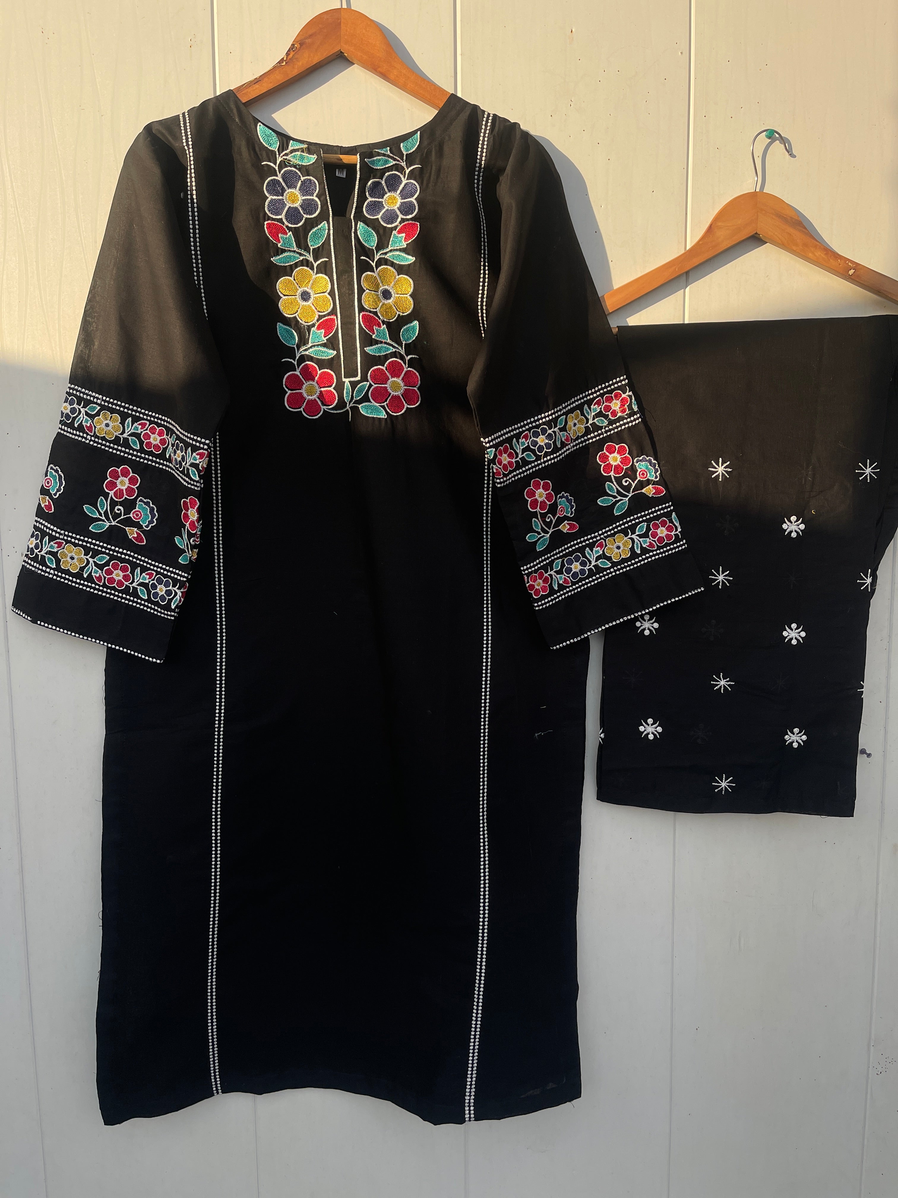 The MEHAR 2pc collection offers a black embroidered lawn dress with multi-thread embroidery,