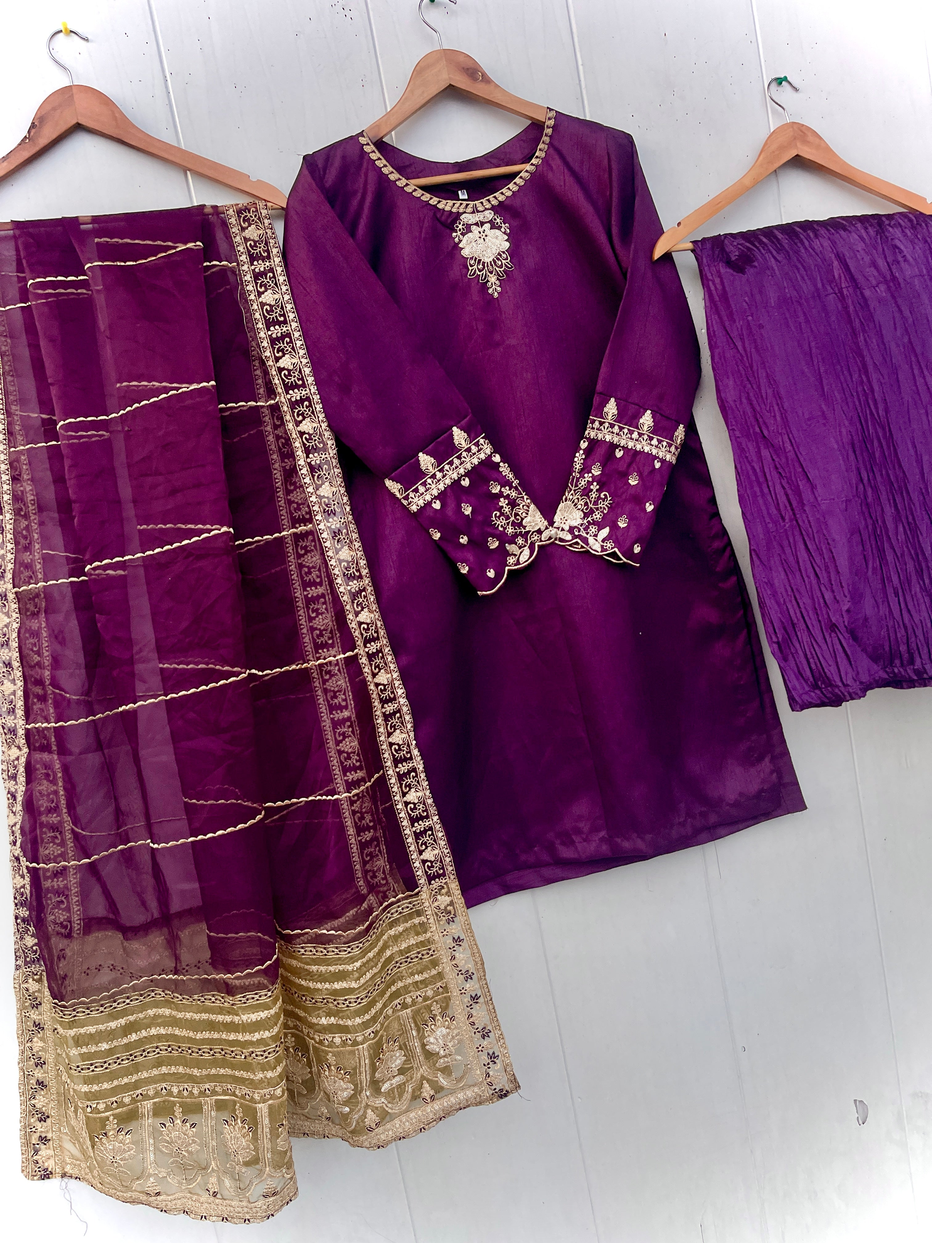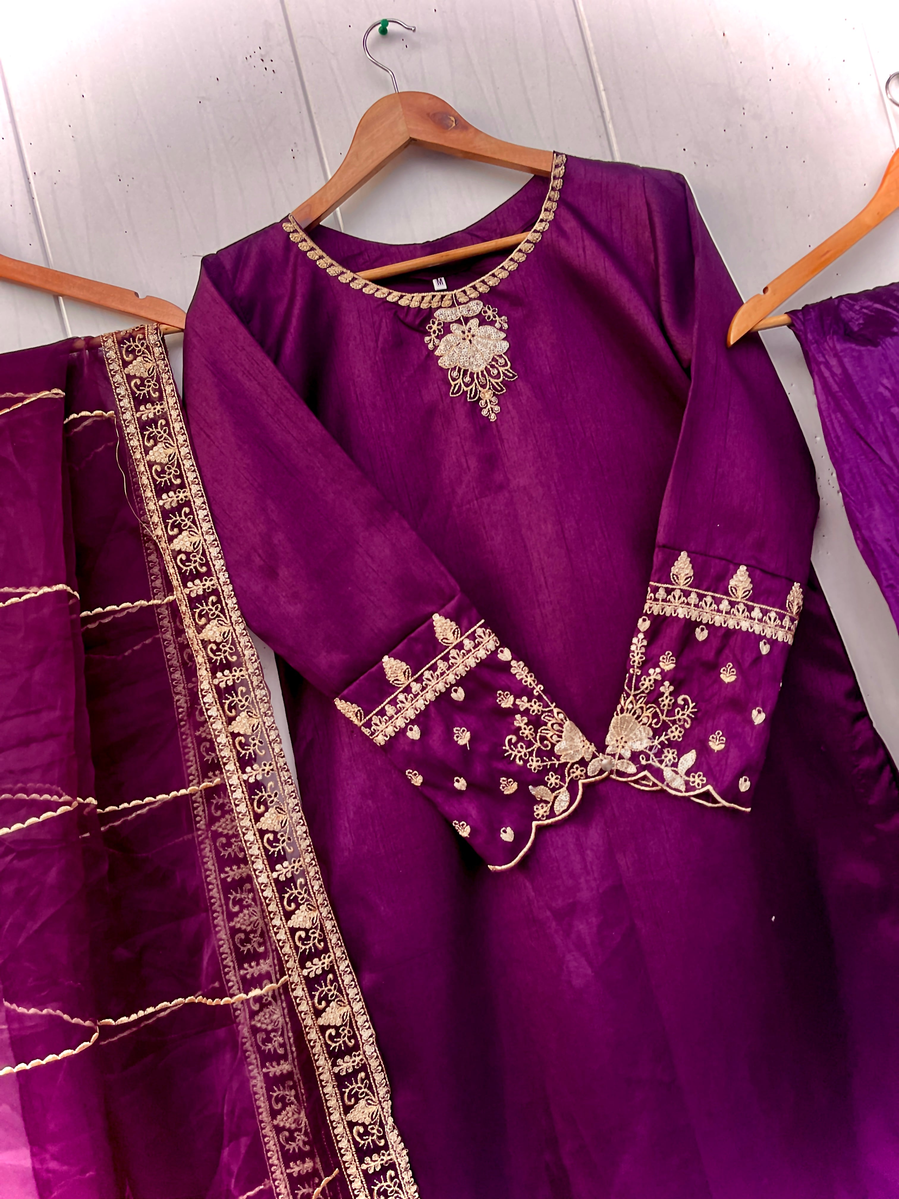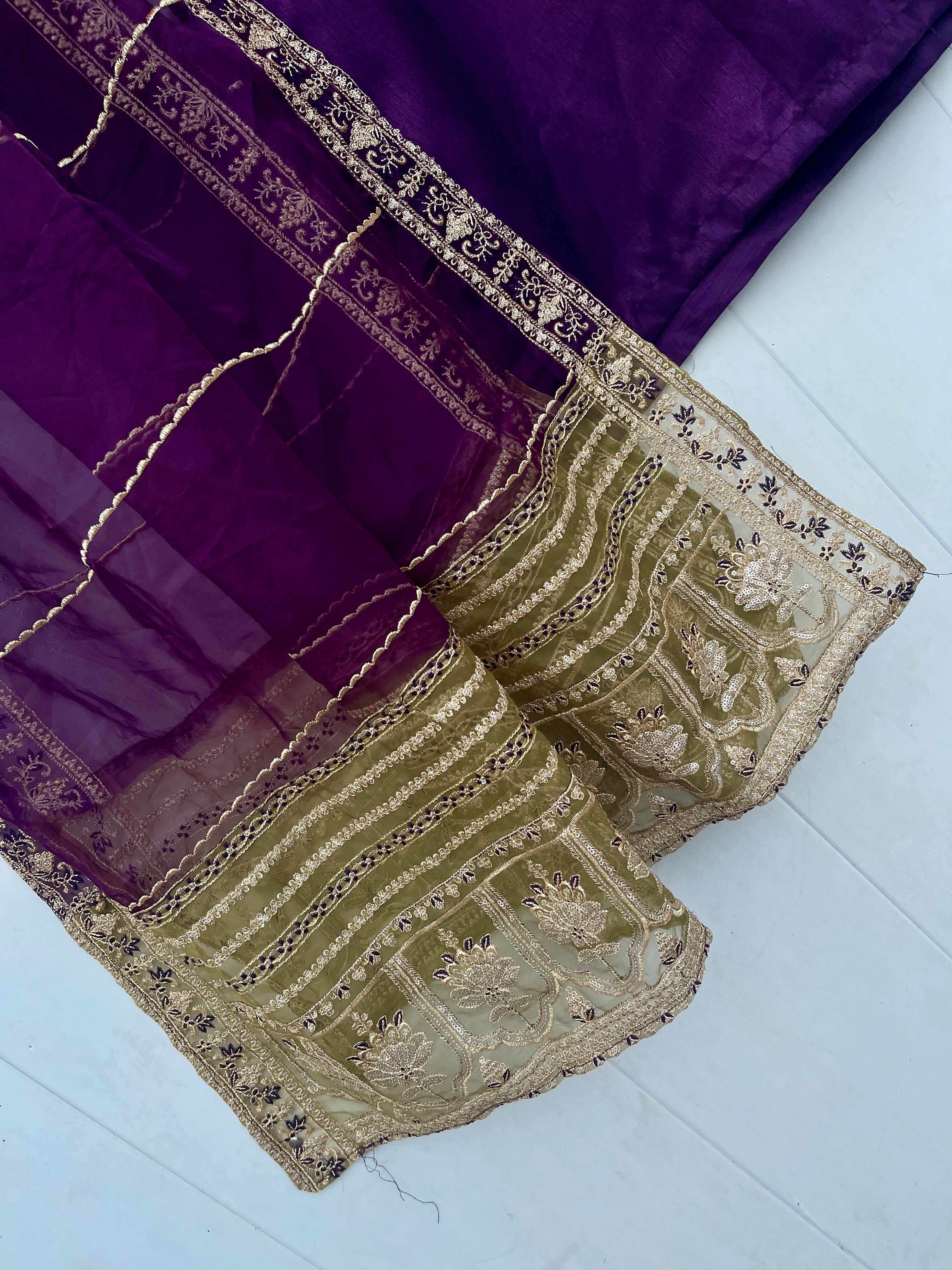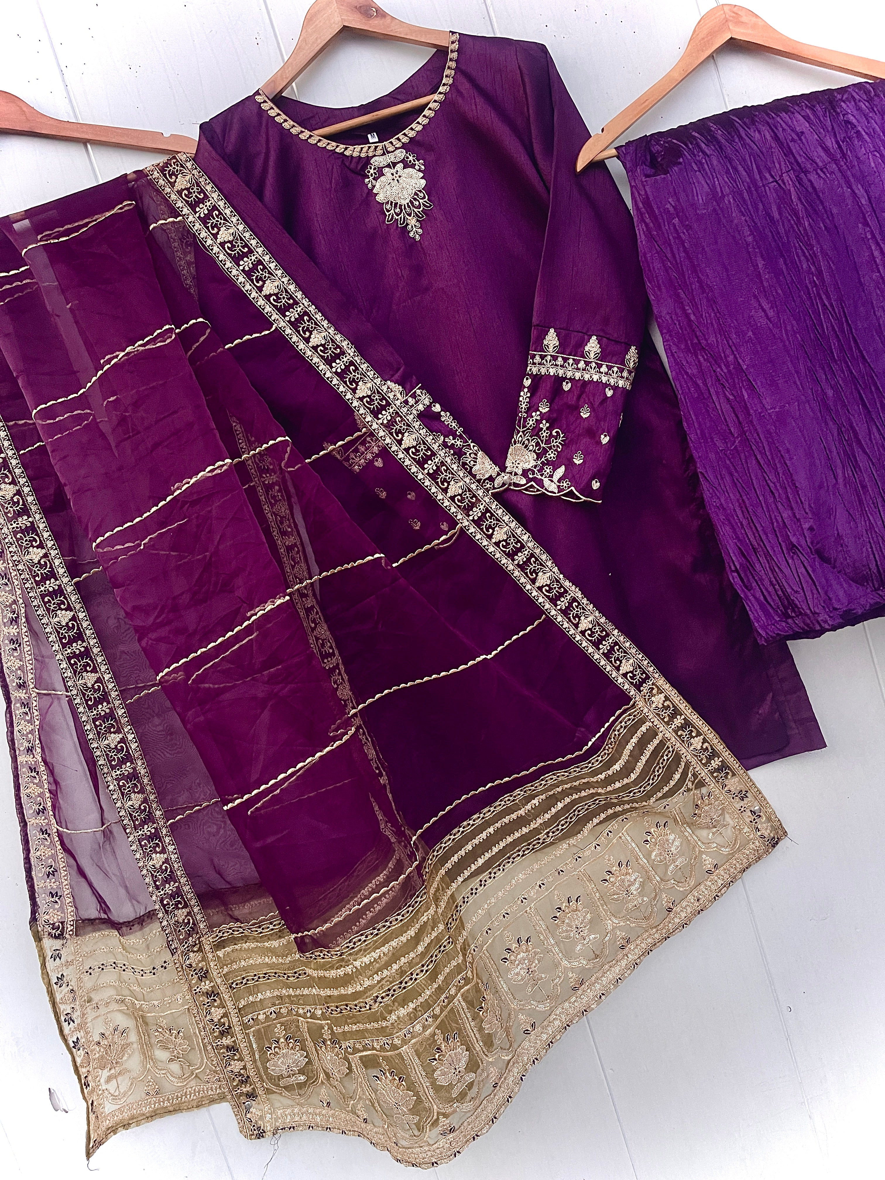 Enhance your festive look with our MINHA LUXURY FESTIVE COLLECTION. Made from luxurious silk, this collection features a shirt with intricate sequin and thread embroidery on the neckline and sleeves. The silk crush gharara adds to the elegance, while the organza dupta is embellished with heavy thread and sequin embroidery on both sides. Measuring 2.75 meters in length, the dupta is sure to elevate the beauty of your dress.