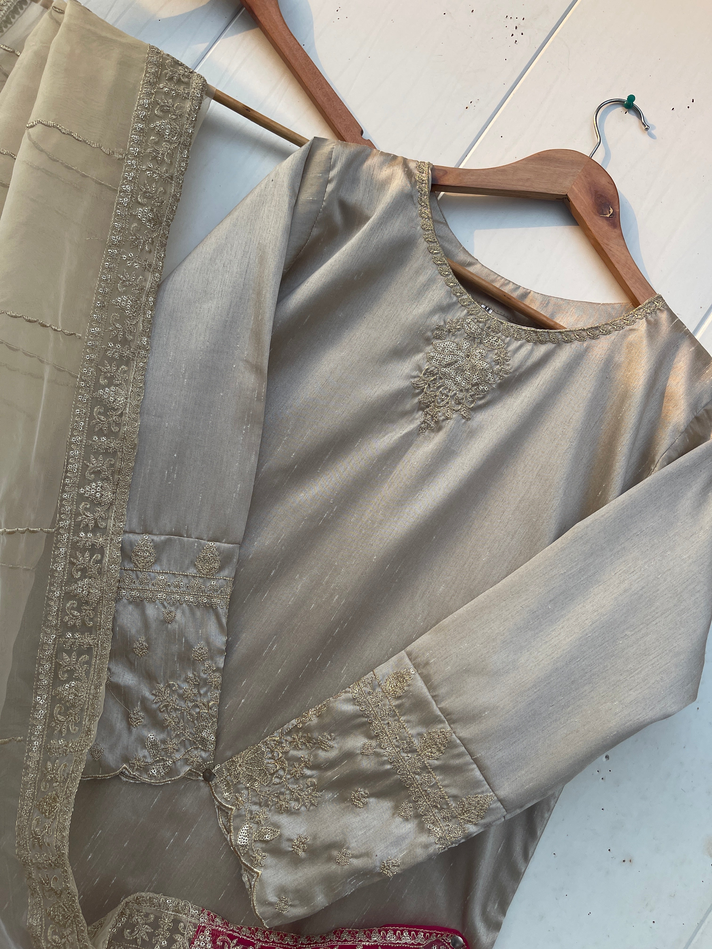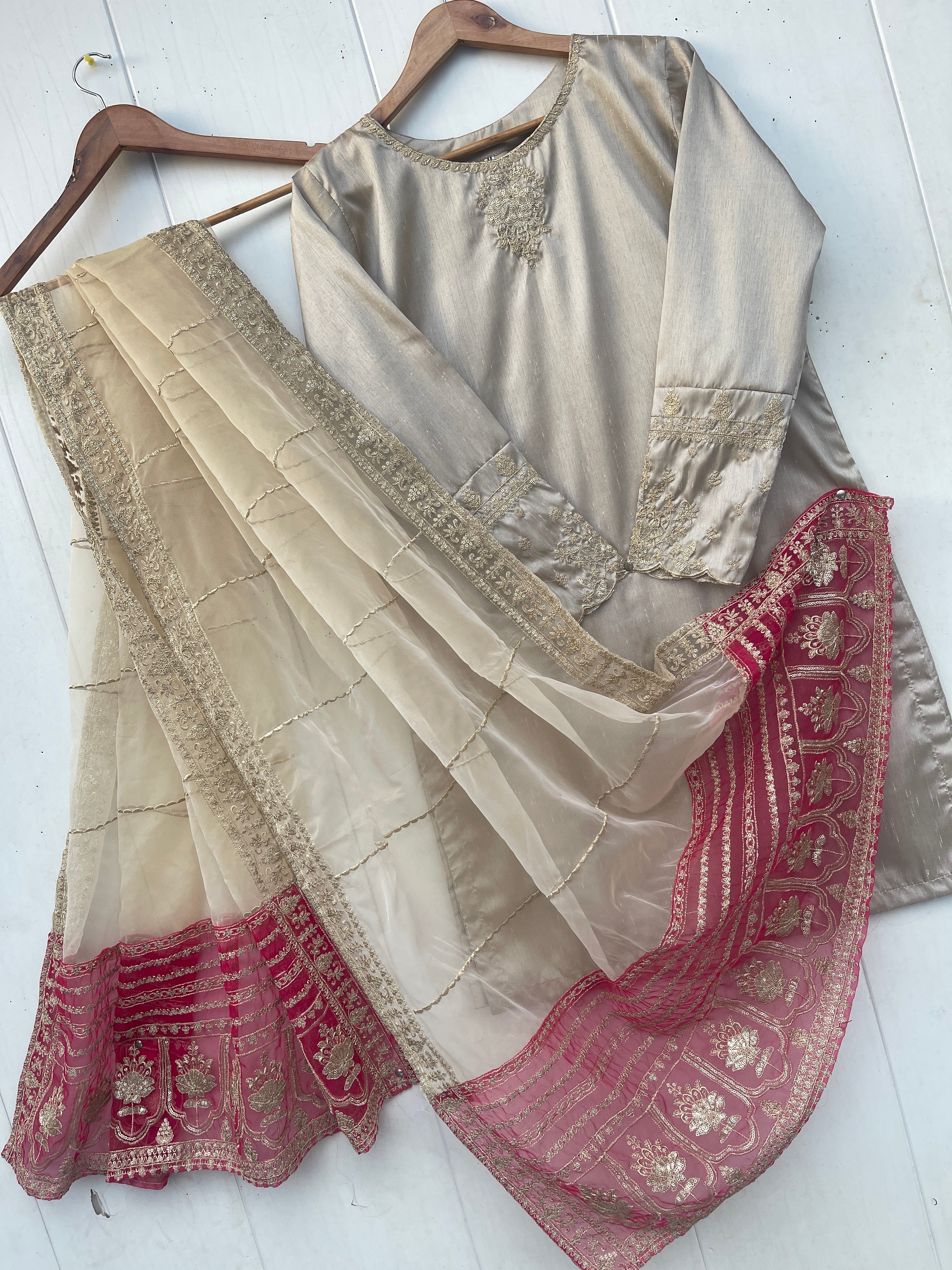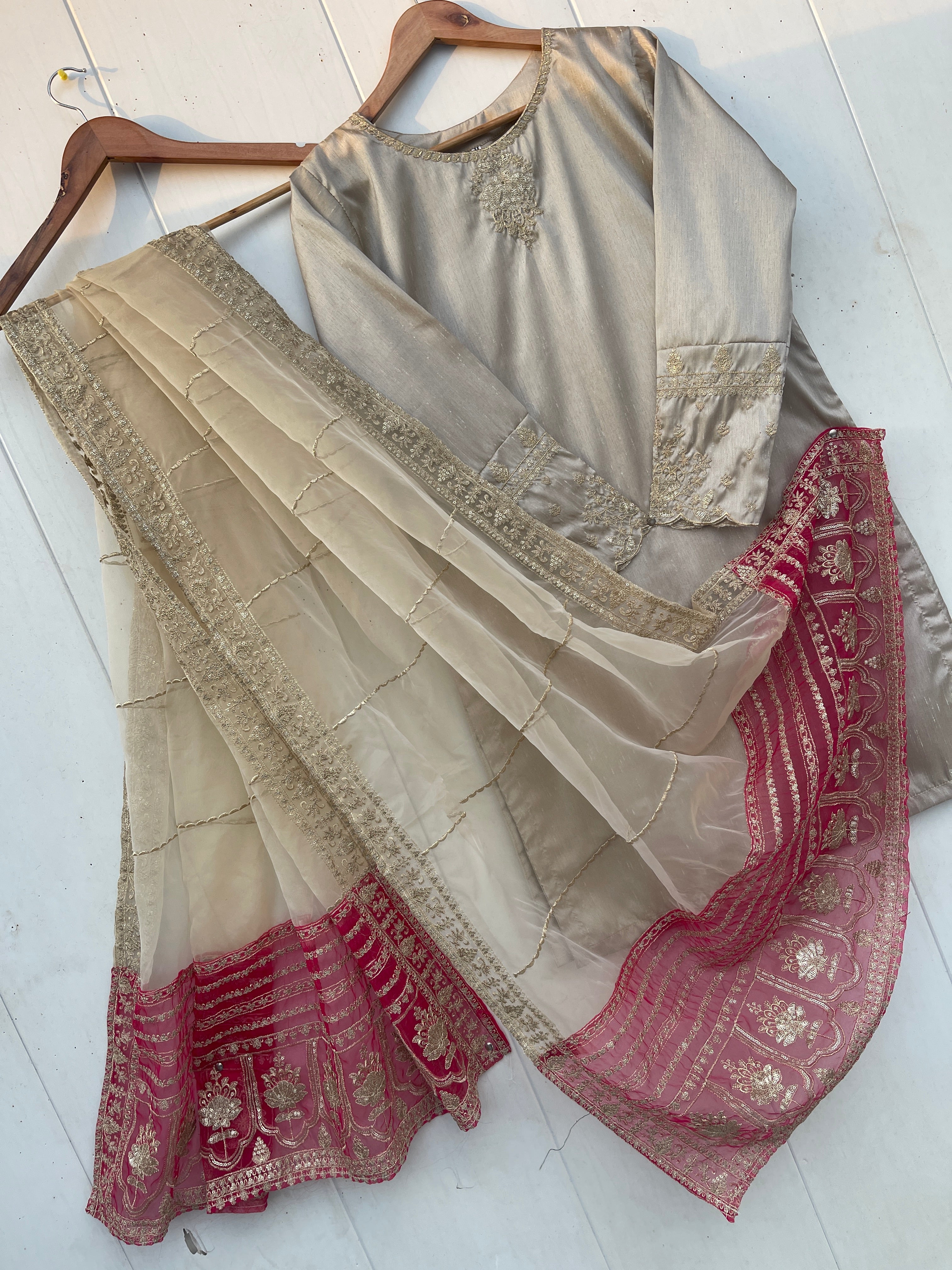 Enhance your festive look with our MINHA LUXURY FESTIVE COLLECTION. Made from luxurious silk, this collection features a shirt with intricate sequin and thread embroidery on the neckline and sleeves. The silk crush gharara adds to the elegance, while the organza dupta is embellished with heavy thread and sequin embroidery on both sides. Measuring 2.75 meters in length, the dupta is sure to elevate the beauty of your dress.