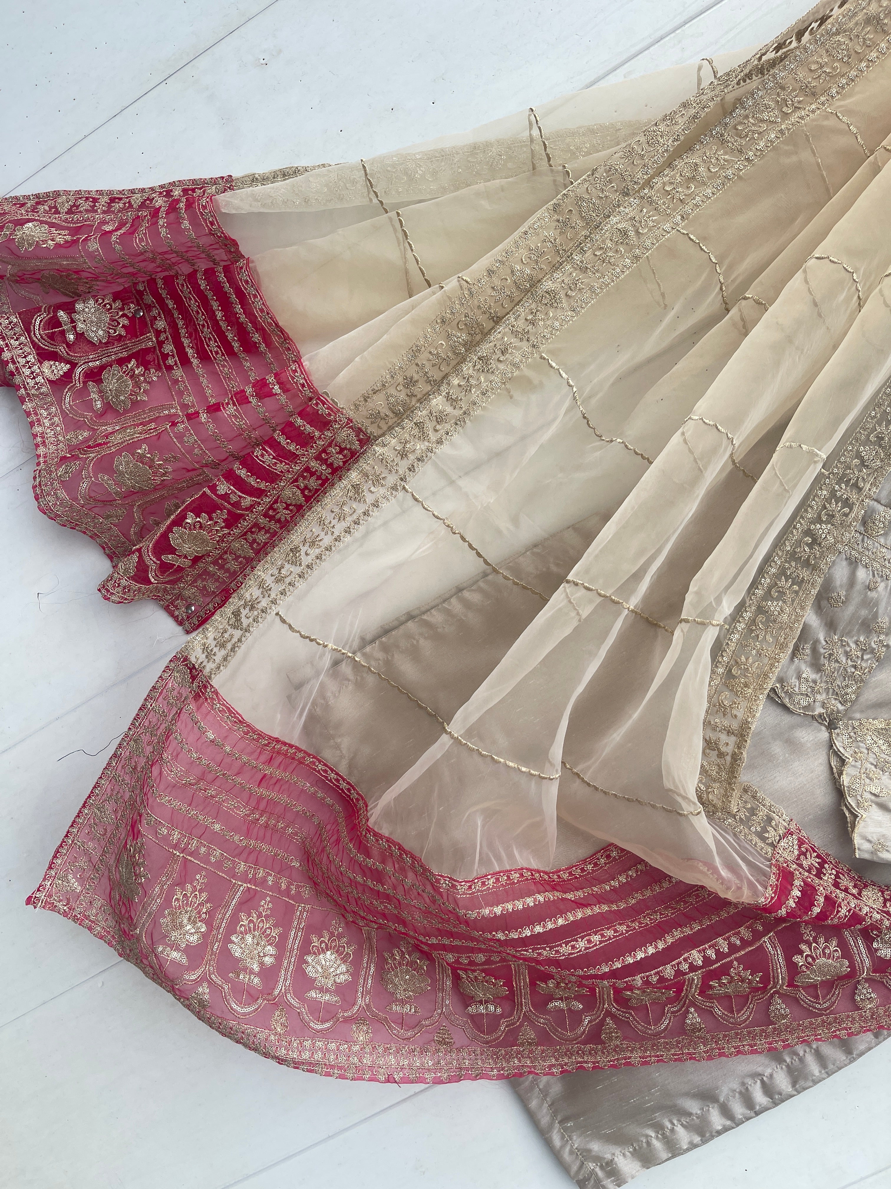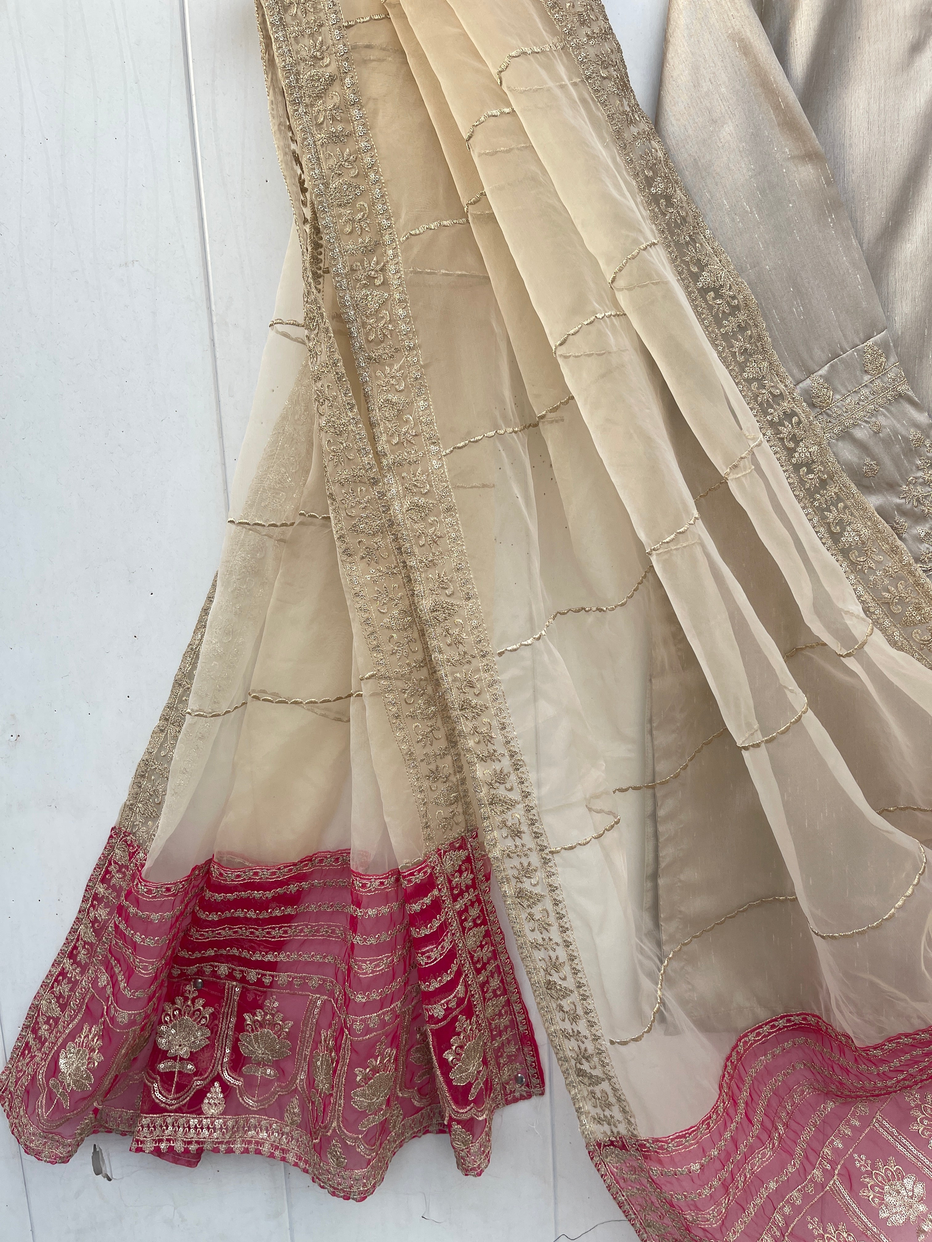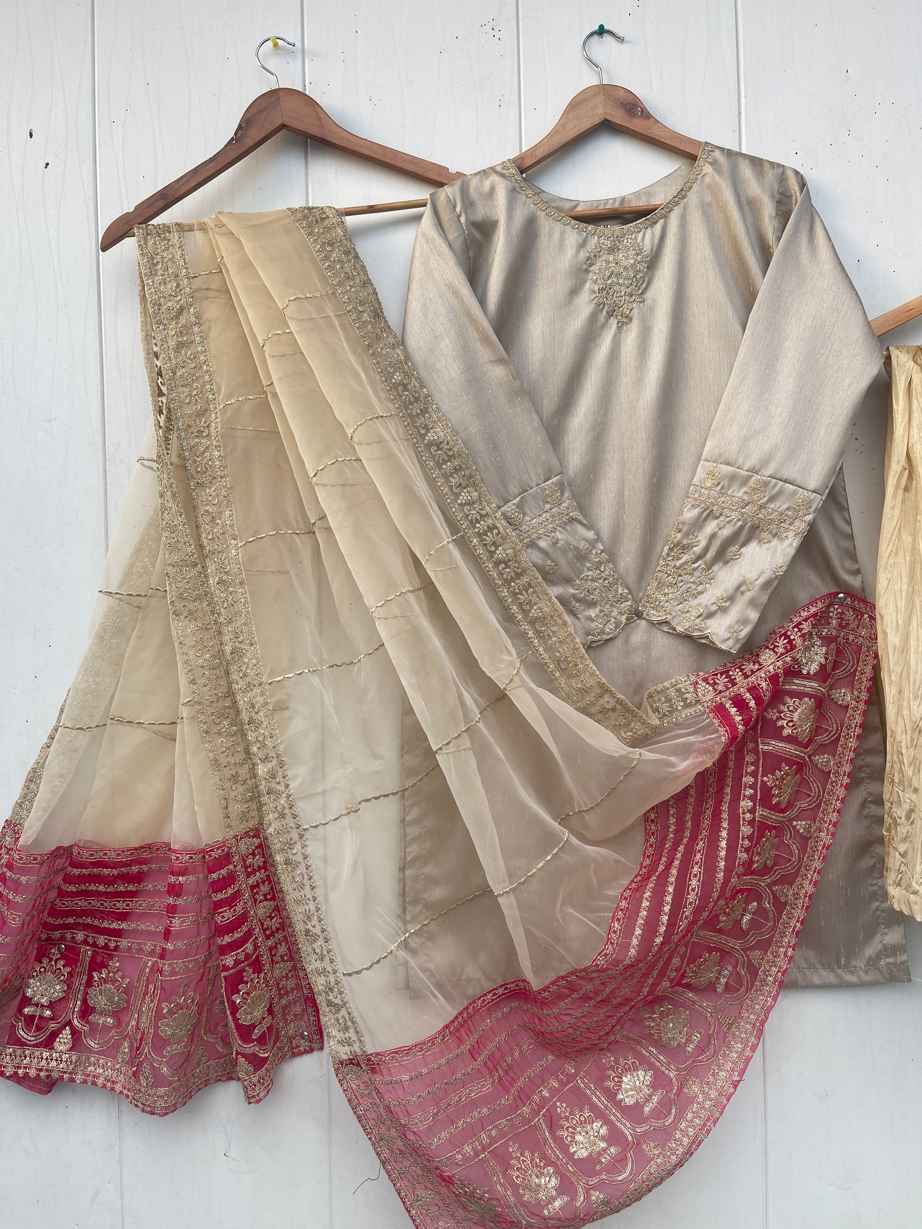 Enhance your festive look with our MINHA LUXURY FESTIVE COLLECTION. Made from luxurious silk, this collection features a shirt with intricate sequin and thread embroidery on the neckline and sleeves. The silk crush gharara adds to the elegance, while the organza dupta is embellished with heavy thread and sequin embroidery on both sides. Measuring 2.75 meters in length, the dupta is sure to elevate the beauty of your dress.