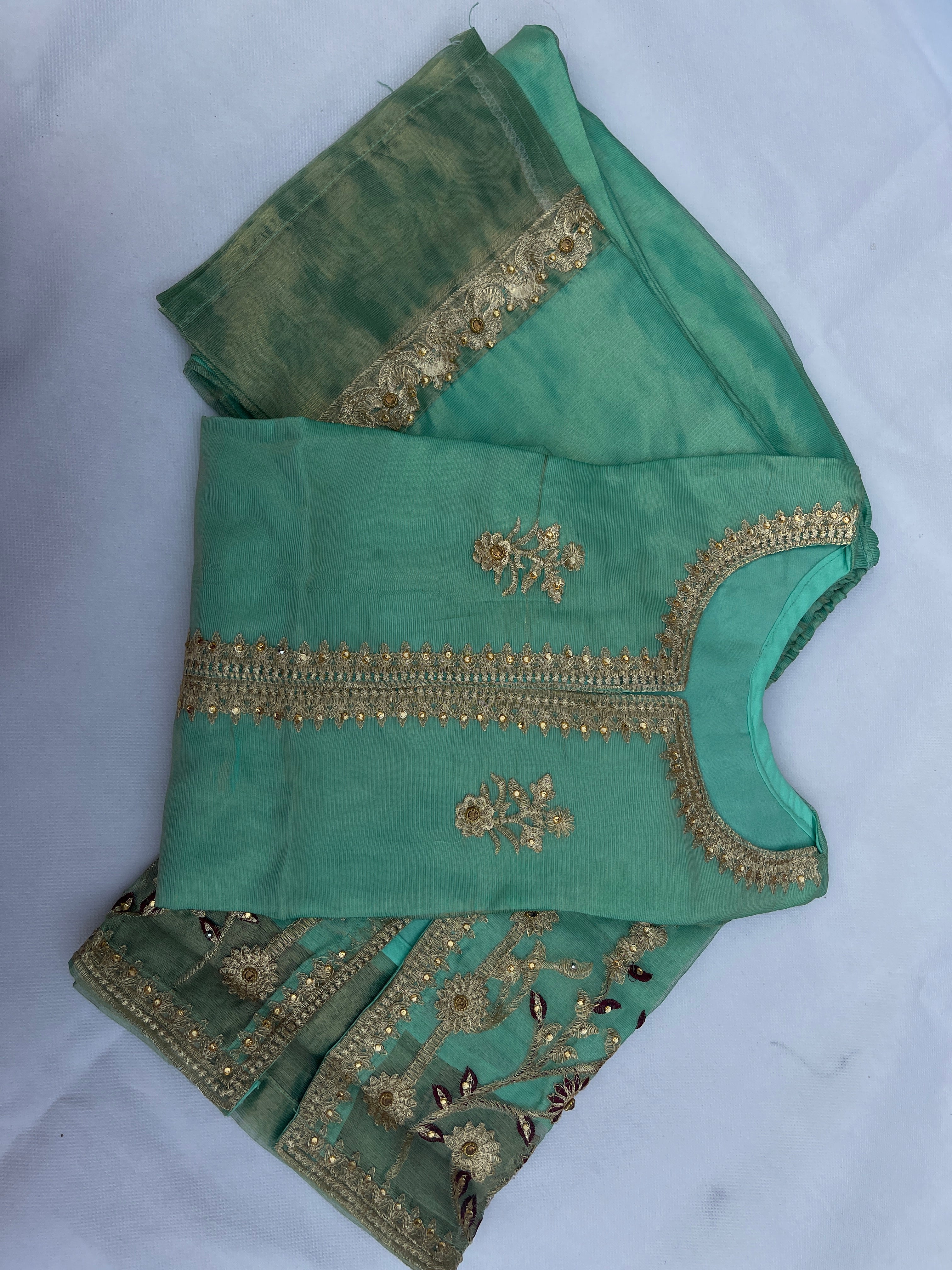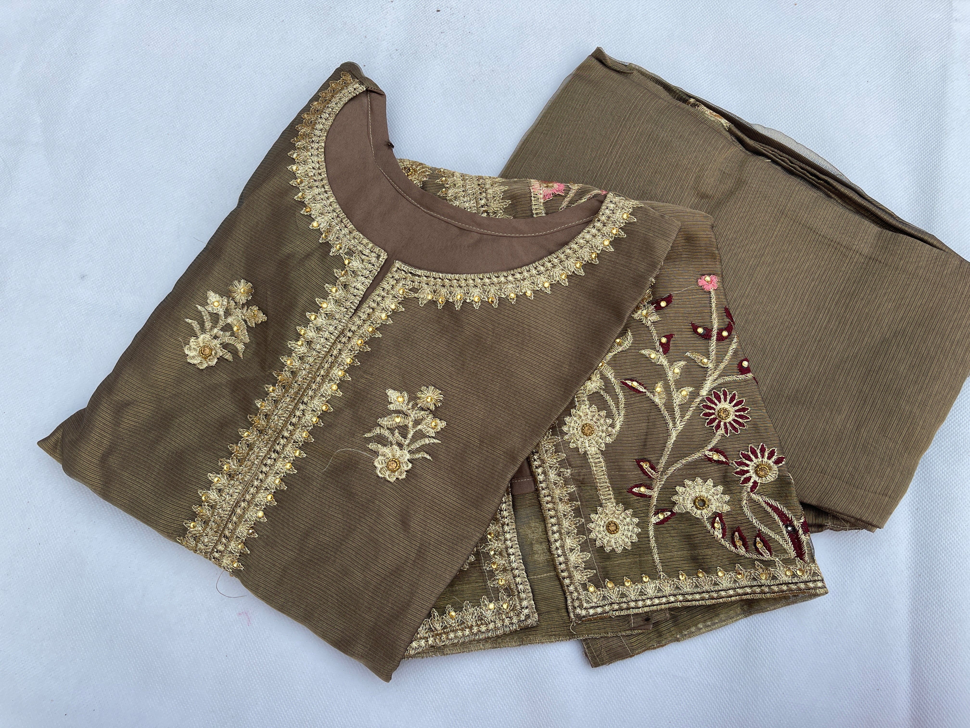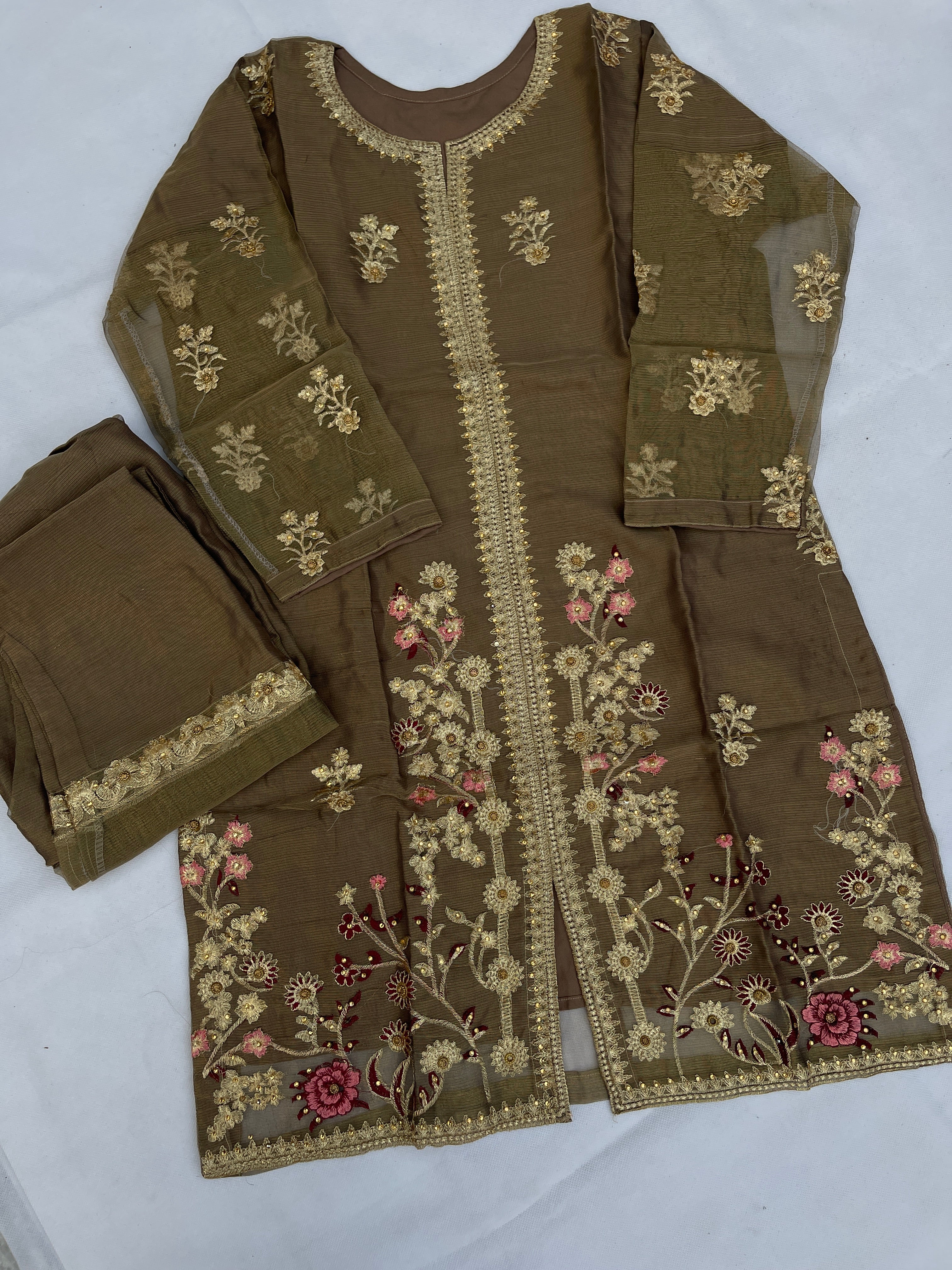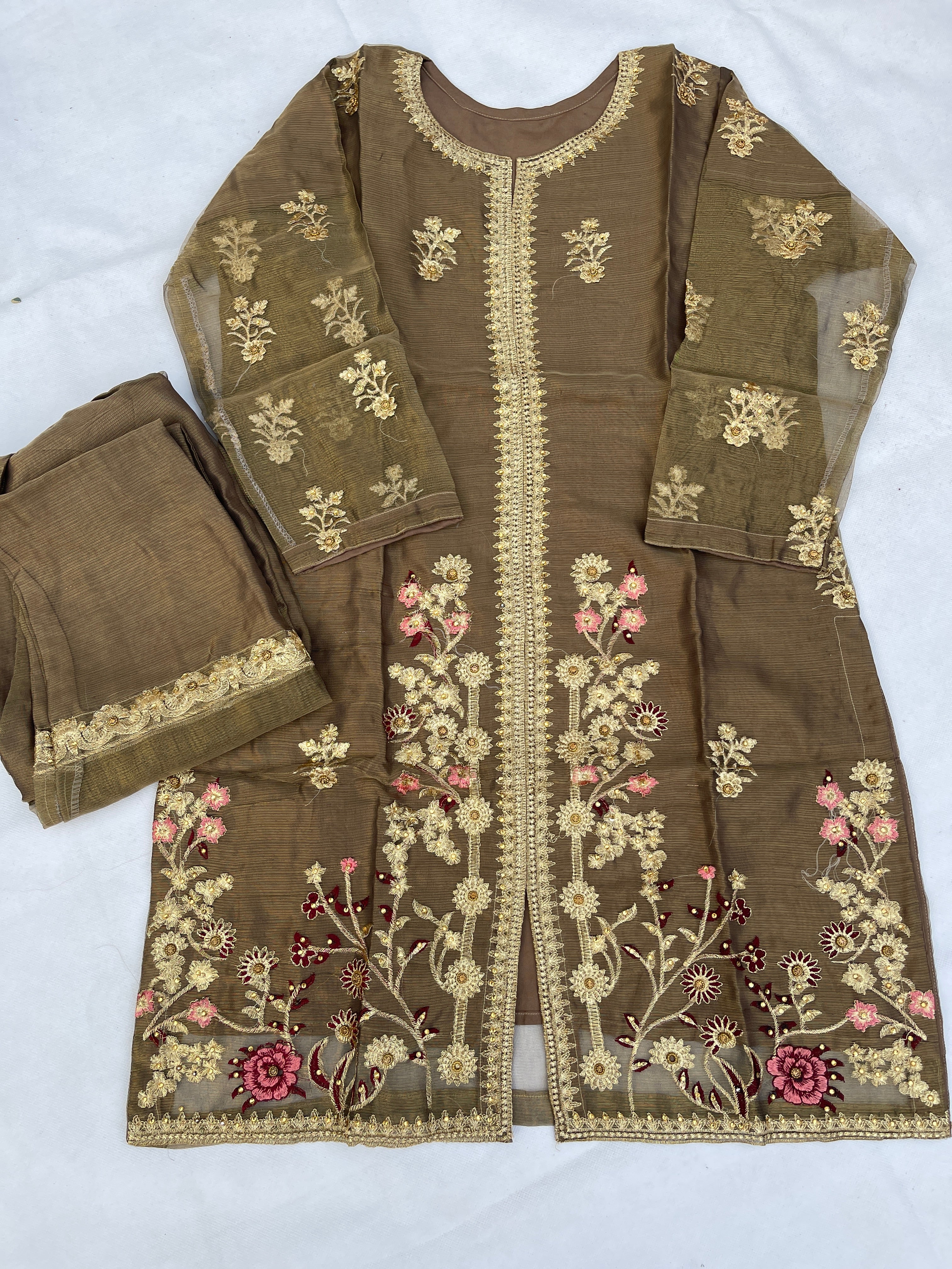 This elegant 2pc organza dress features delicate thread embroidery and a stylish organza shirt with an attached inner lining for a polished look. Paired with a trouser, this dress is perfect for formal occasions. Elevate your style with our embroidered formal collection.