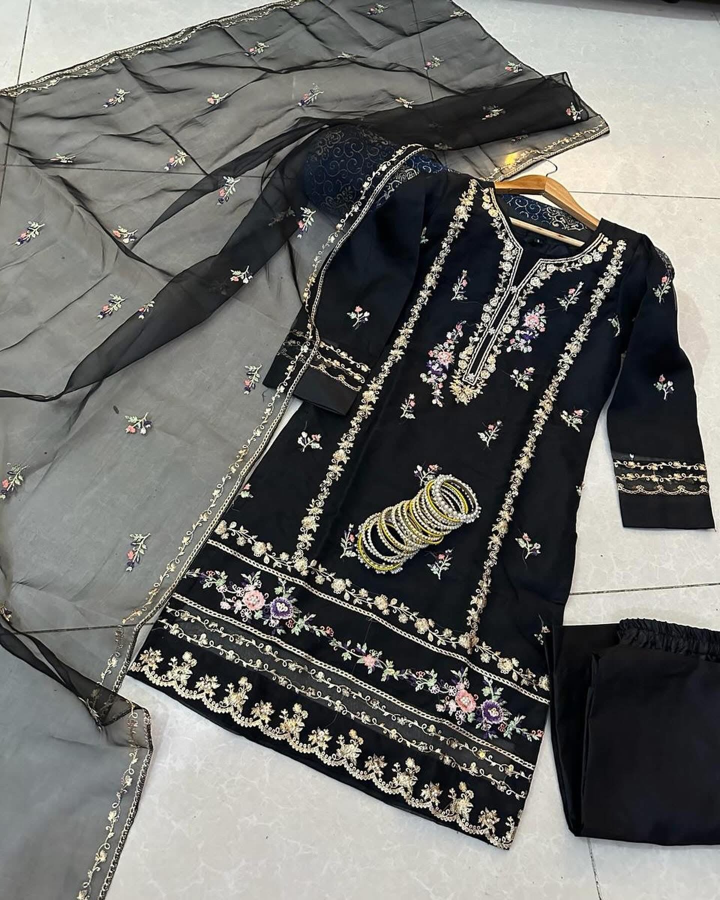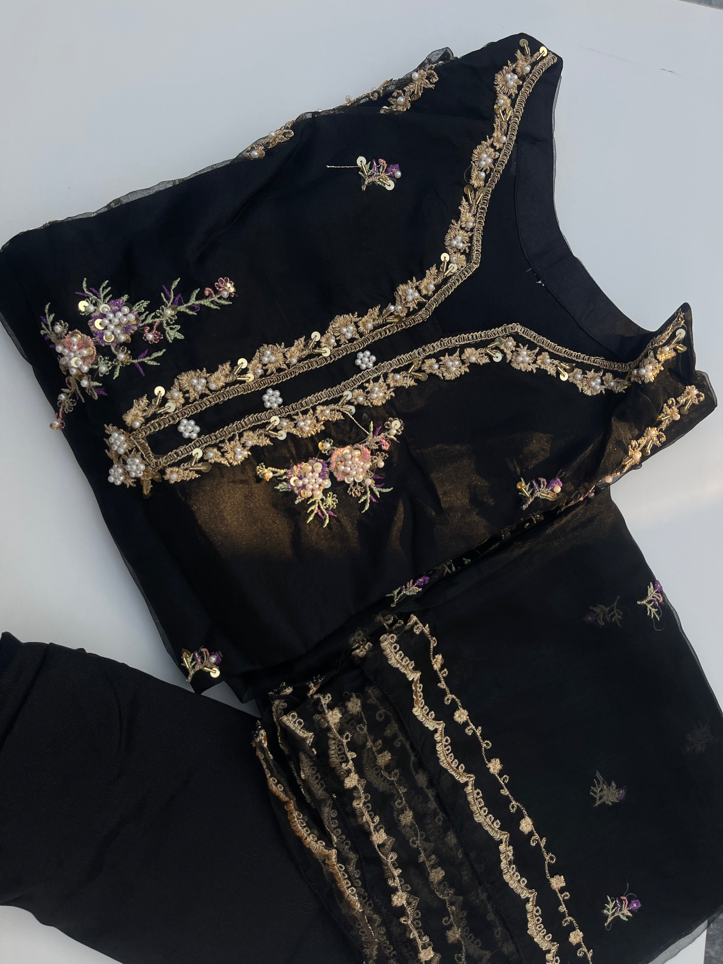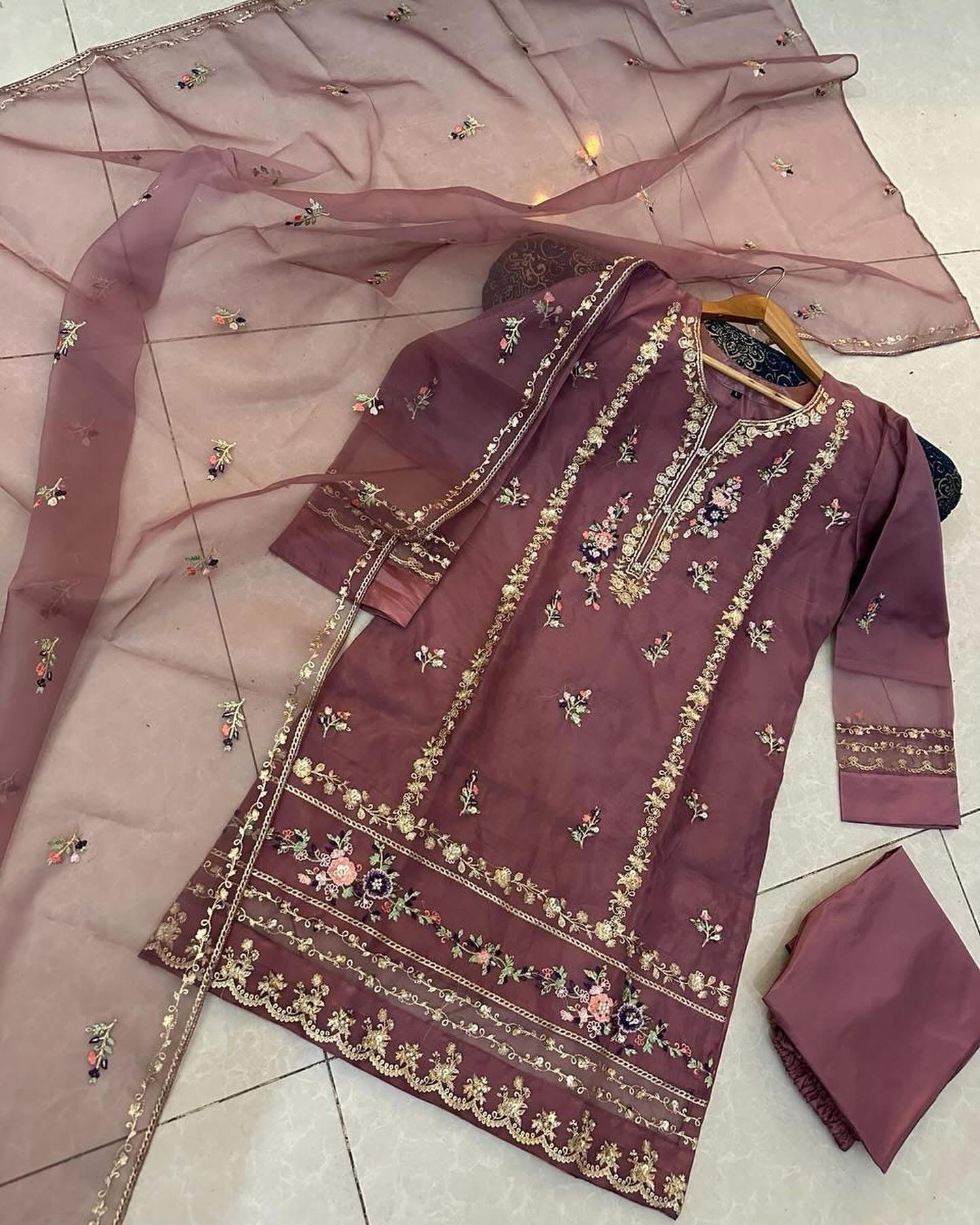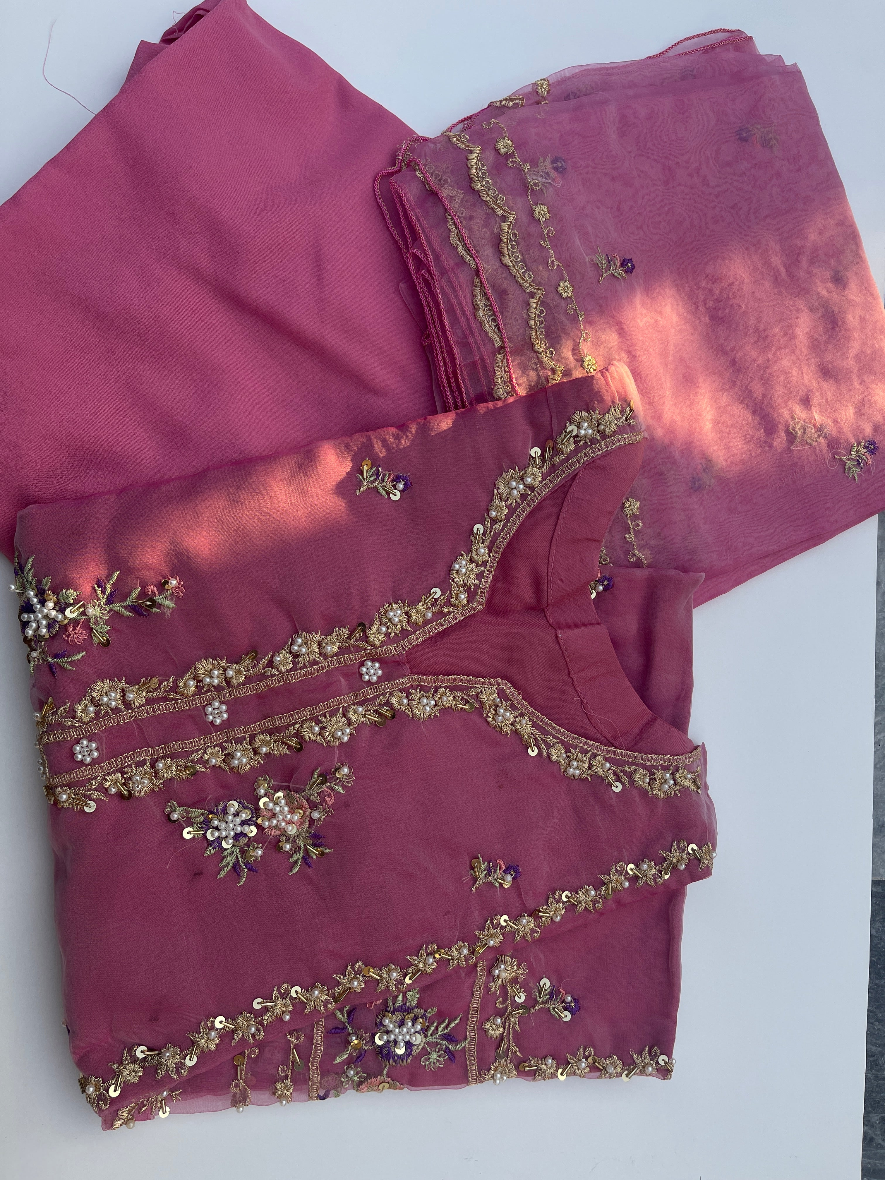 Discover elegance and sophistication in our ORGANZA 3PC DRESS. Hand embroidered with pearls, this dress exudes luxury and style. Paired with a silk plain trouser and a beautifully crafted organza dupta with thread embroidery, it offers a perfect combination of comfort and grace. With a shirt length of 40 inches, this dress is a must-have for any special occasion.