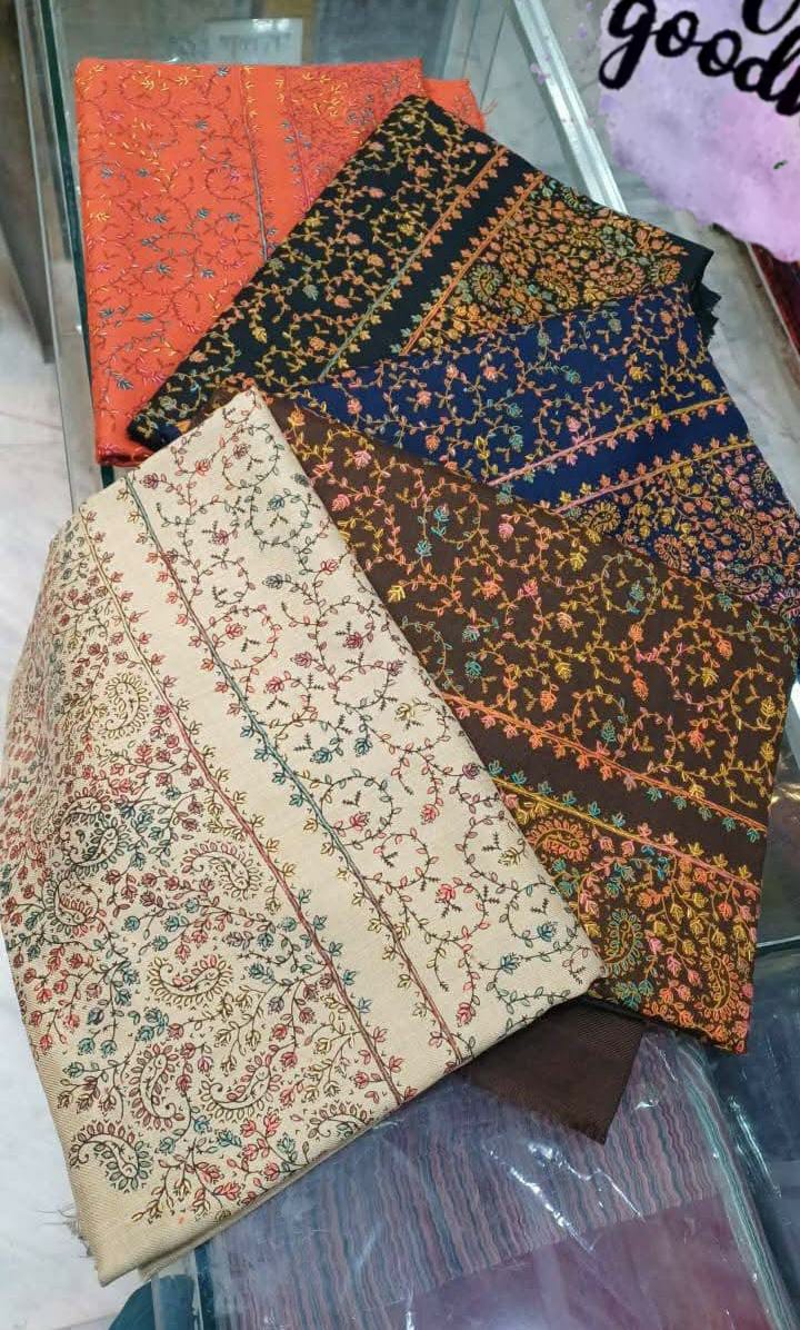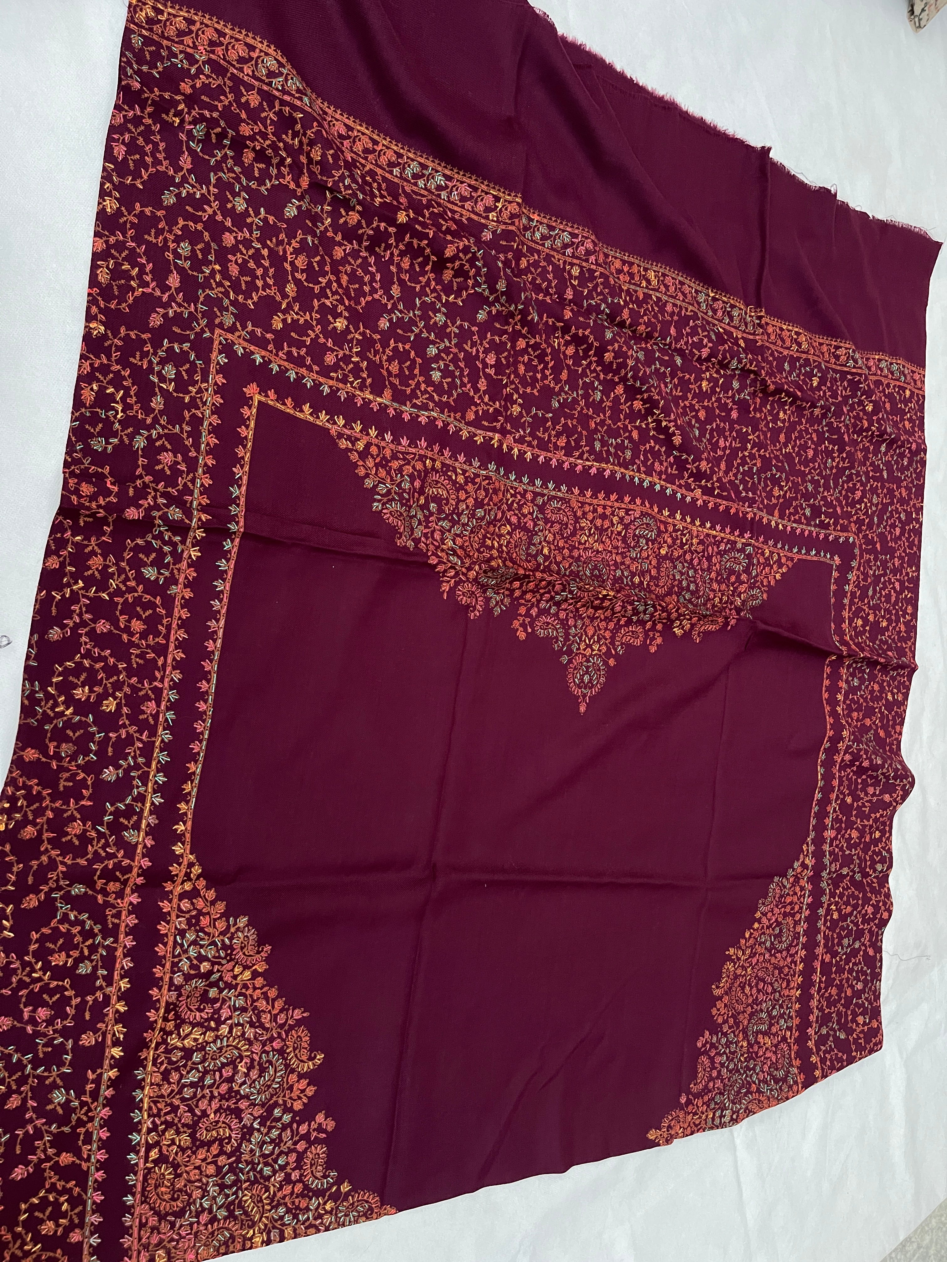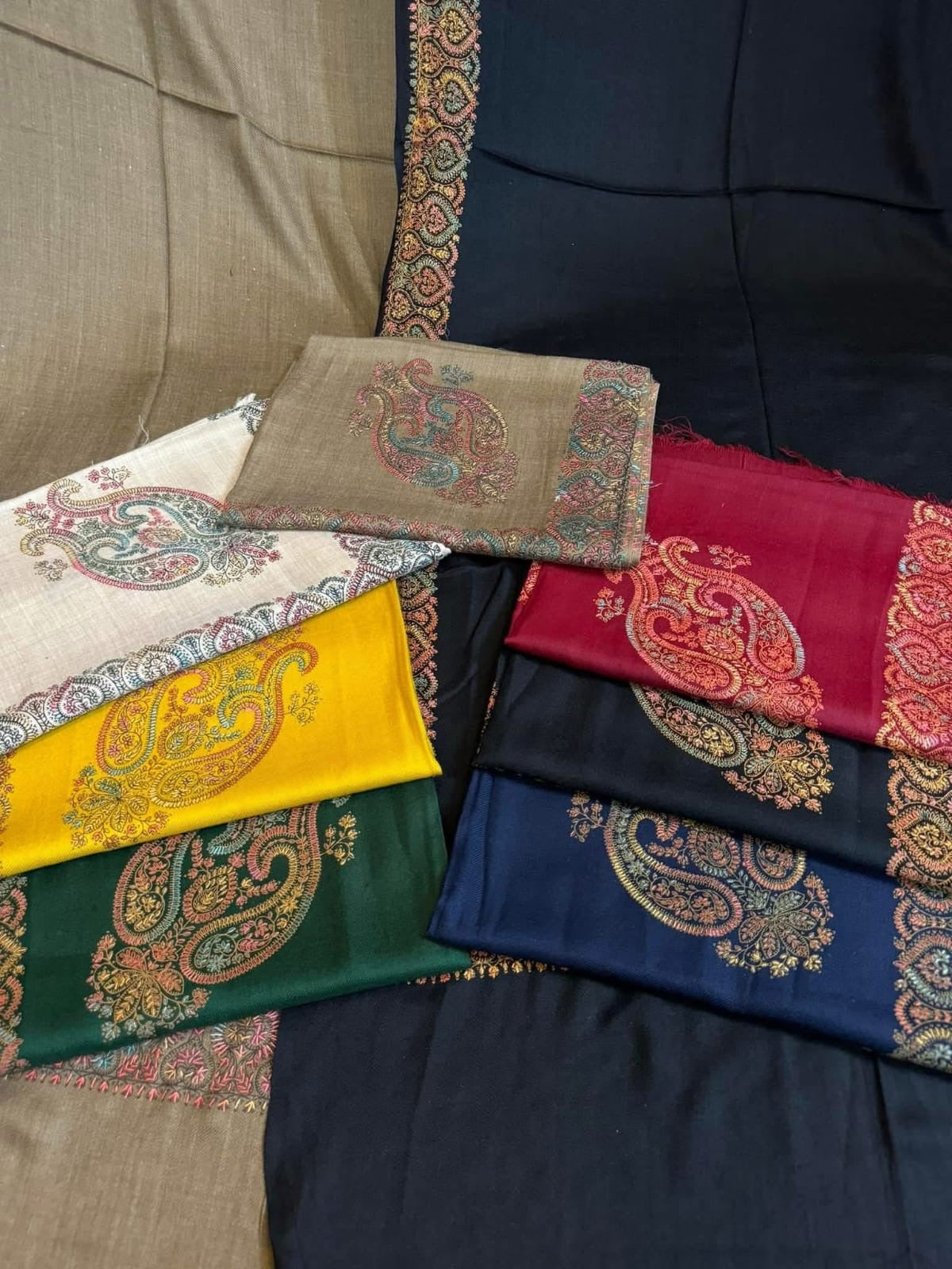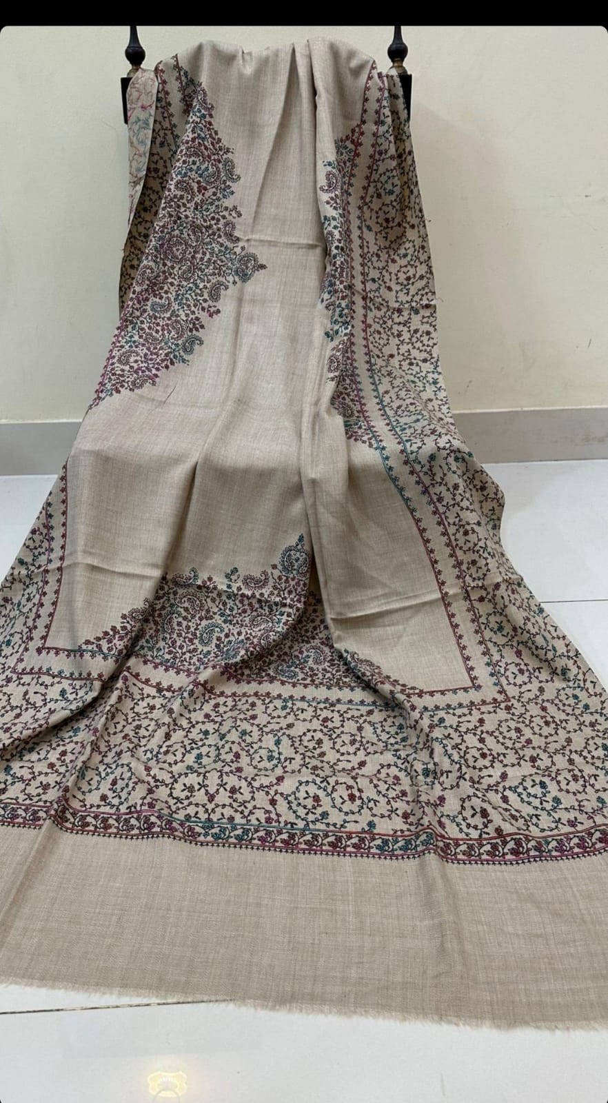 This traditional Kashmiri tanka hand embroidered pashmina shawl adds a touch of elegance and warmth to any outfit. Crafted with intricate designs, this stylish shawl is perfect for the season and measures 2.75 yards in length. Elevate your wardrobe with this beautiful and timeless accessory.