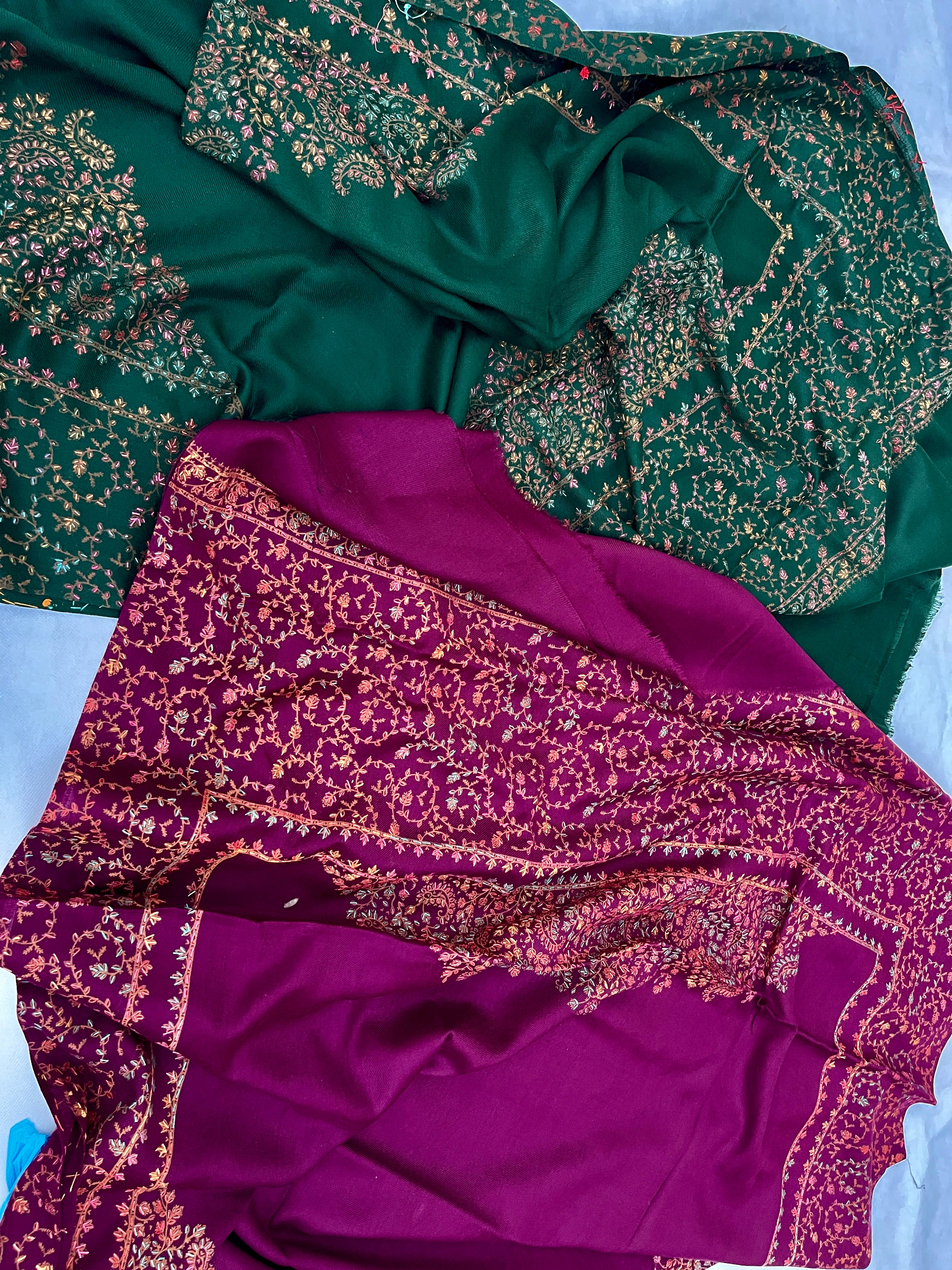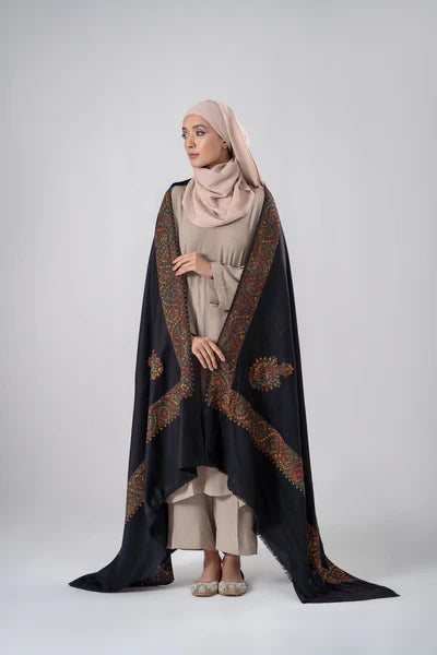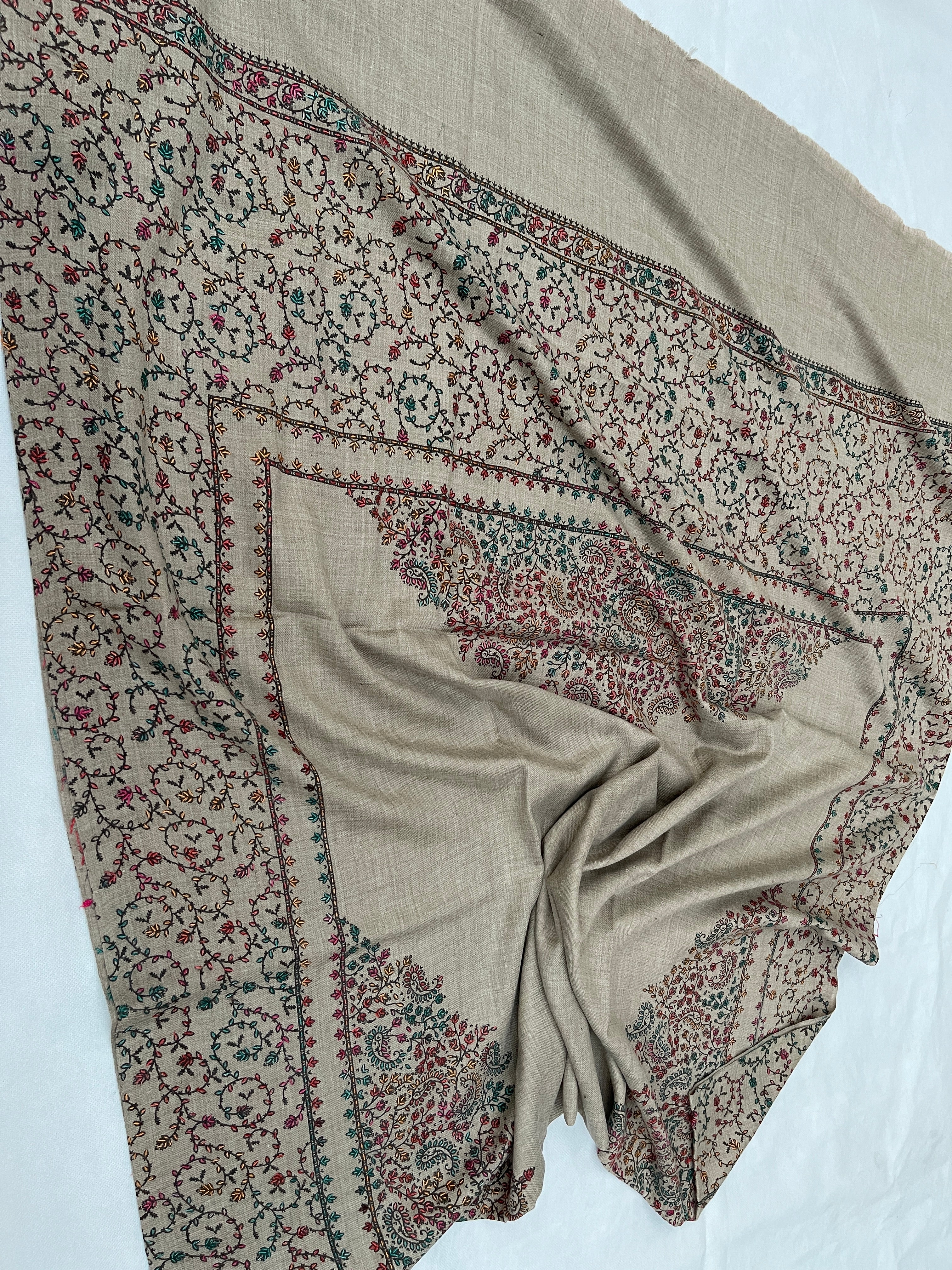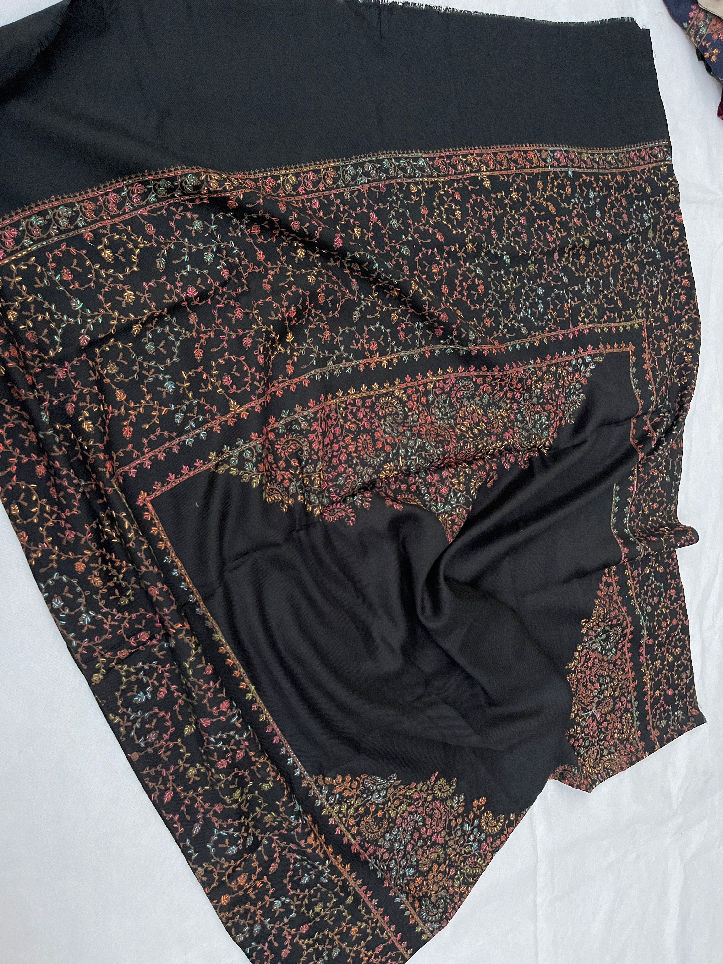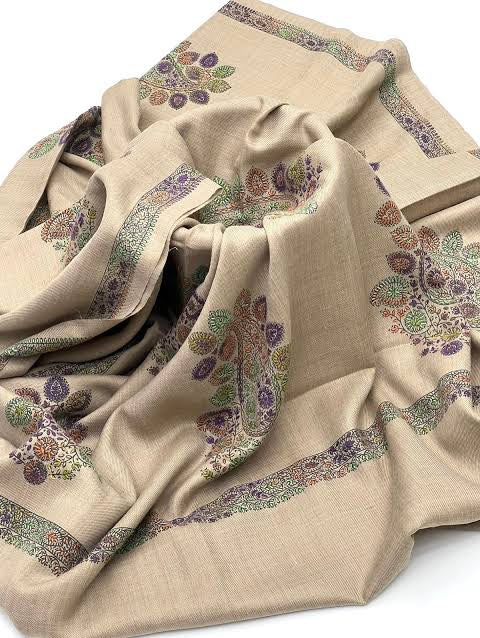 This traditional Kashmiri tanka hand embroidered pashmina shawl adds a touch of elegance and warmth to any outfit. Crafted with intricate designs, this stylish shawl is perfect for the season and measures 2.75 yards in length. Elevate your wardrobe with this beautiful and timeless accessory.