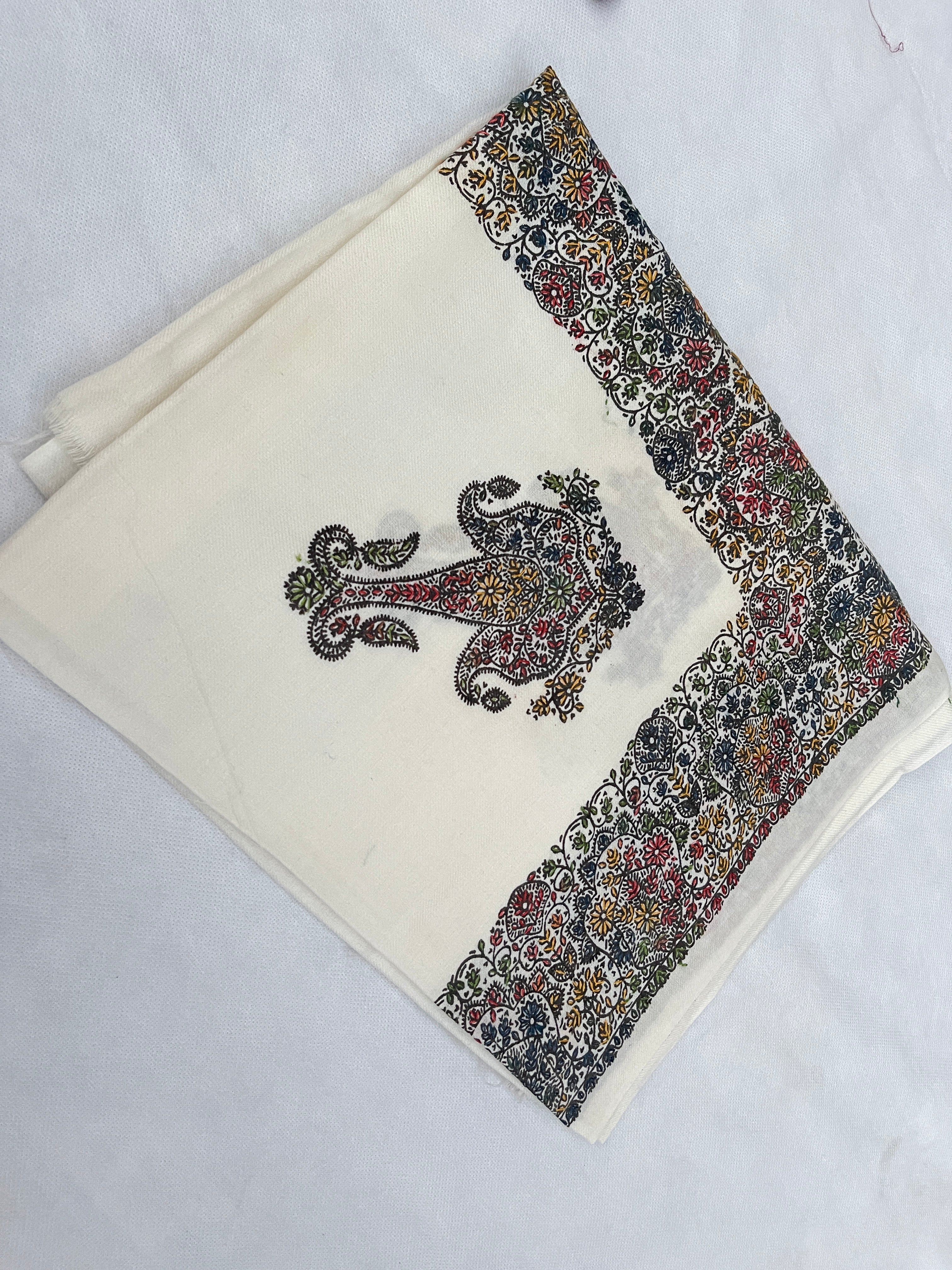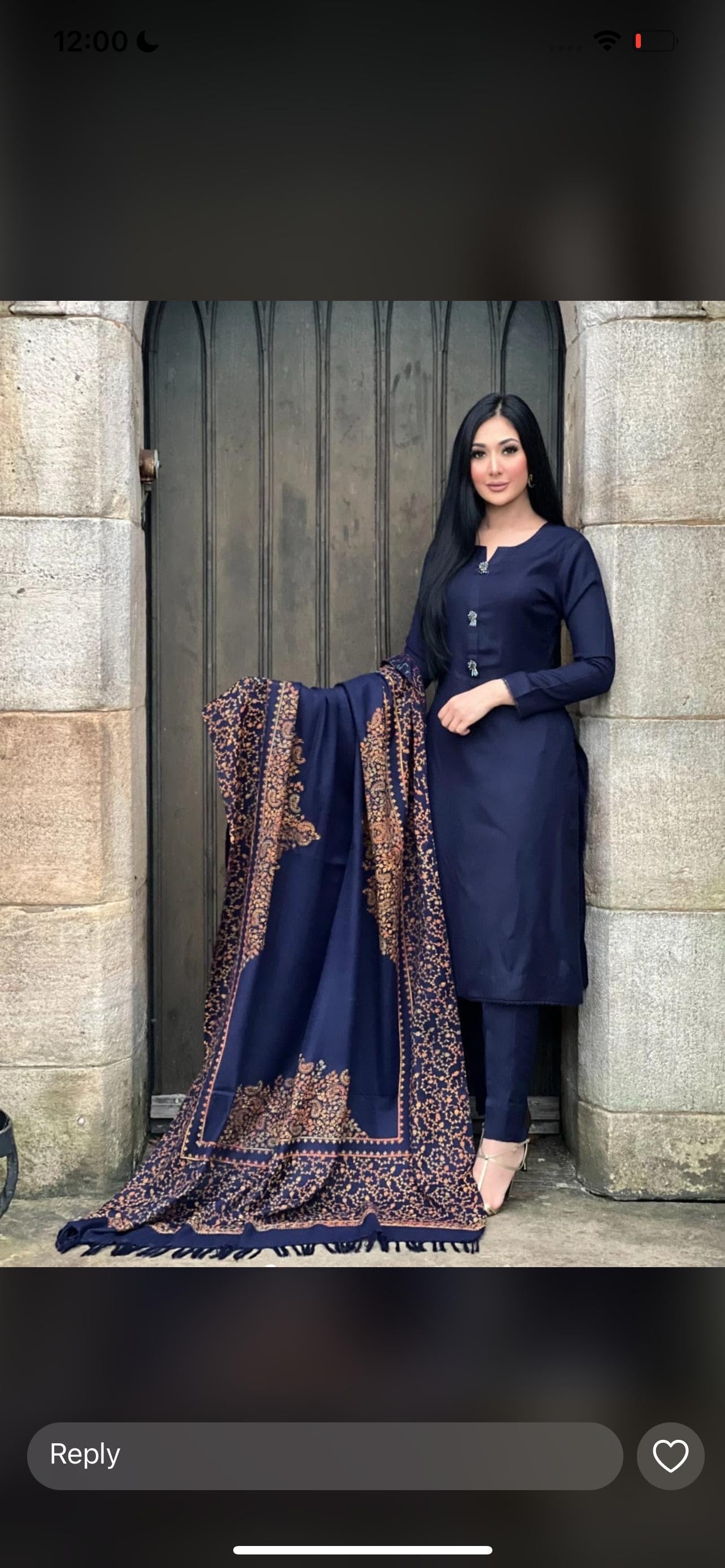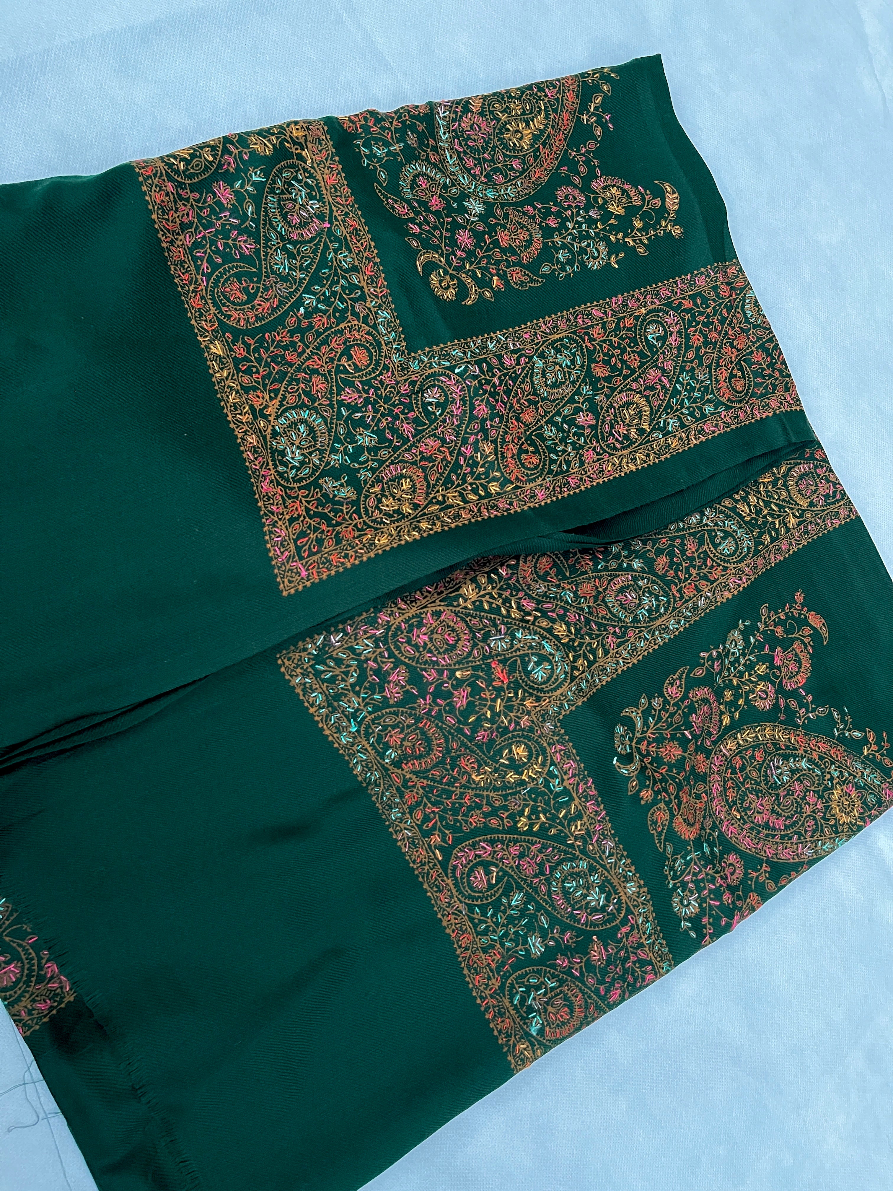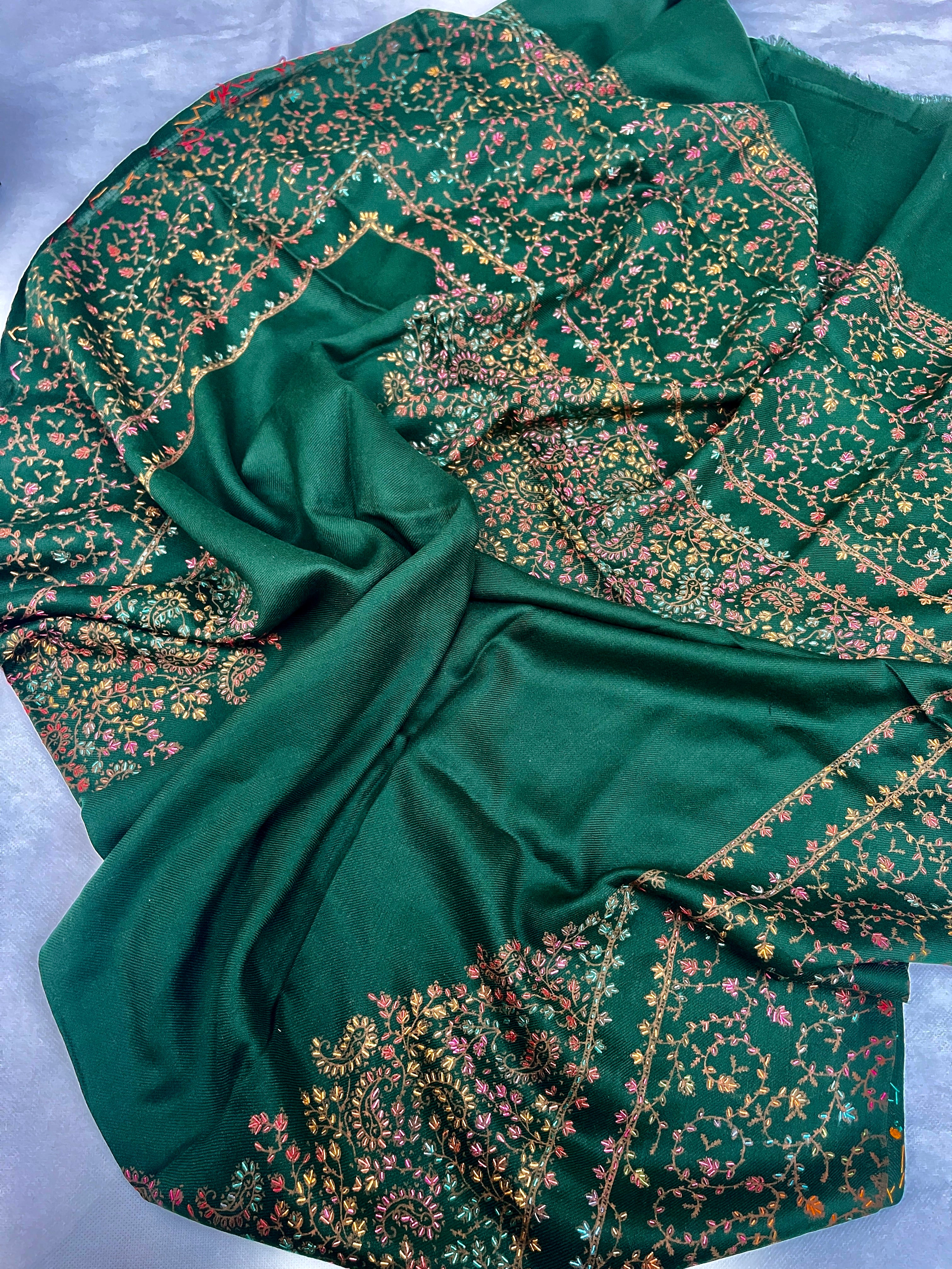 This traditional Kashmiri tanka hand embroidered pashmina shawl adds a touch of elegance and warmth to any outfit. Crafted with intricate designs, this stylish shawl is perfect for the season and measures 2.75 yards in length. Elevate your wardrobe with this beautiful and timeless accessory.