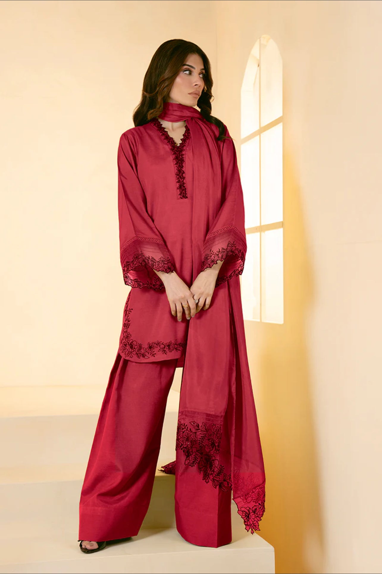 This RAYEHA LAWN COLLECTION features an embroidered neckline and sleeves, along with an embroidered round daman shirt and stylish shalwar. Perfect for adding a touch of elegance and tradition to any outfit.