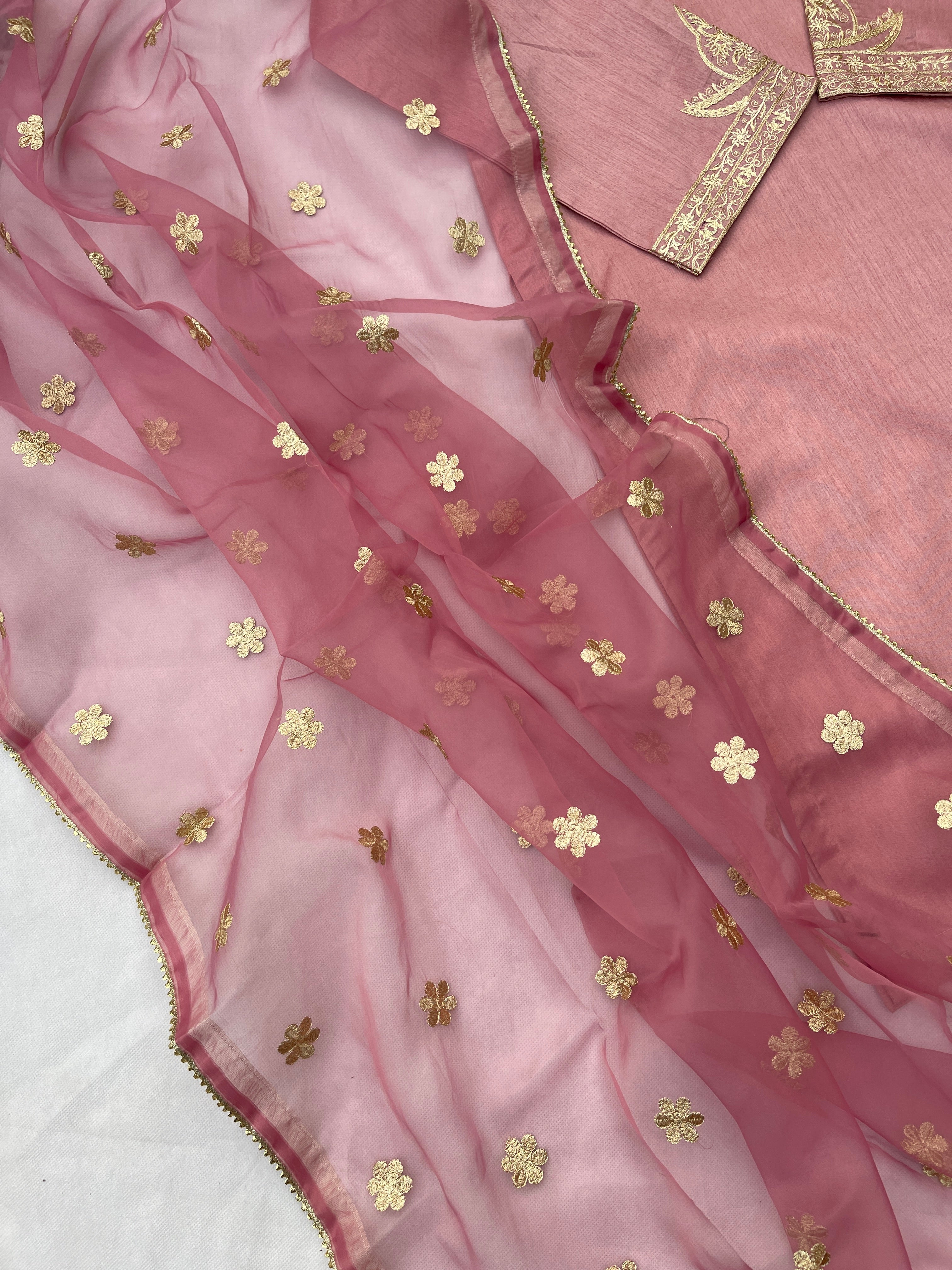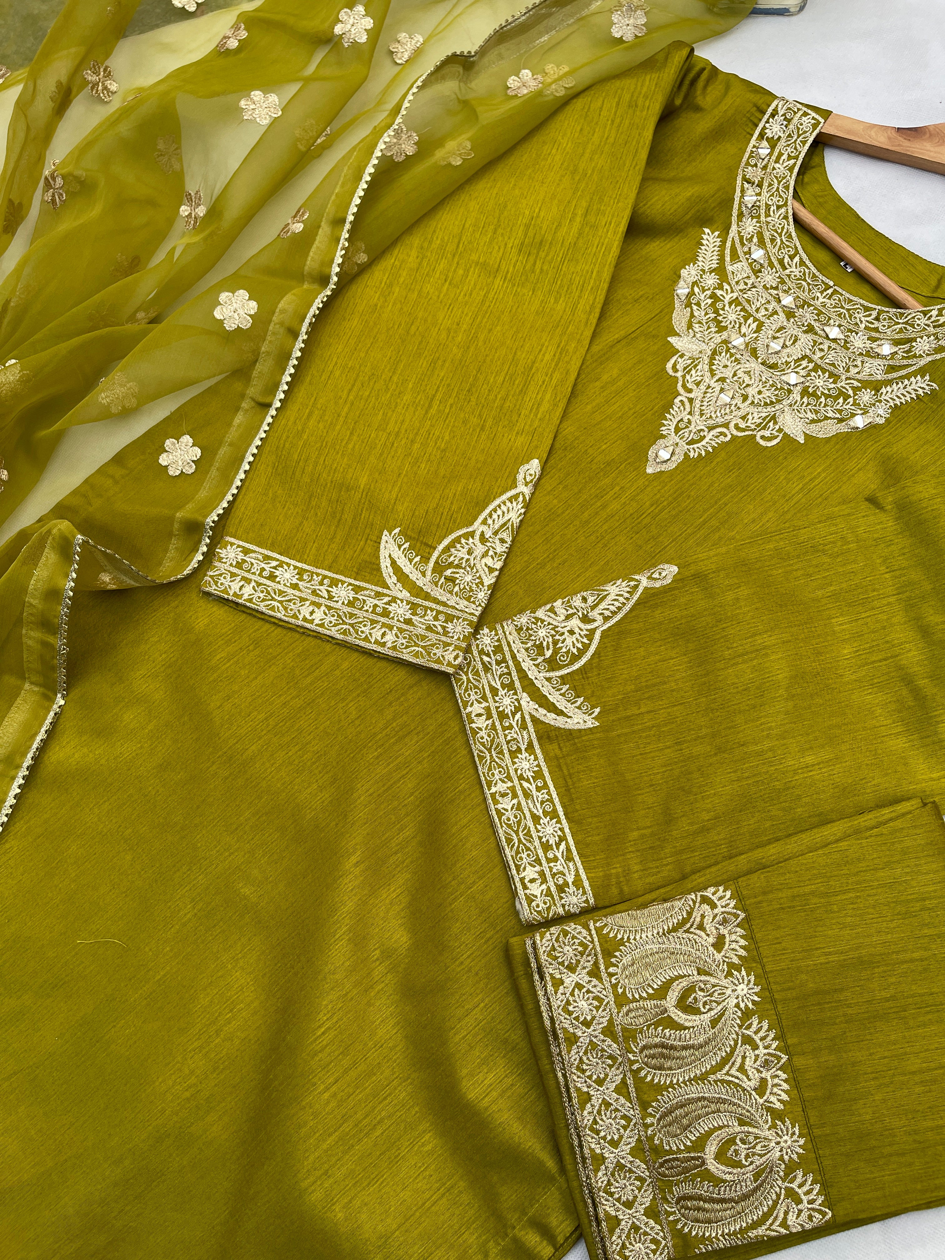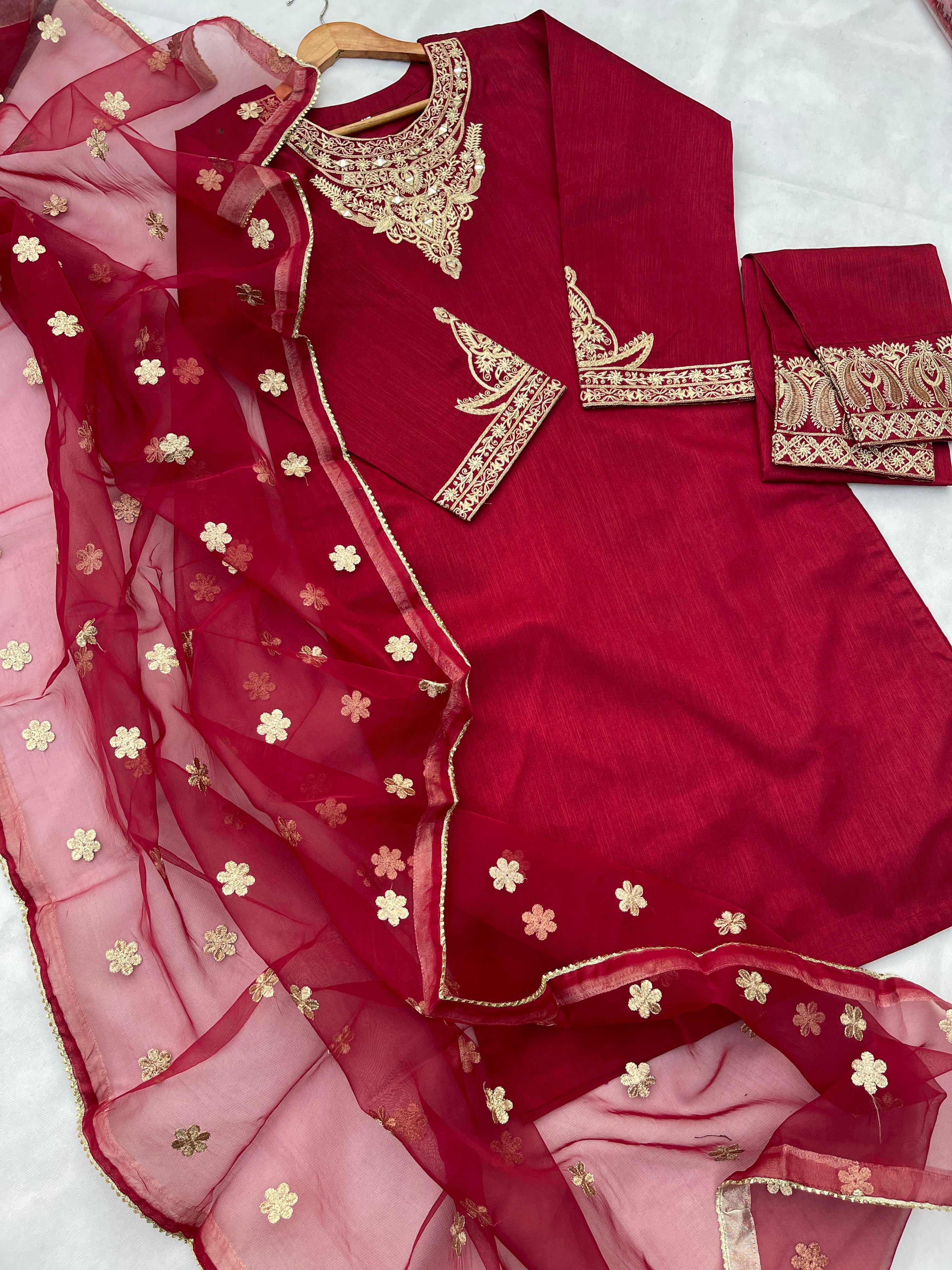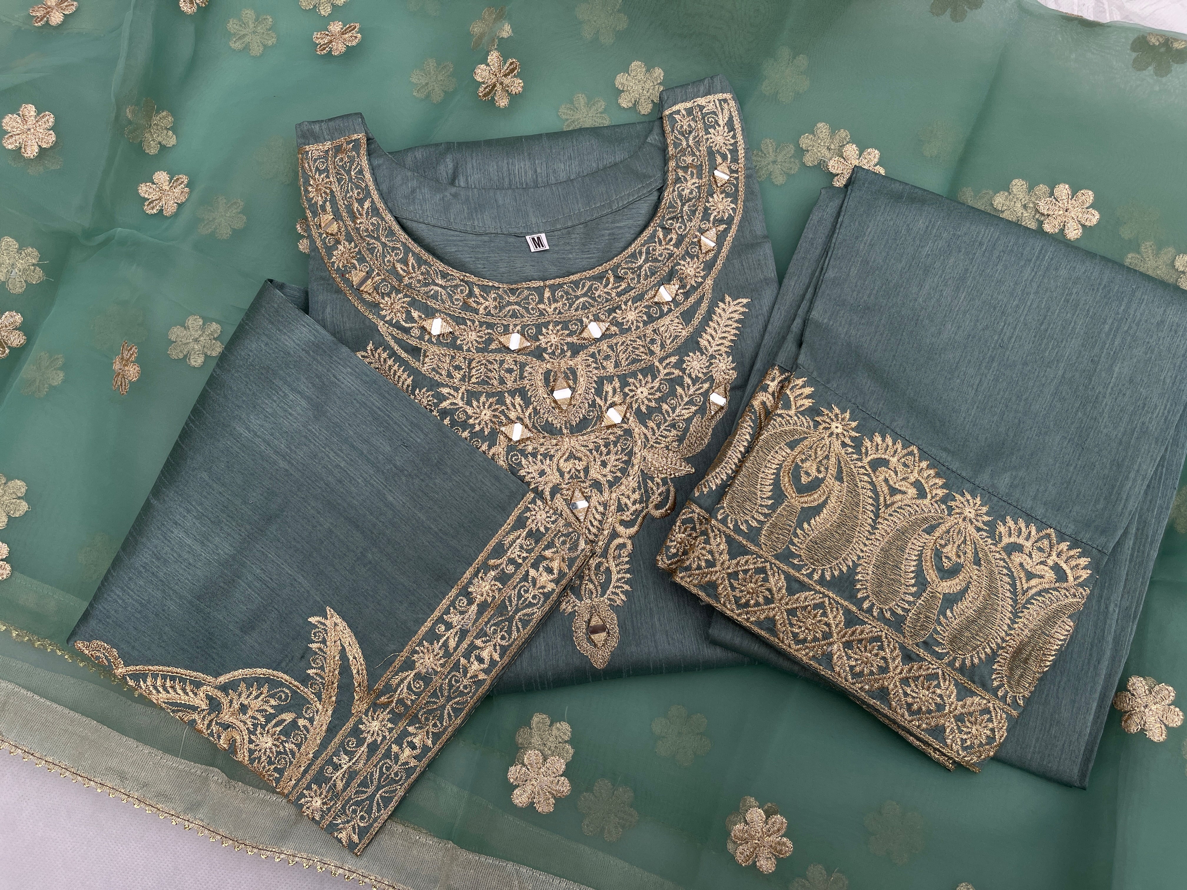 Silk 3pc formal collection showcases a luxurious silk trouser and an elegantly embroidered bottom. The mirror and thread embroidery on the neckline adds a touch of sophistication, while the organza dupatta complements the shirt length of 42-43 inches. Elevate your formal attire with this exquisite collection.