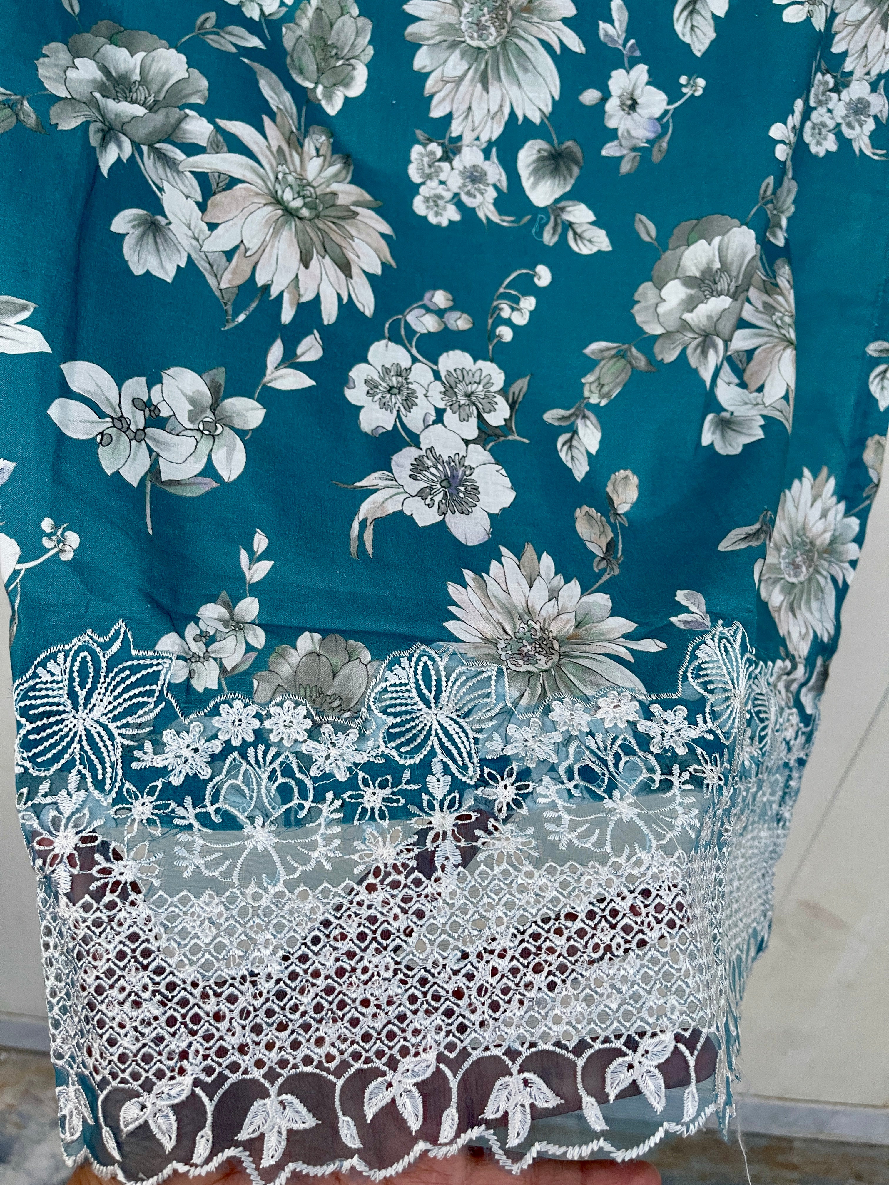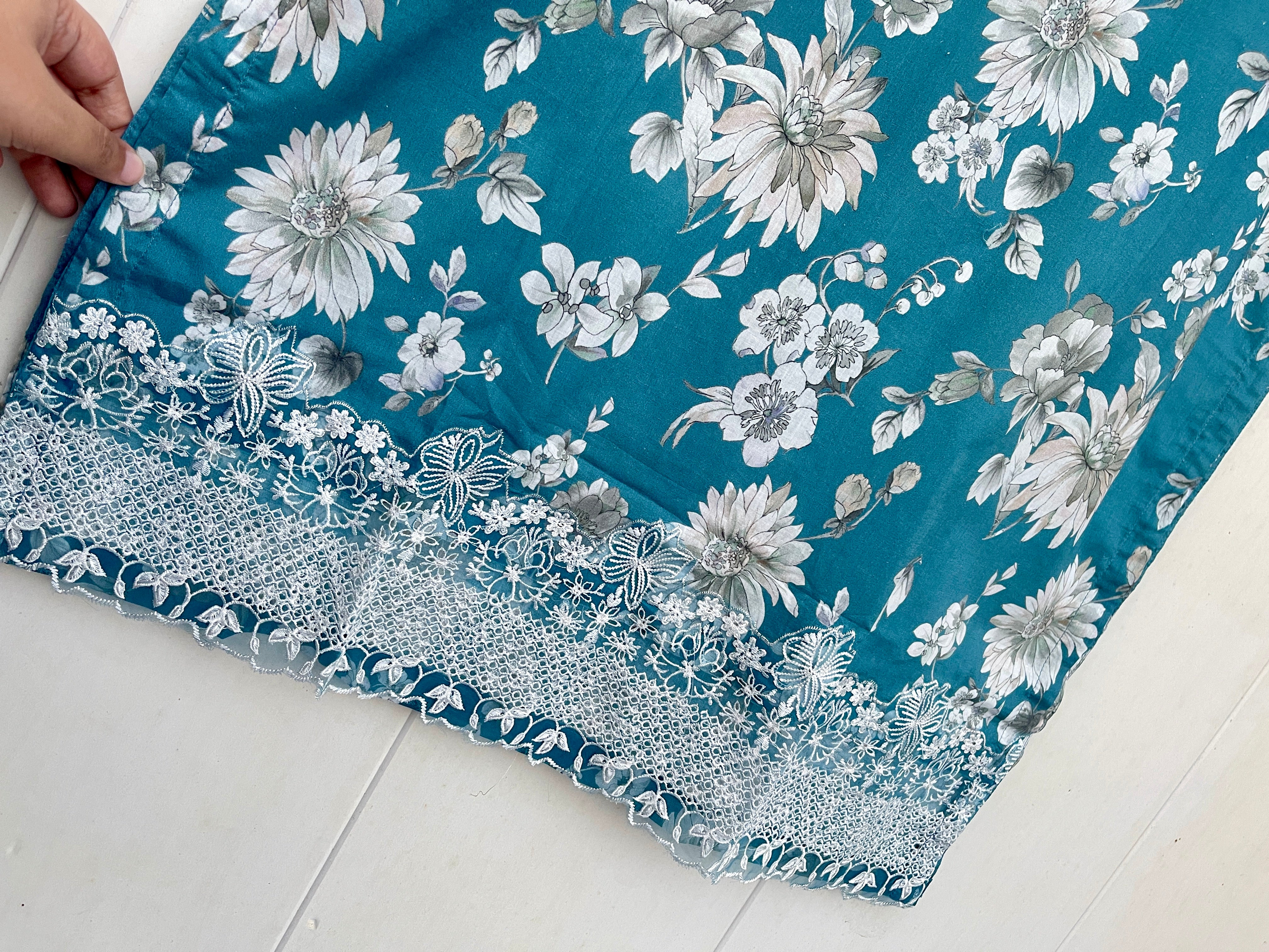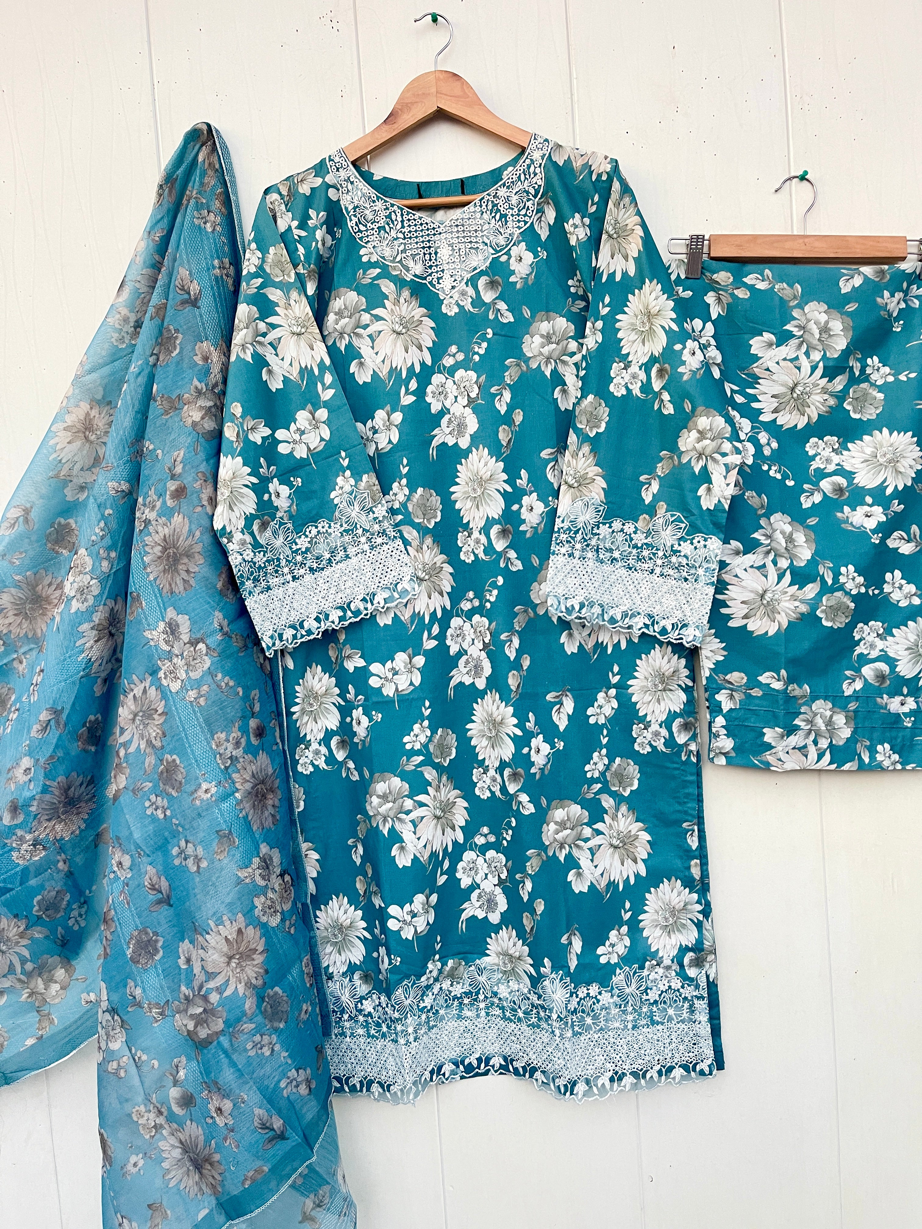 The ZALAY LAWN 3PC COLLECTION features a pure lawn dress with a floral printed shirt and neckline embroidered sleeves. The dress measures 44-45 inches in length and is accompanied by a bell bottom trouser. The tailor-stitched, overlocked garment is made with high-quality materials and includes a Monday lawn printed dupta. Enjoy the elegant design and unique Zinc color of this timeless piece.