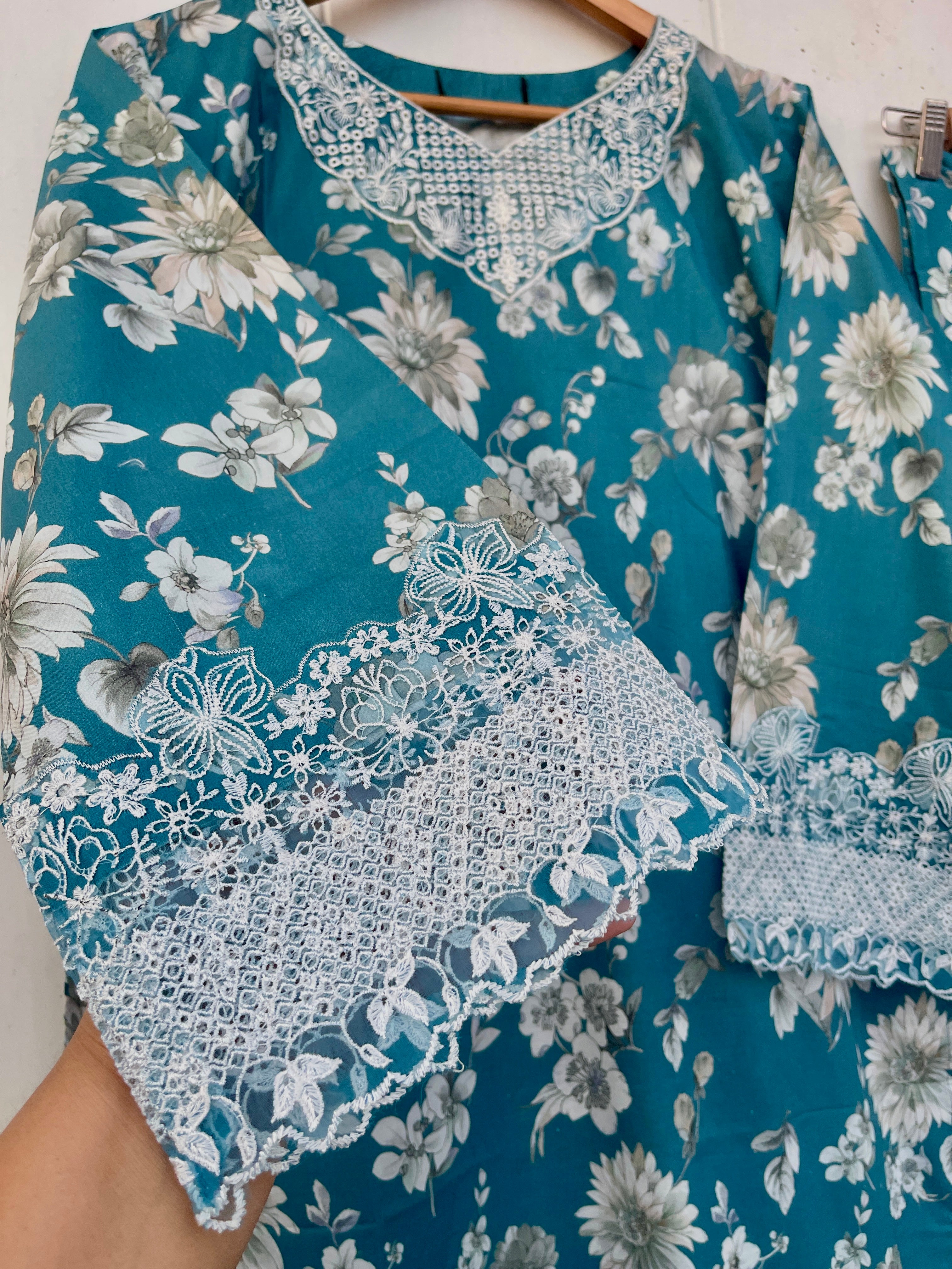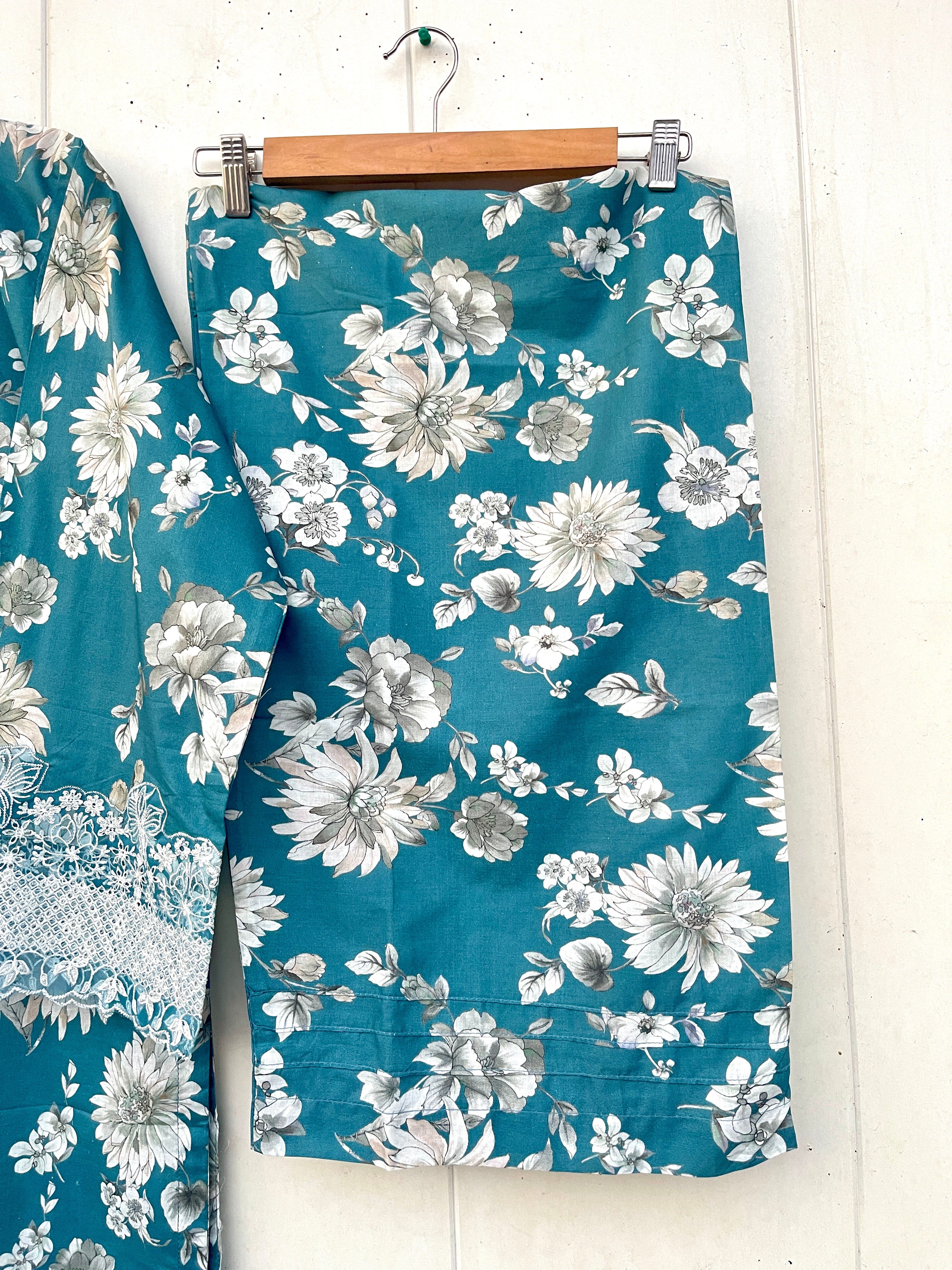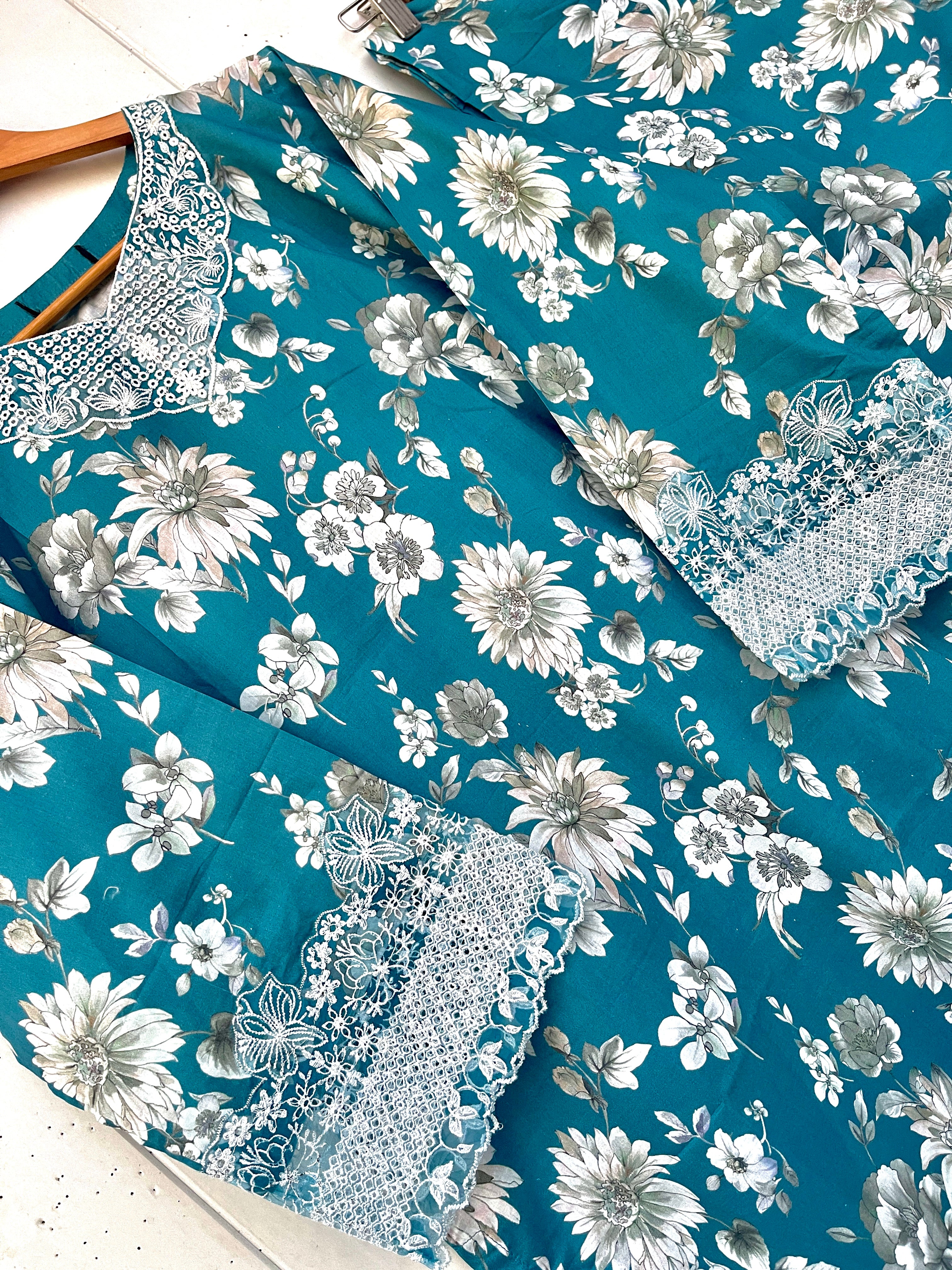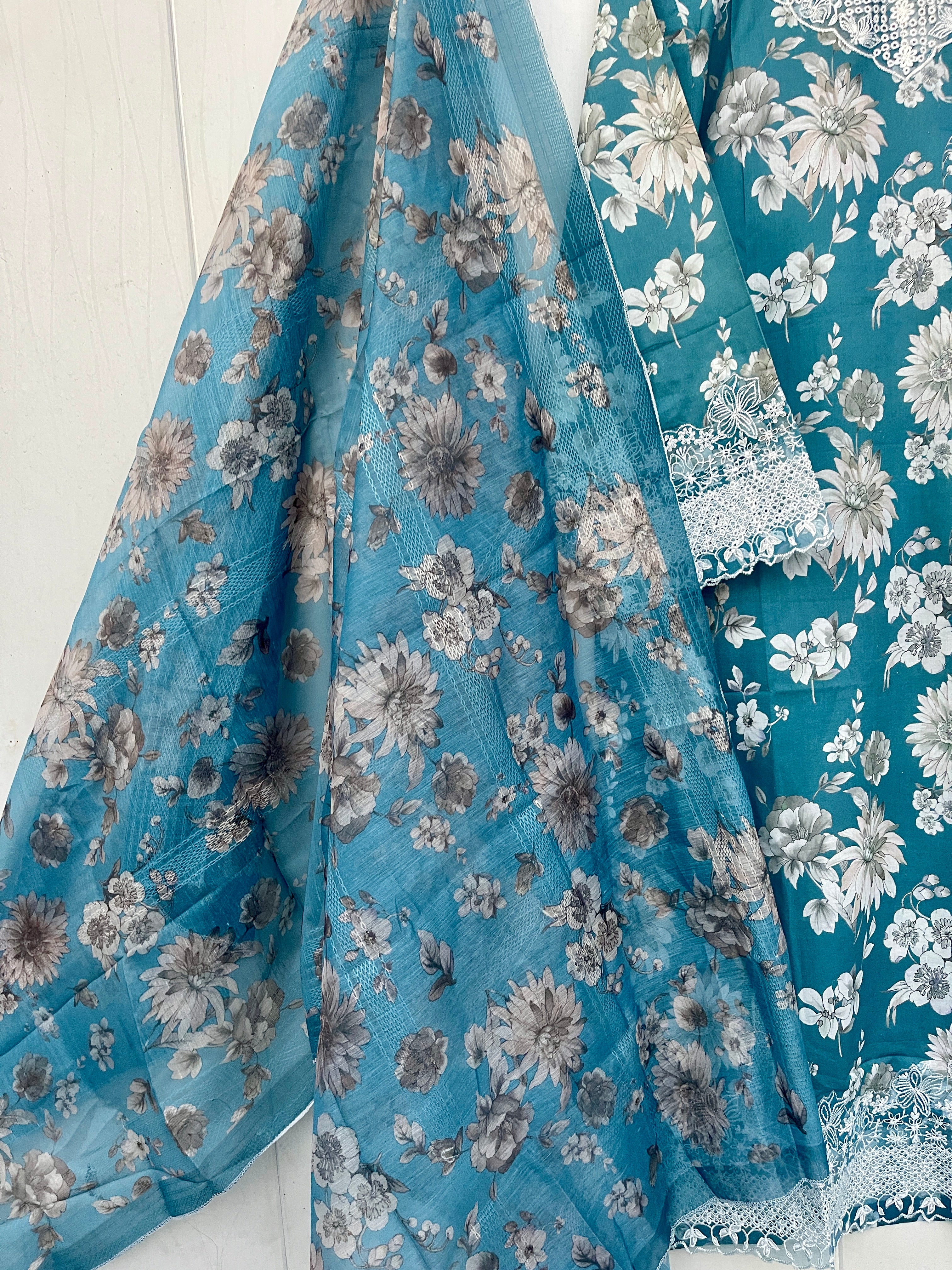 The ZALAY LAWN 3PC COLLECTION features a pure lawn dress with a floral printed shirt and neckline embroidered sleeves. The dress measures 44-45 inches in length and is accompanied by a bell bottom trouser. The tailor-stitched, overlocked garment is made with high-quality materials and includes a Monday lawn printed dupta. Enjoy the elegant design and unique Zinc color of this timeless piece.