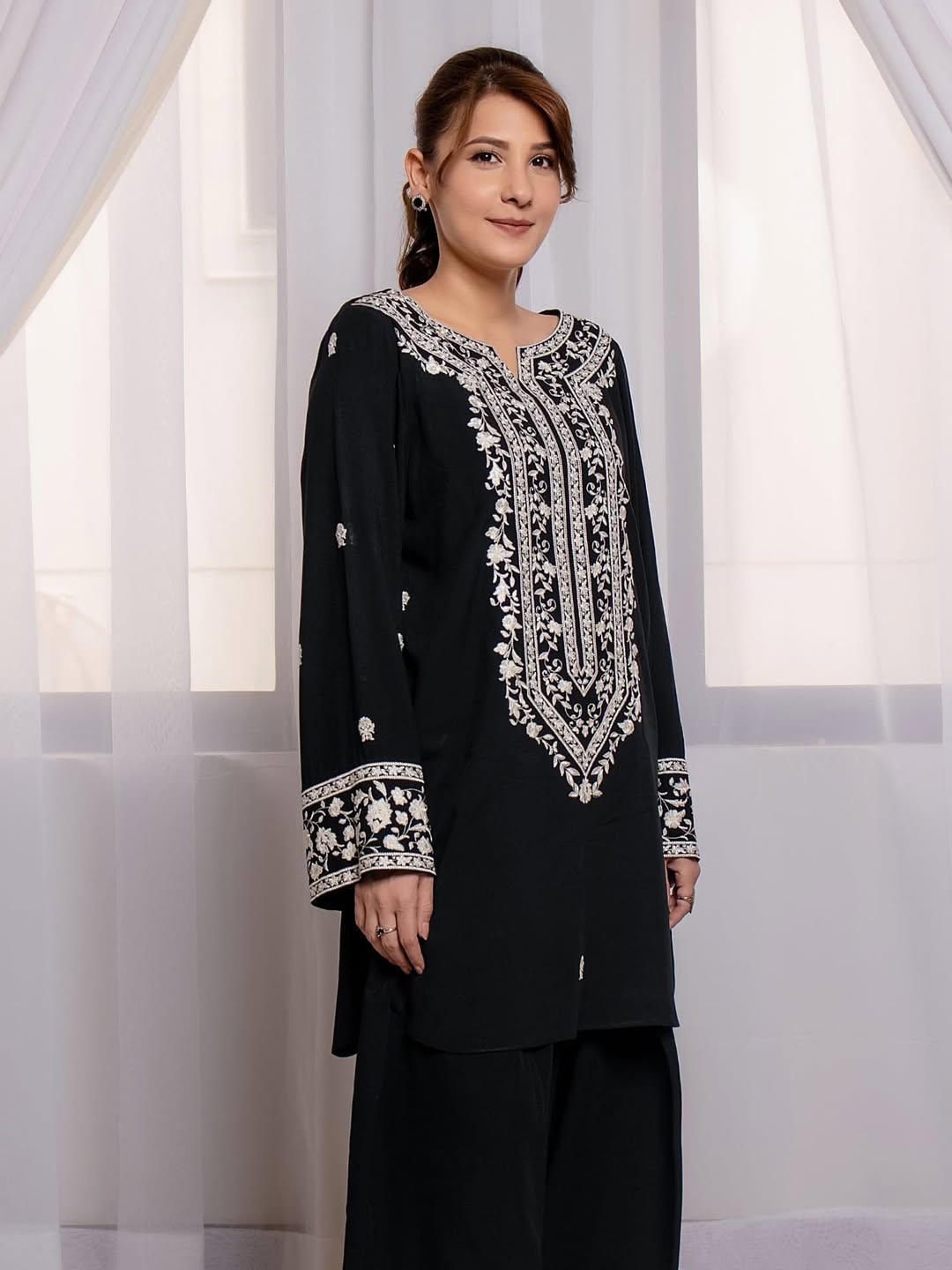 Shirt: 40-inch black embroidered shirt with intricate rust-toned embroidery detailing, adding a regal charm.